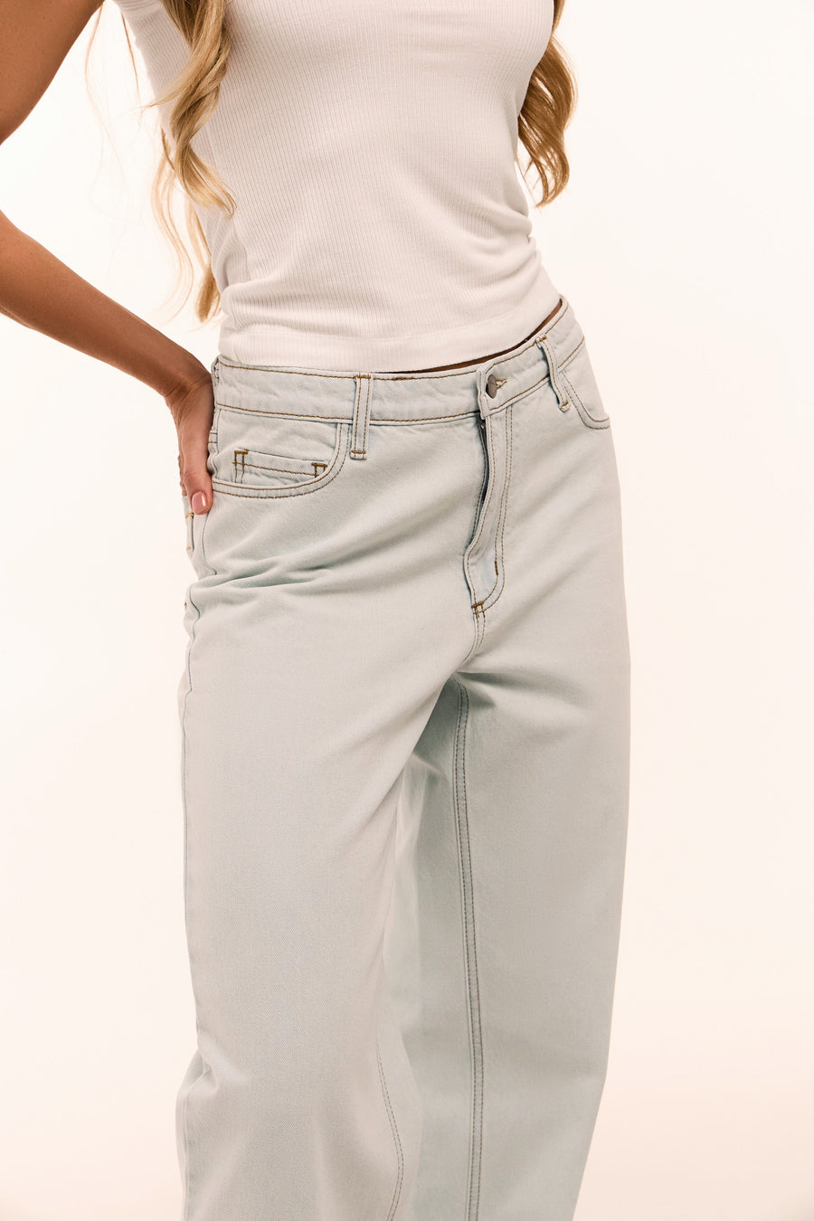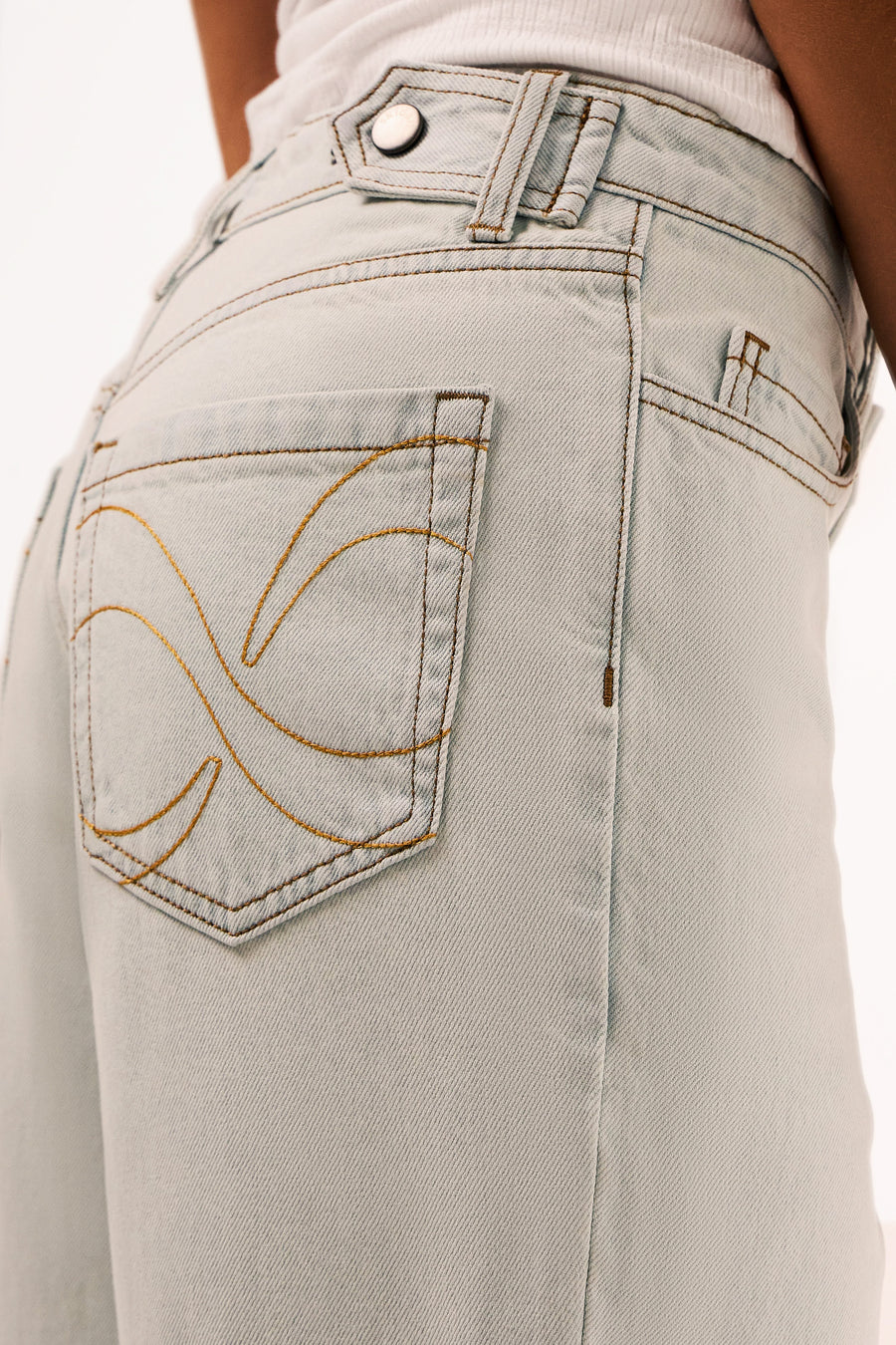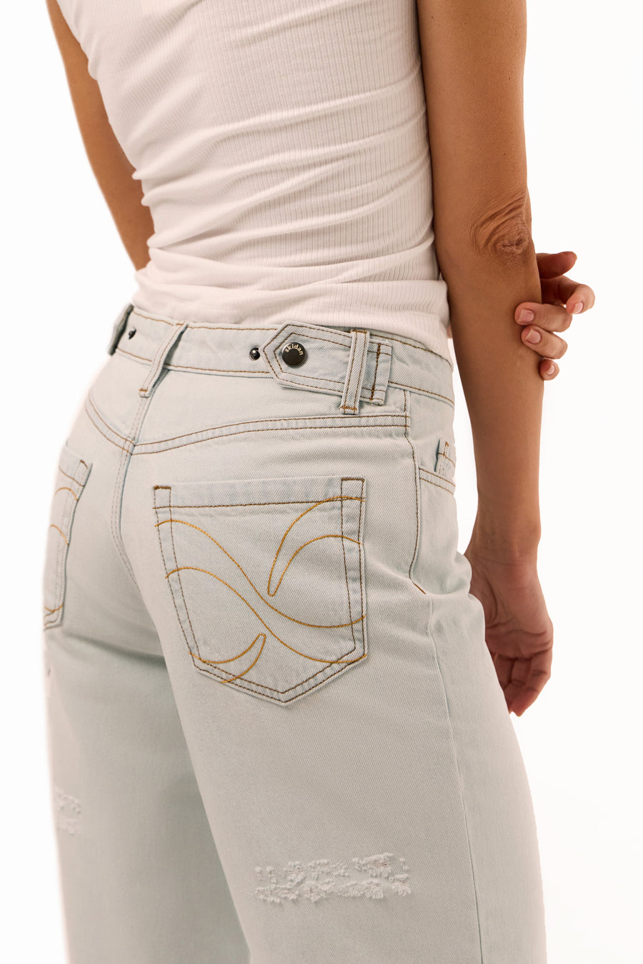 Джинси вільного крою з регульованим поясом та фірмовим знаком нескінченності на задніх кишенях. Трендові потертості ззаду створюють стильний акцент.