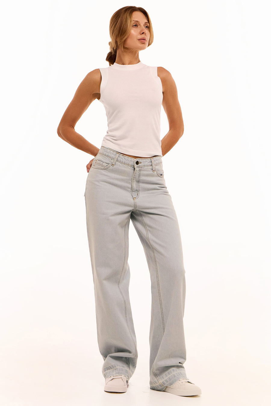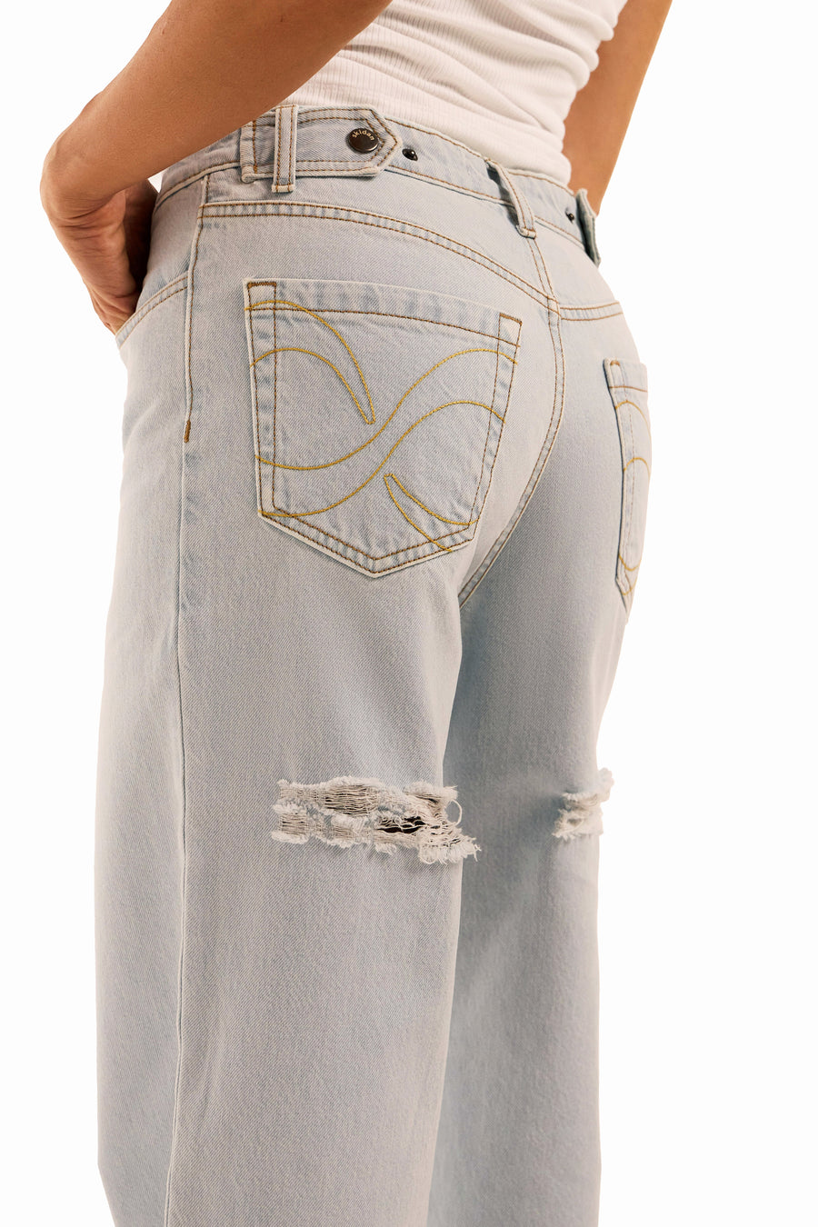 Джинси вільного крою з регульованим поясом та фірмовим знаком нескінченності на задніх кишенях. Мають стильні горизонтальні розрізи ззаду з ефектом потертості.