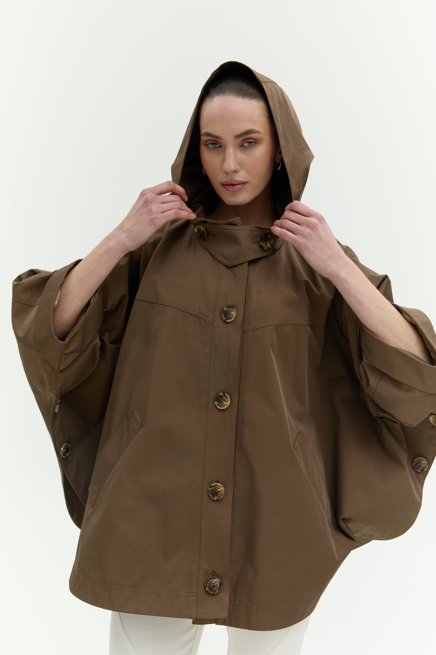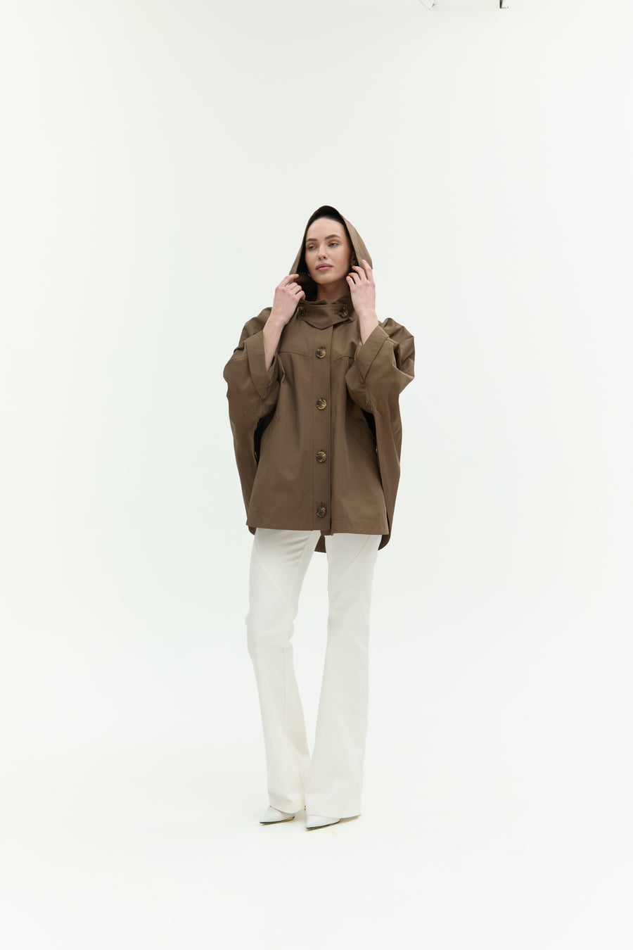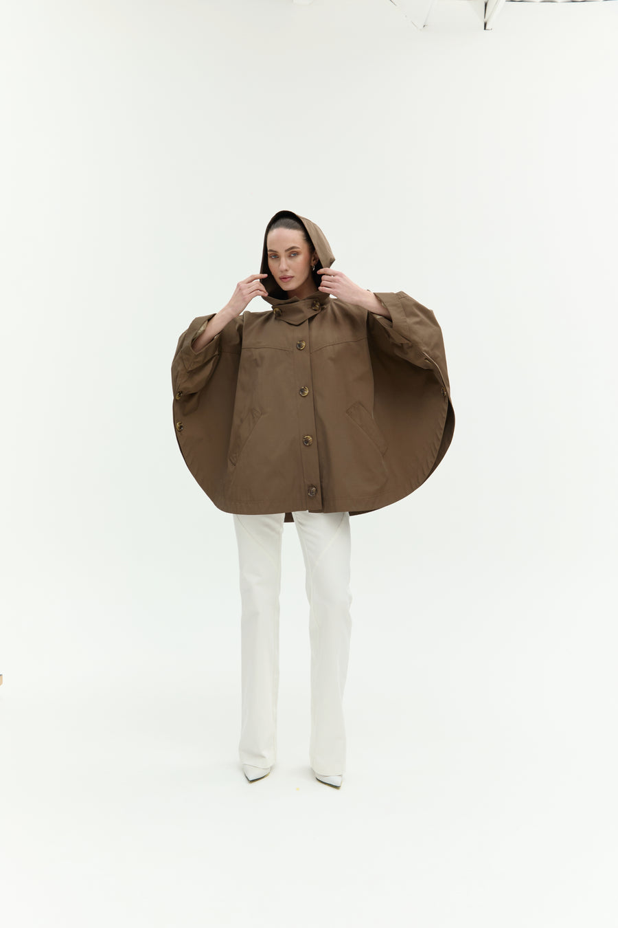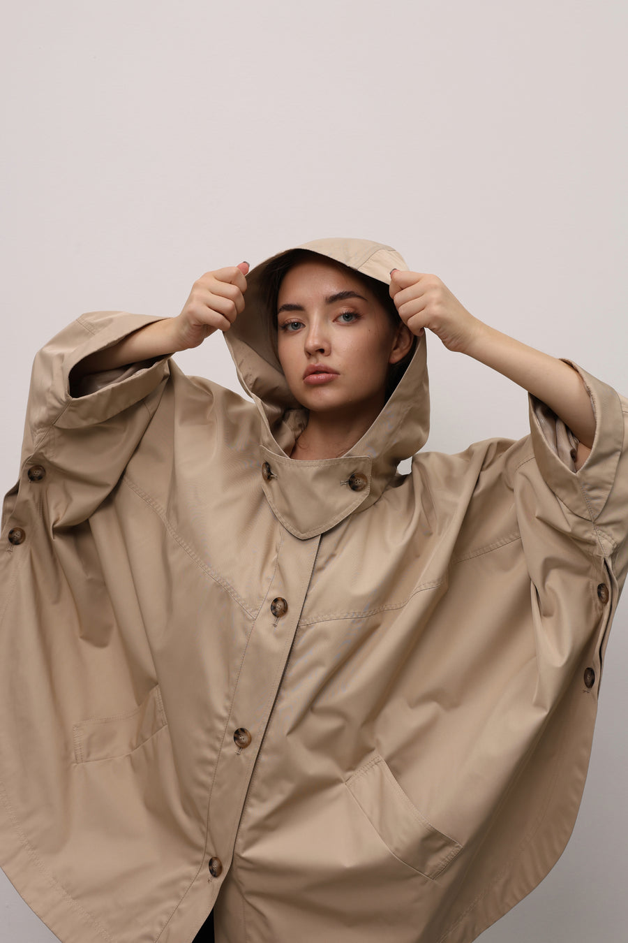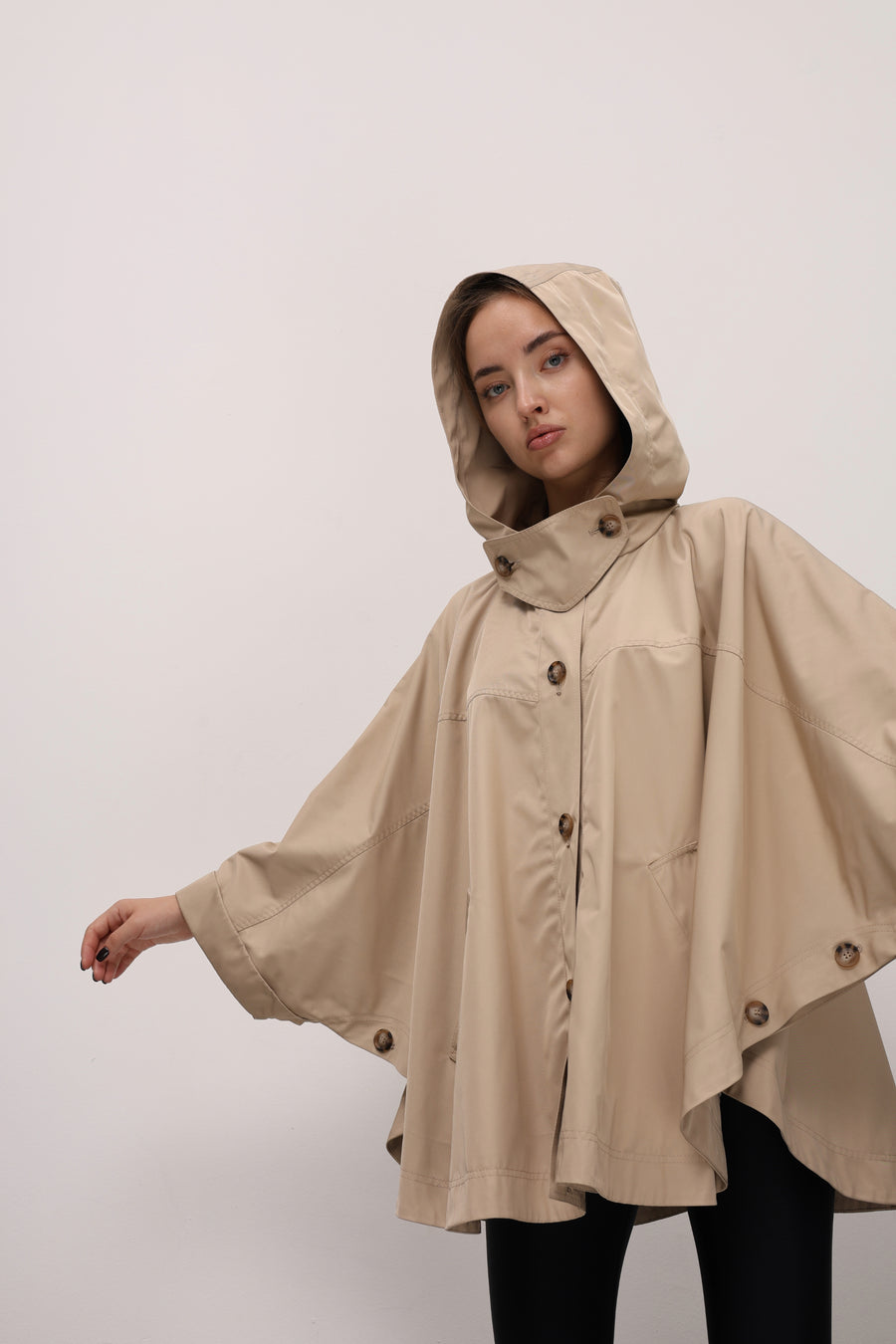Стильний кейп з капюшоном - ідеальний верхній одяг для тих, хто прагне поєднати комфорт і сучасний дизайн у повсякденному стилі. Вільна форма забезпечує легкість рухів, а акцентні ґудзики додають вишуканого характеру.