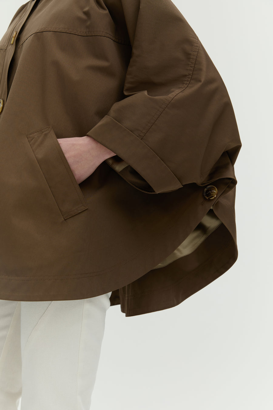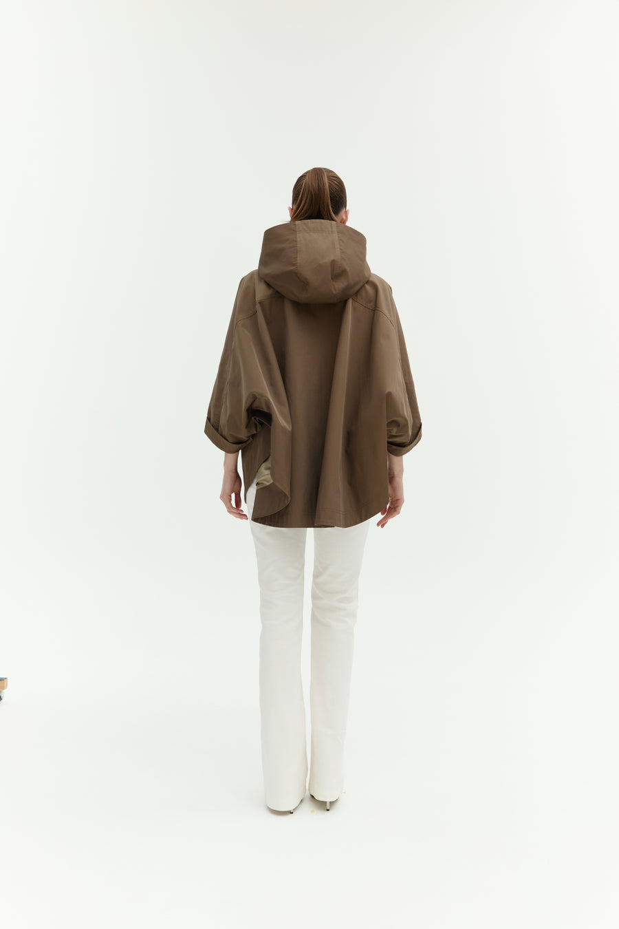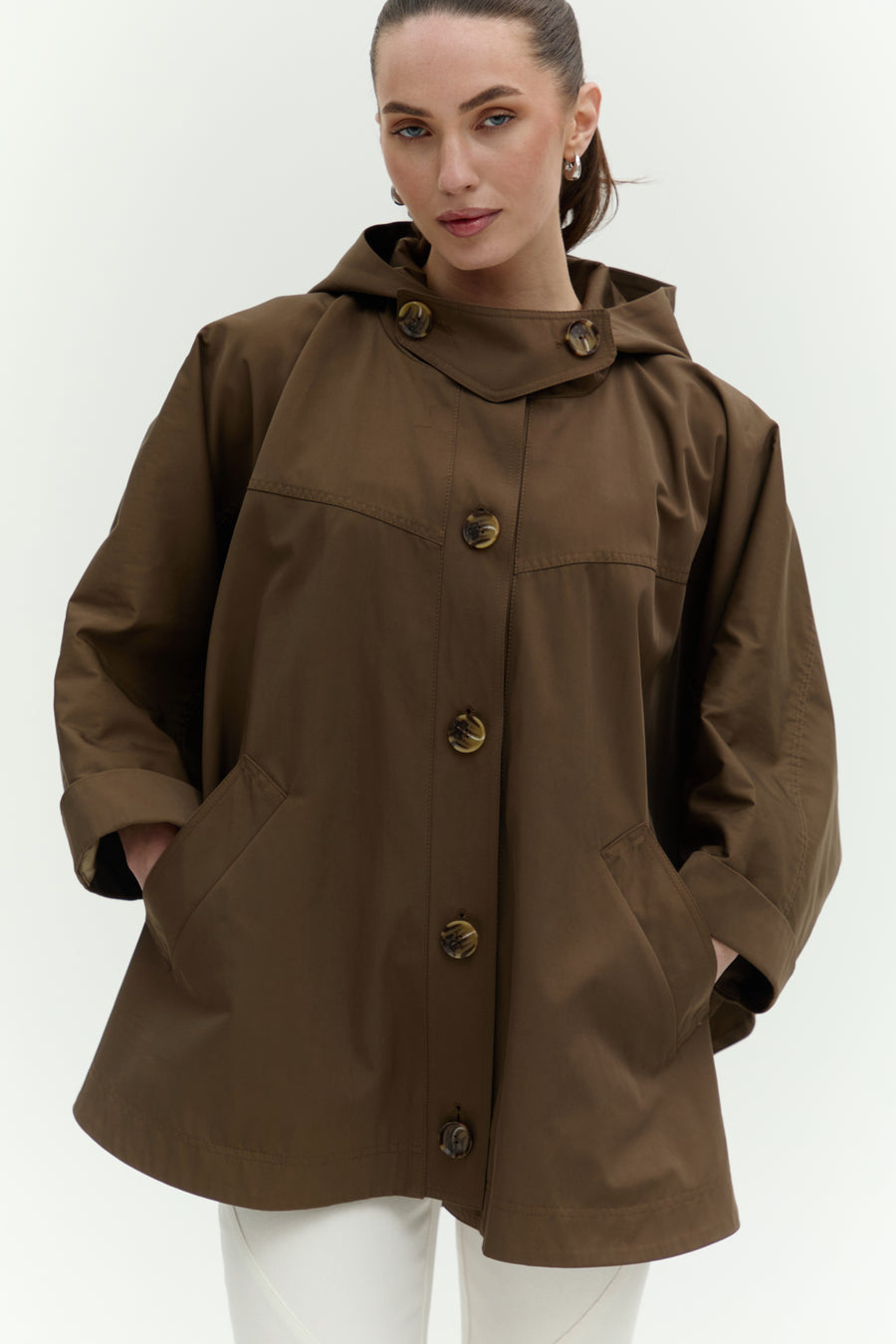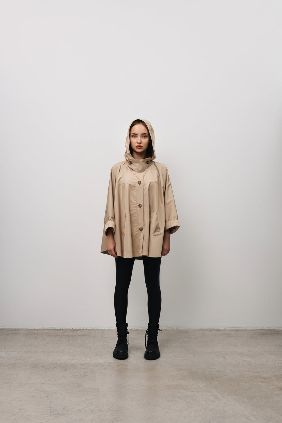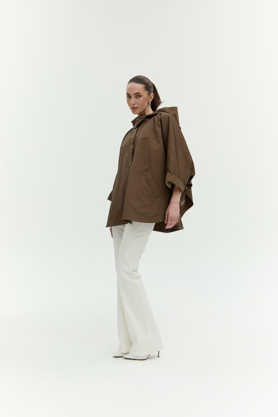 Стильний кейп з капюшоном - ідеальний верхній одяг для тих, хто прагне поєднати комфорт і сучасний дизайн у повсякденному стилі. Вільна форма забезпечує легкість рухів, а акцентні ґудзики додають вишуканого характеру.