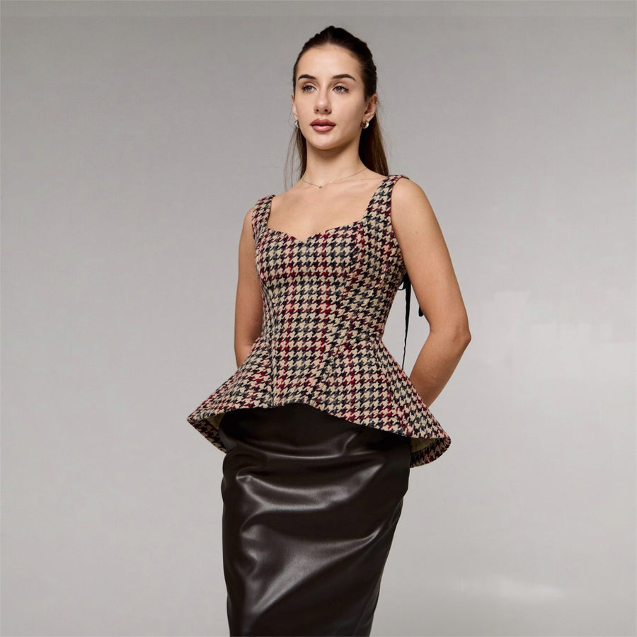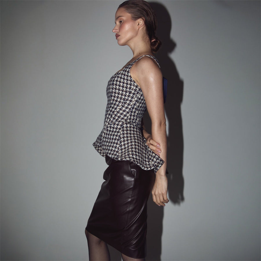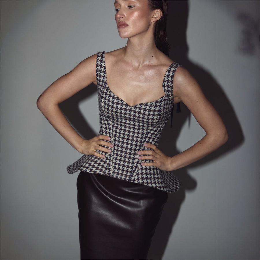 Корсет виконаний у чистій, архітектурній манері: рельєфи точно повторюють анатомію фігури, формуючи зібраний, витончений силует. Вертикальна конструкція додає стрункості, а лаконічна лінія декольте додає м'якої жіночності та витонченості.