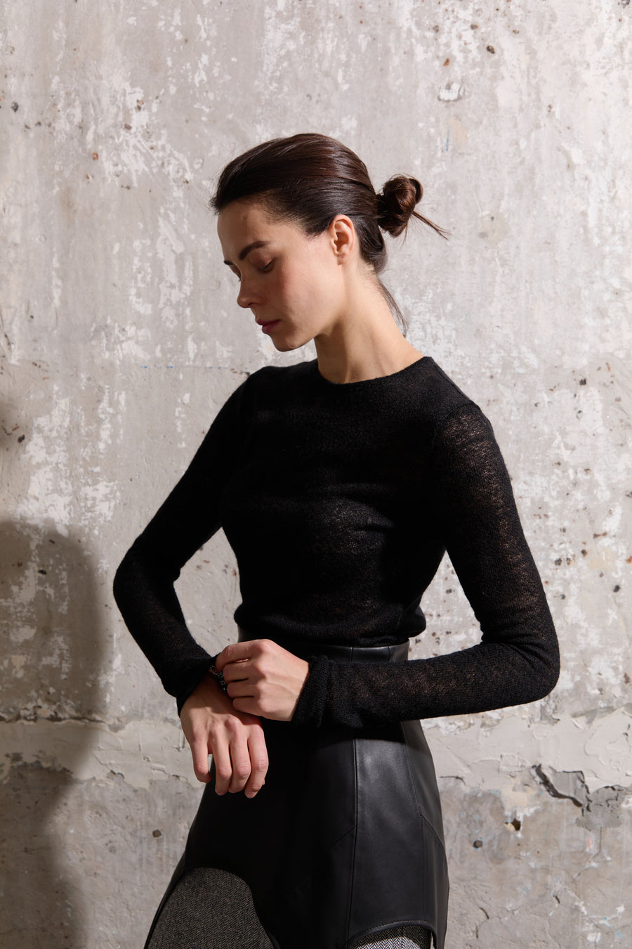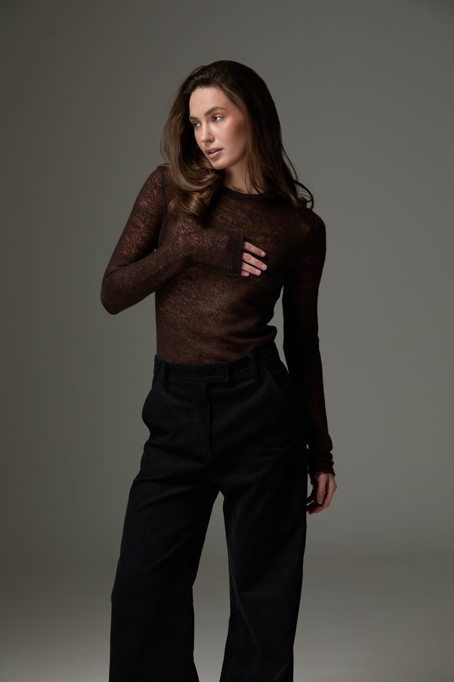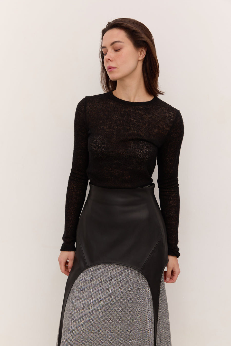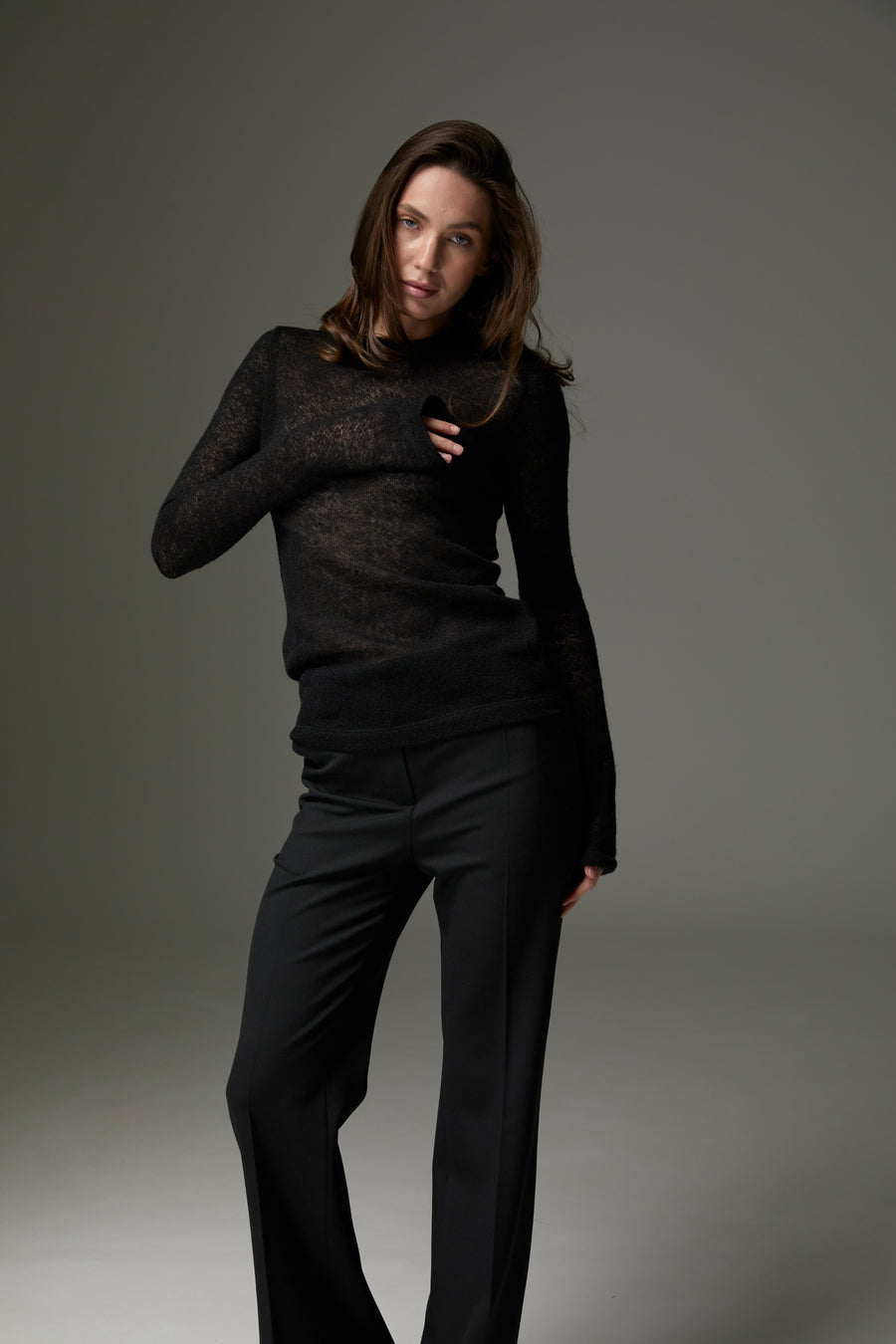 Легкий та теплий лонгслів зі змішаного мохеру та вовни поєднує ніжну текстуру та комфорт. Напівпрозорий дизайн додає образу легкості та шарму, роблячи його ідеальним для холодної пори року