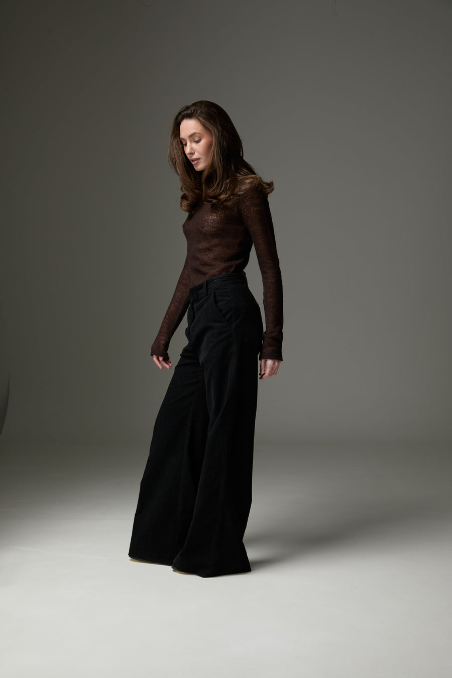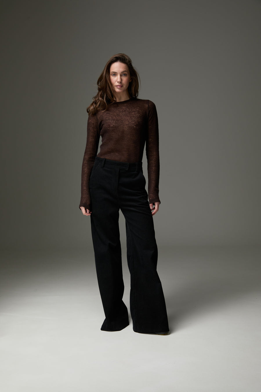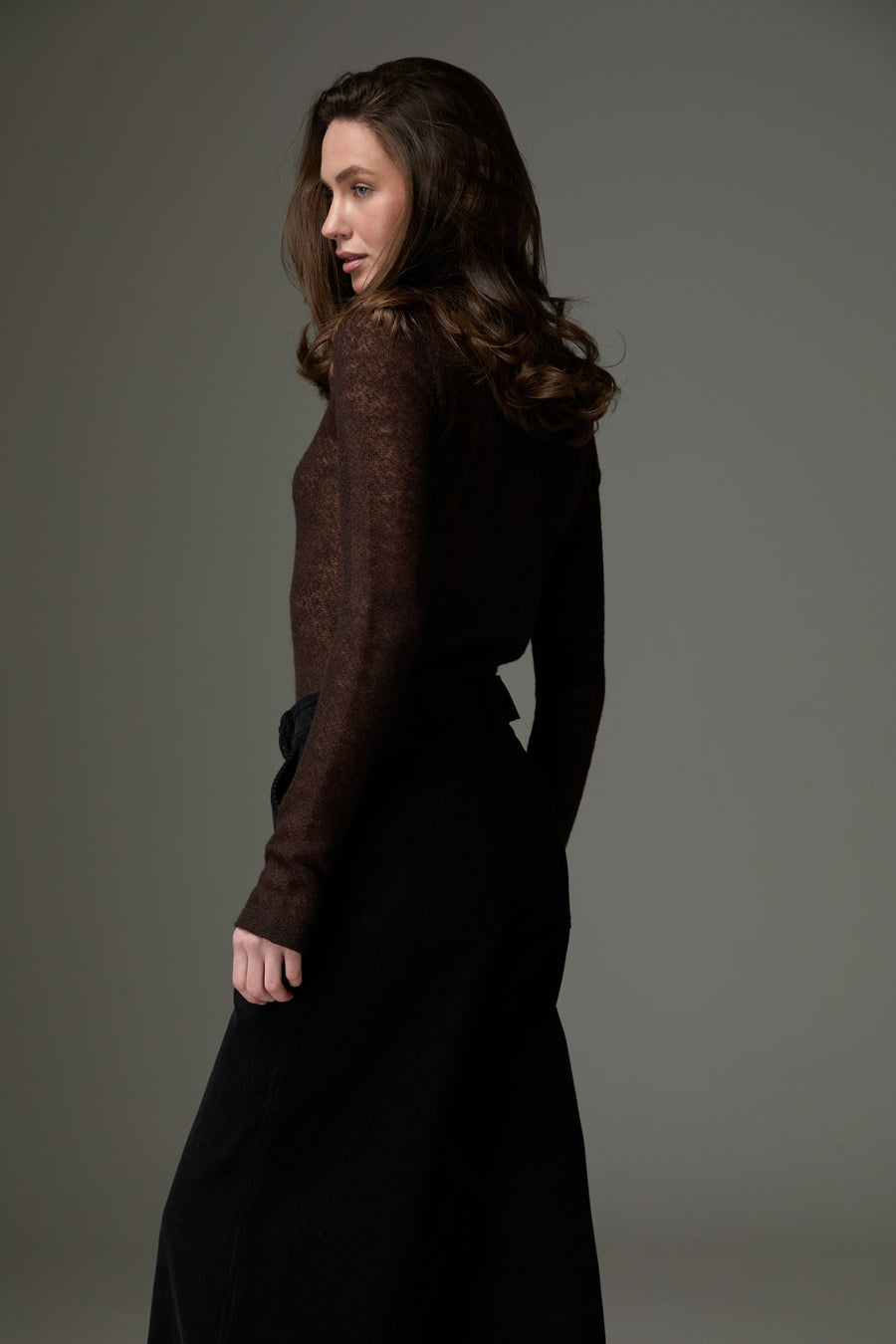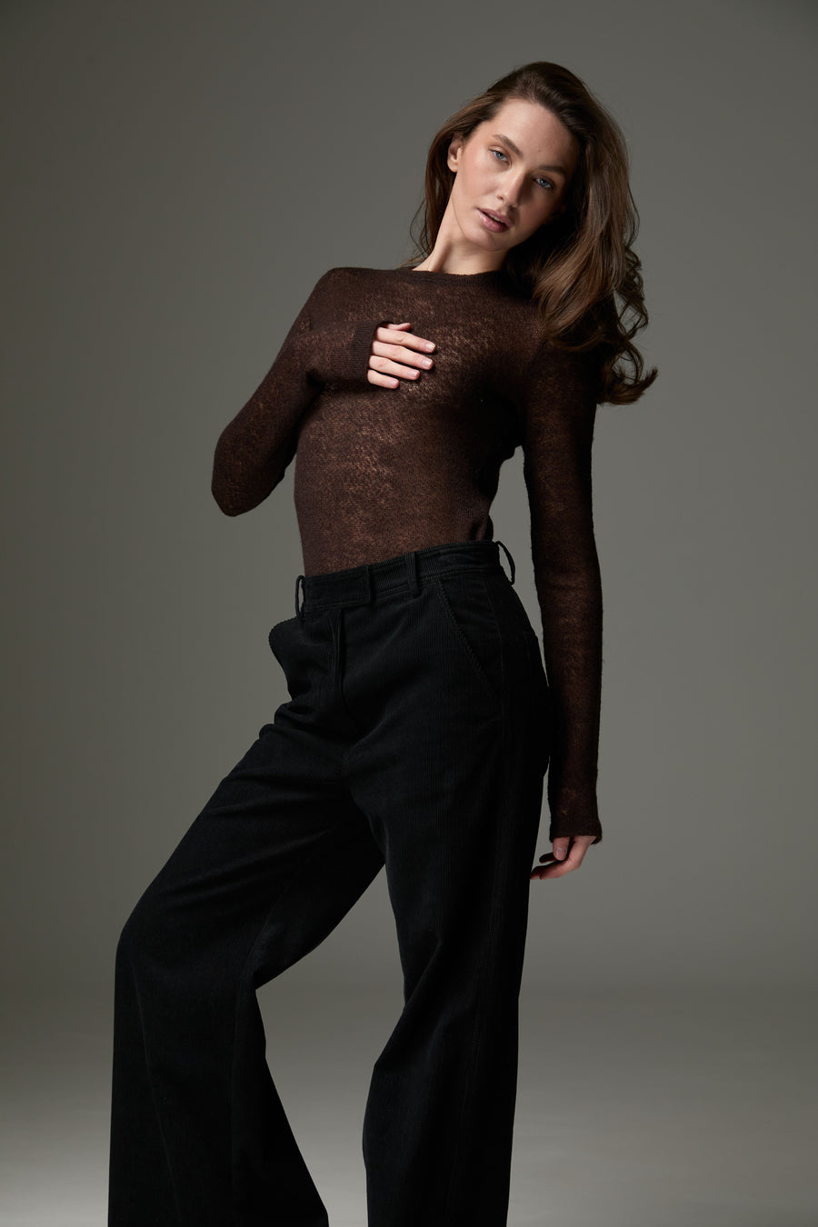 Легкий та теплий лонгслів зі змішаного мохеру та вовни поєднує ніжну текстуру та комфорт. Напівпрозорий дизайн додає образу легкості та шарму, роблячи його ідеальним для холодної пори року