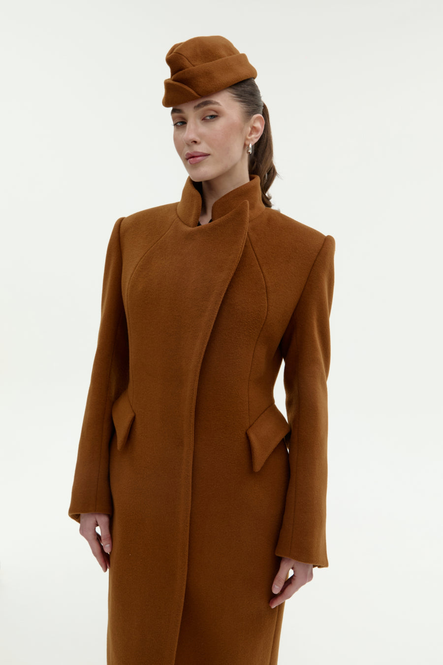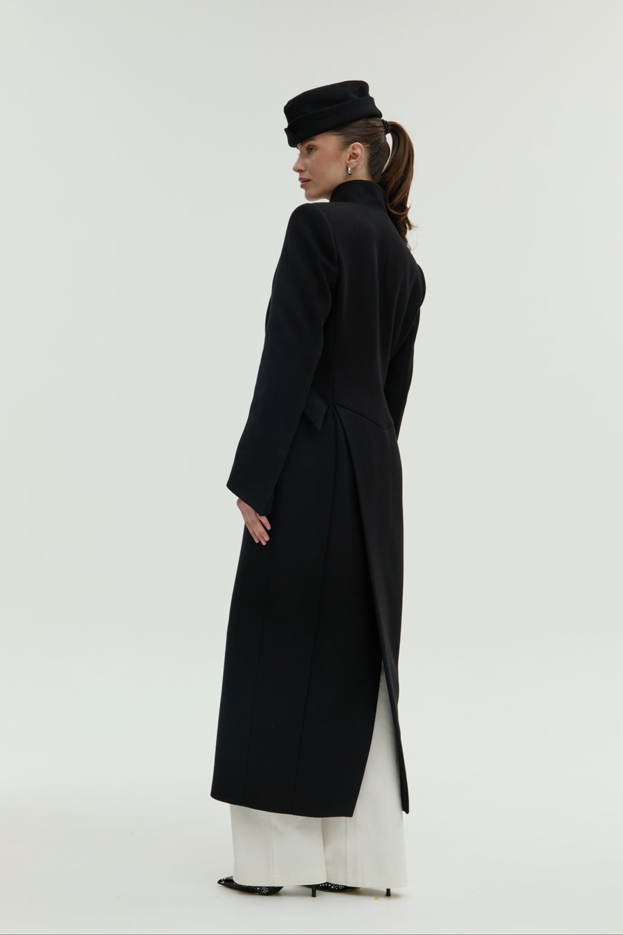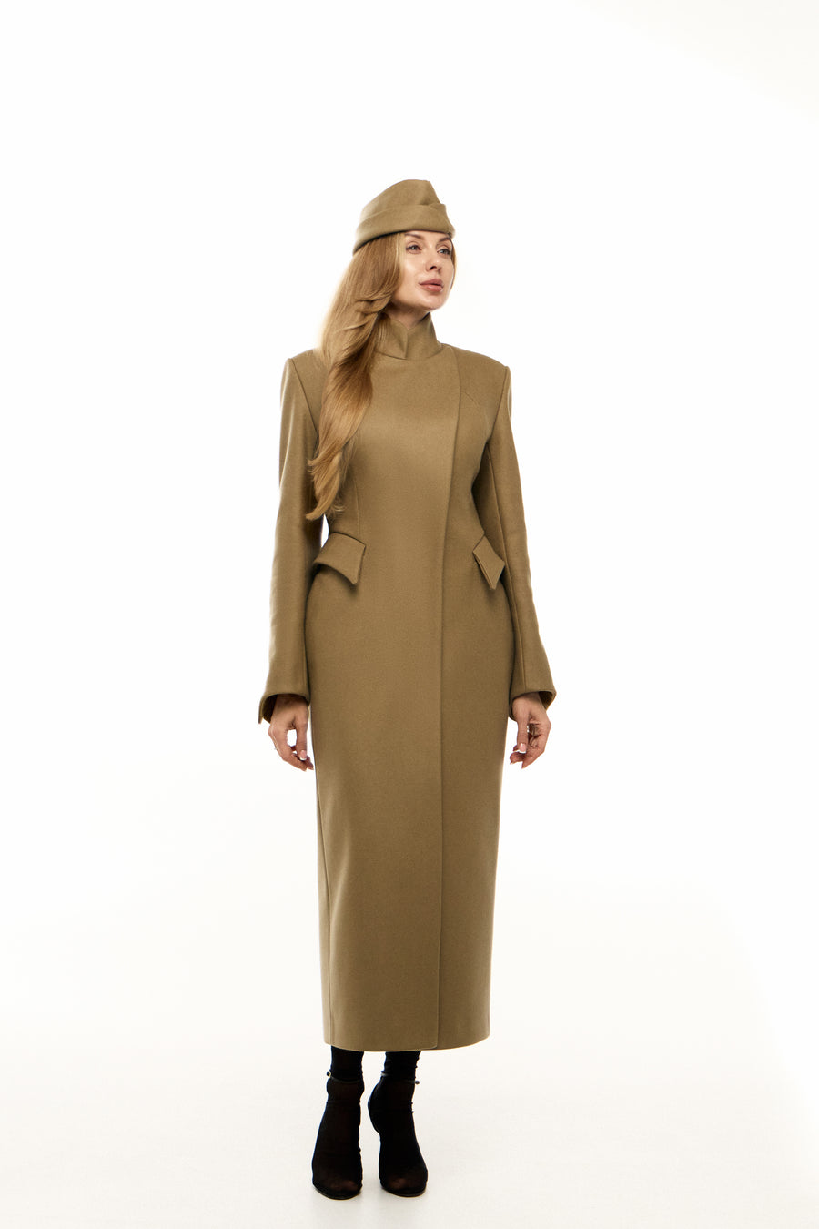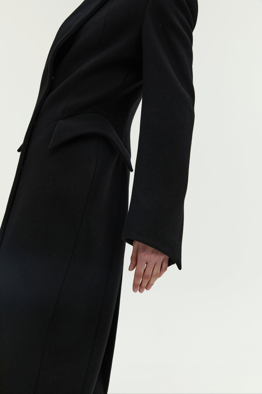 Пальто “5-й елемент” — поєднання архітектурної елегантності та сили лінії. Силует вибудуваний на чистих лініях і збалансованих пропорціях, де кожен елемент підкреслює форму. Високий комір формує графічну вісь образу, а рукав із дизайнерською шлицею додає динаміки та функціональної виразності. Акцентні кишені на талії створюють об’ємну композицію, зберігаючи при цьому лаконічність. Застібка на кнопках завершує дизайн у дусі сучасного мінімалізму.