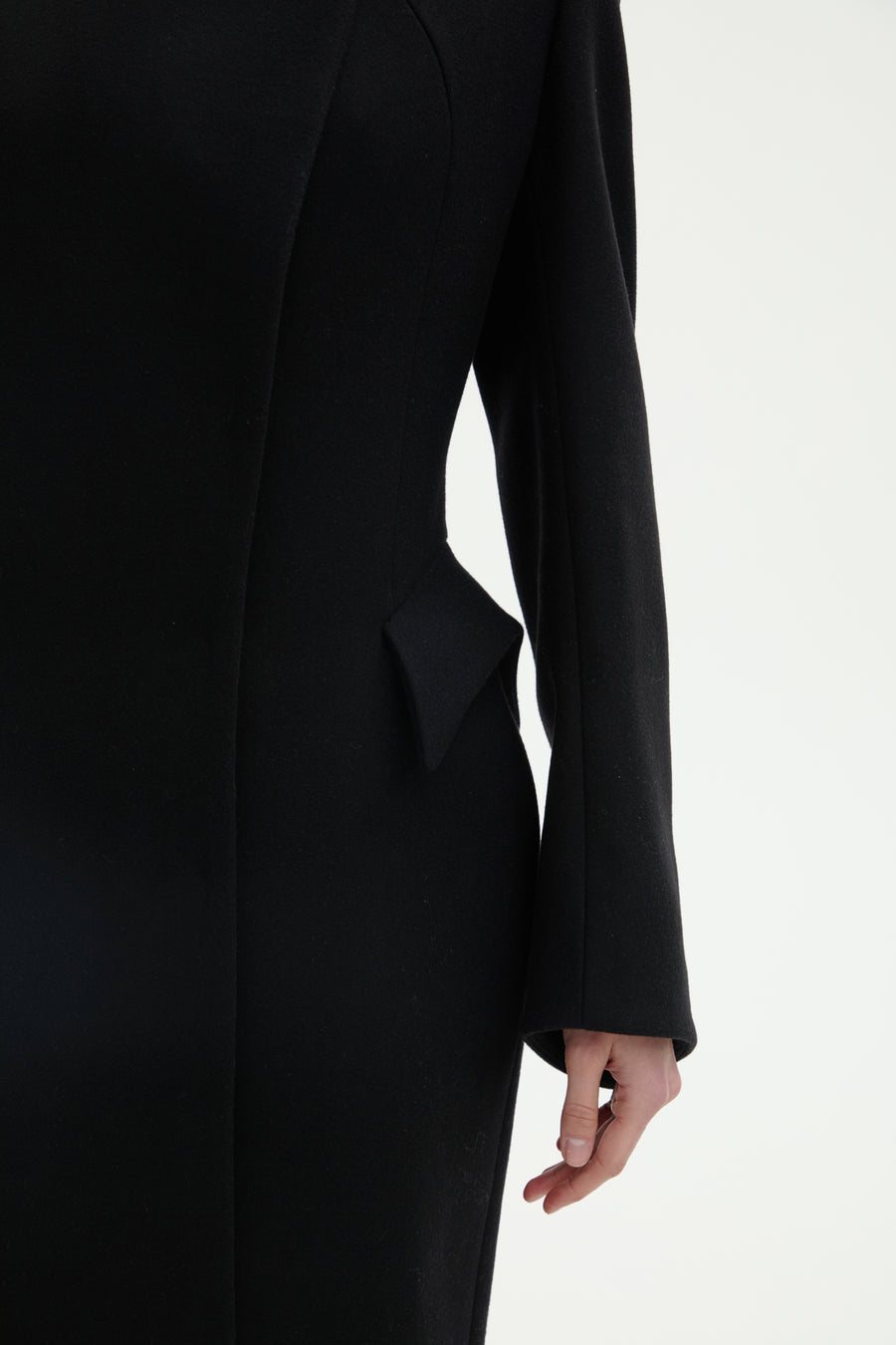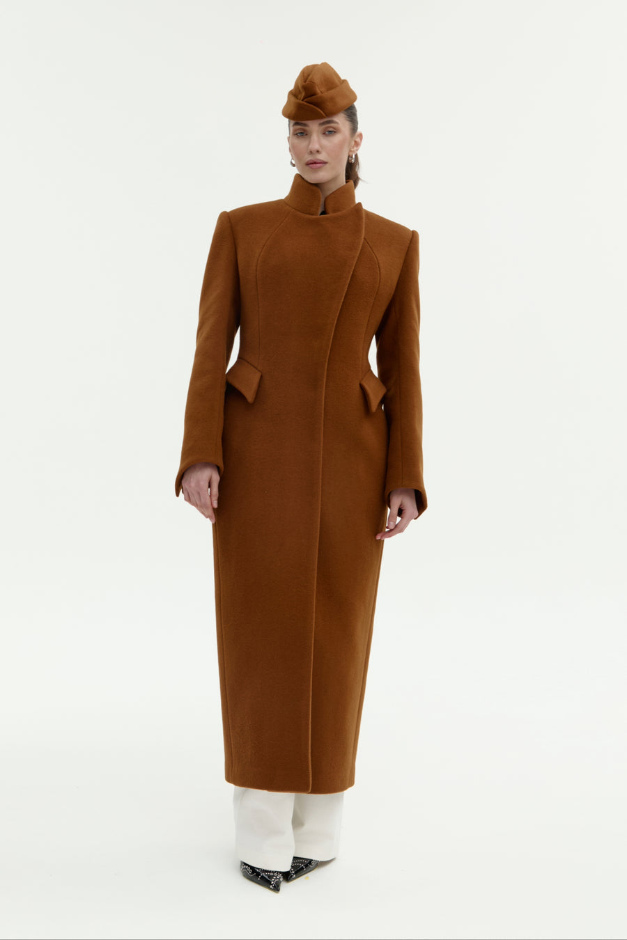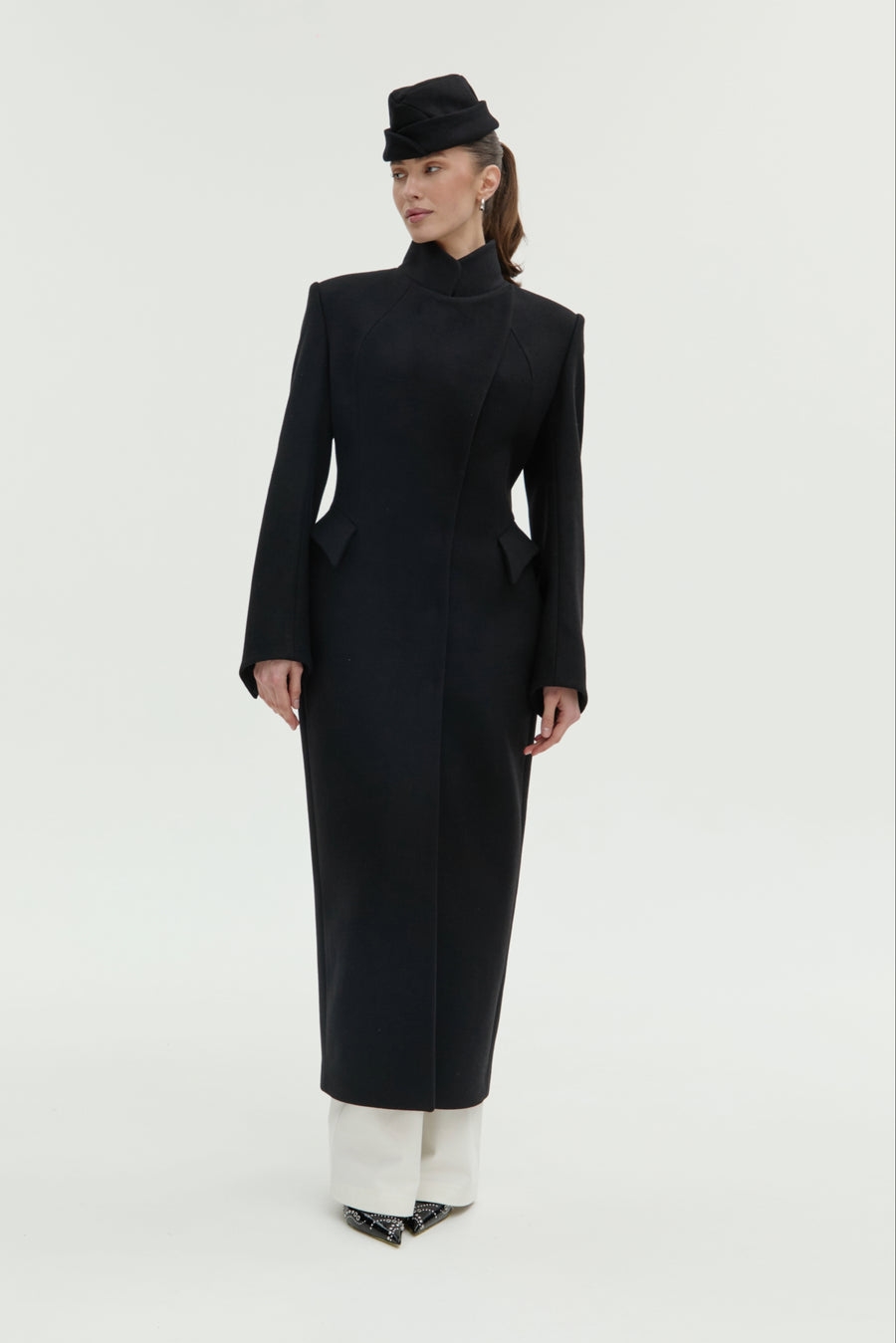 Пальто “5-й елемент” — поєднання архітектурної елегантності та сили лінії. Силует вибудуваний на чистих лініях і збалансованих пропорціях, де кожен елемент підкреслює форму. Високий комір формує графічну вісь образу, а рукав із дизайнерською шлицею додає динаміки та функціональної виразності. Акцентні кишені на талії створюють об’ємну композицію, зберігаючи при цьому лаконічність. Застібка на кнопках завершує дизайн у дусі сучасного мінімалізму.