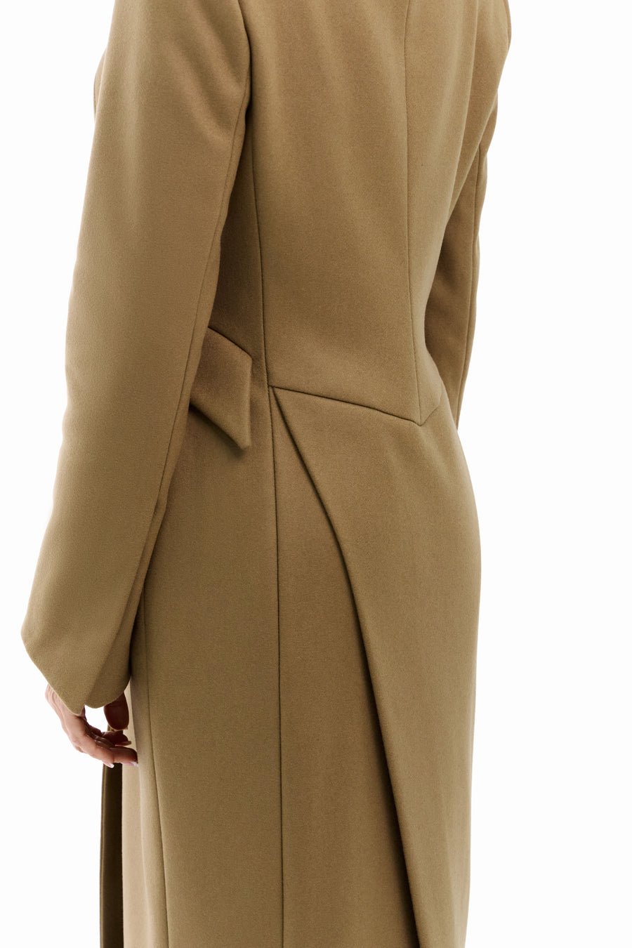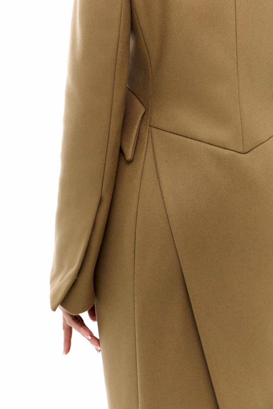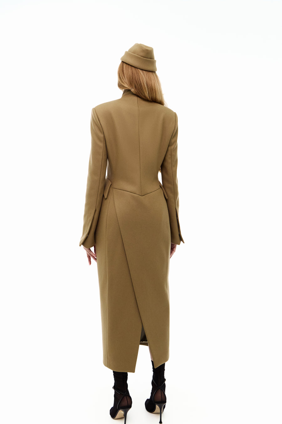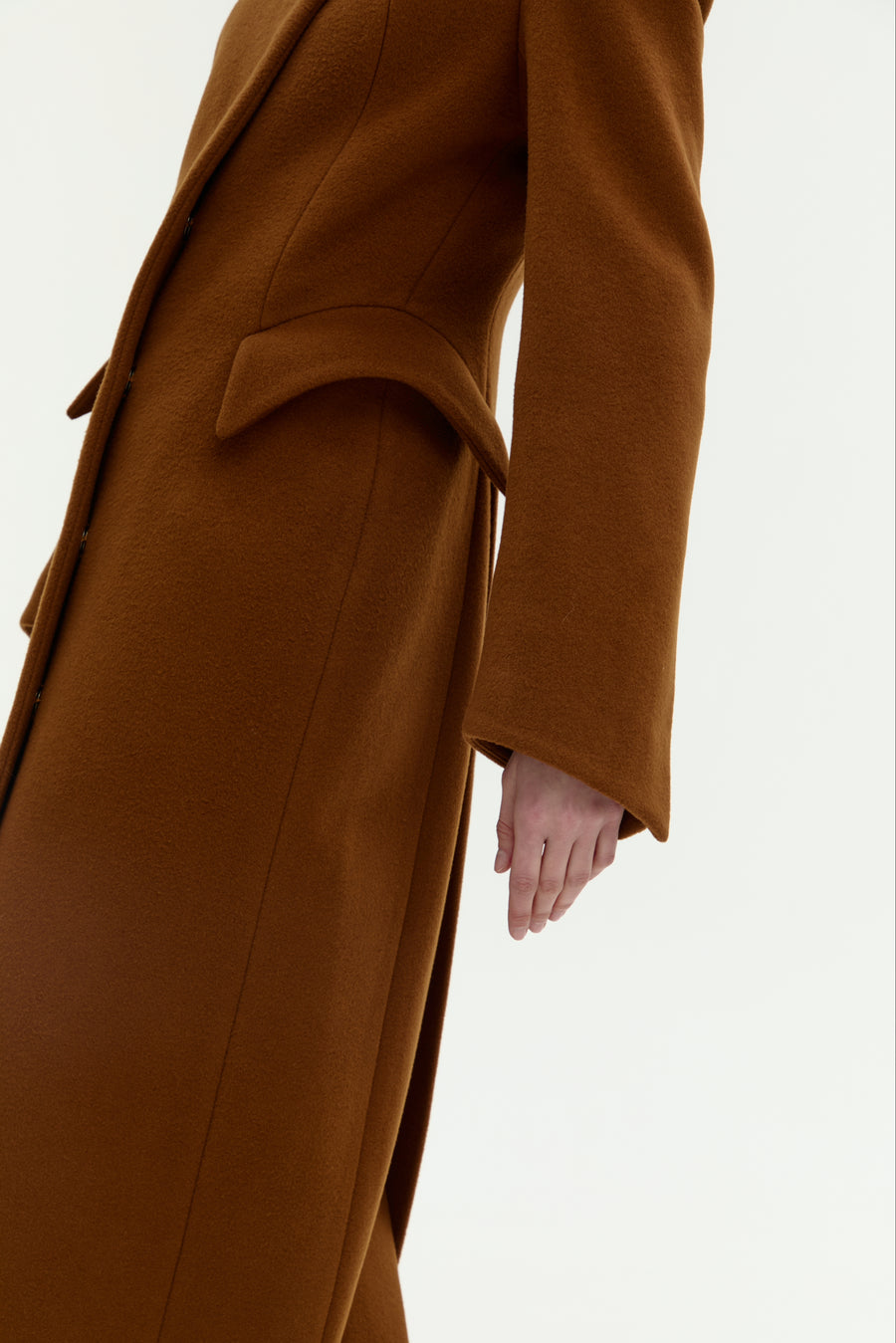Пальто “5-й елемент” — поєднання архітектурної елегантності та сили лінії. Силует вибудуваний на чистих лініях і збалансованих пропорціях, де кожен елемент підкреслює форму. Високий комір формує графічну вісь образу, а рукав із дизайнерською шлицею додає динаміки та функціональної виразності. Акцентні кишені на талії створюють об’ємну композицію, зберігаючи при цьому лаконічність. Застібка на кнопках завершує дизайн у дусі сучасного мінімалізму.