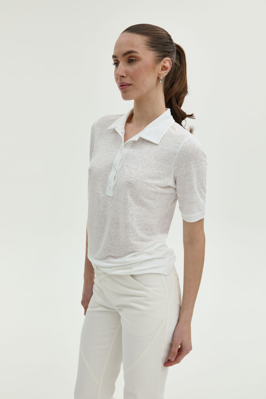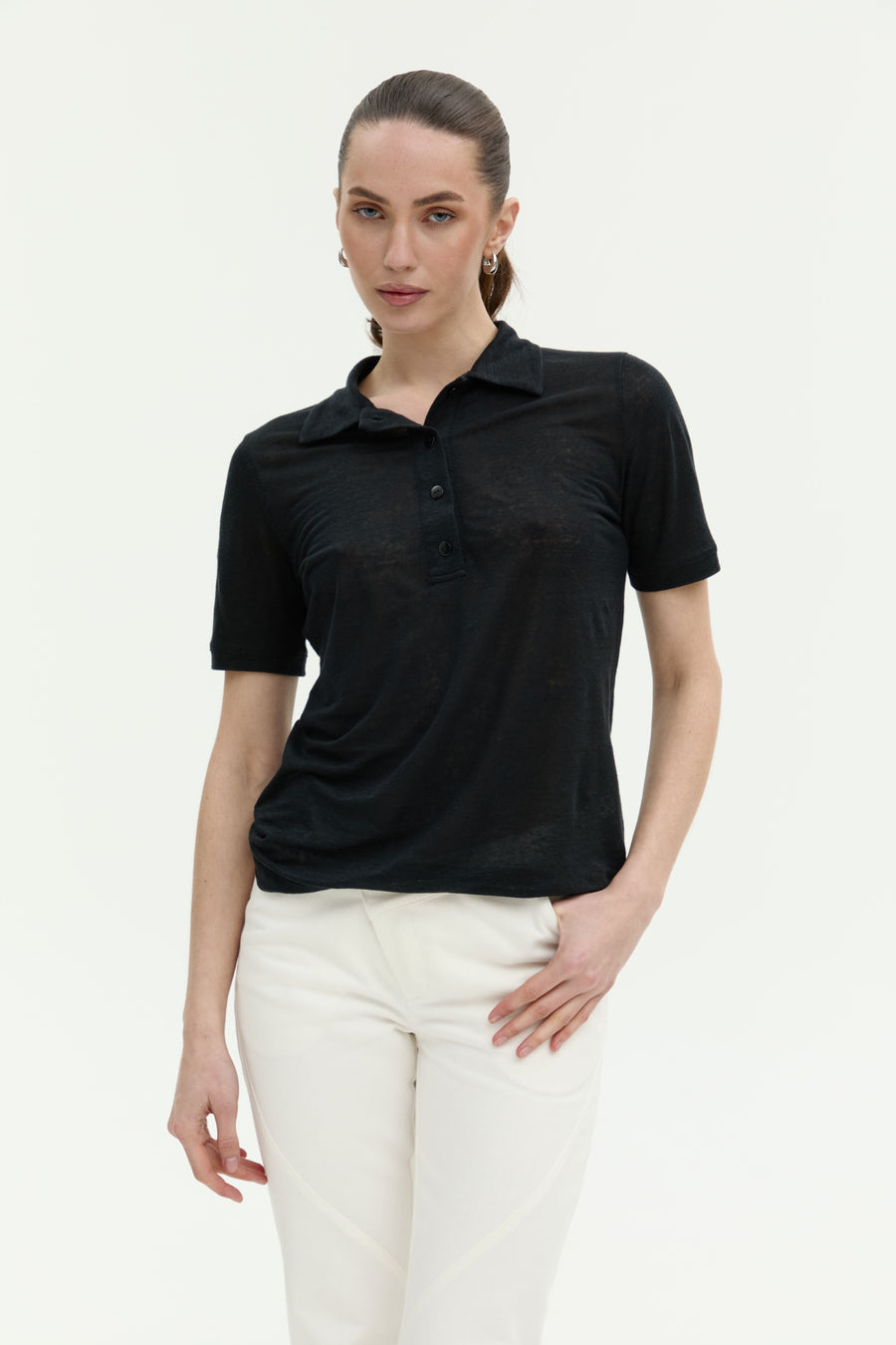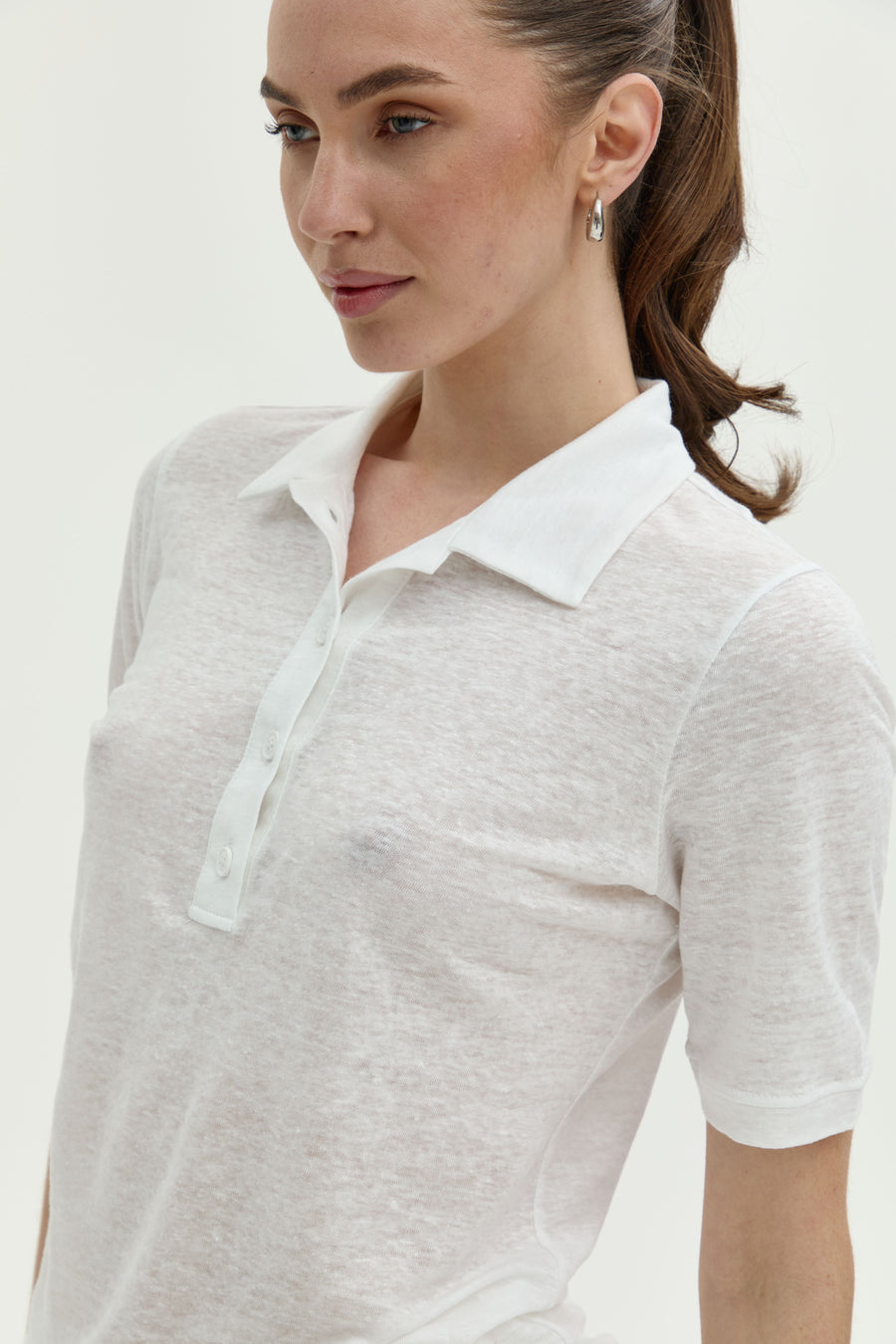 Лляне поло з коротким рукавом і напівпрозорим ефектом. Легка натуральна тканина забезпечує комфорт та свіжість у спекотні дні.