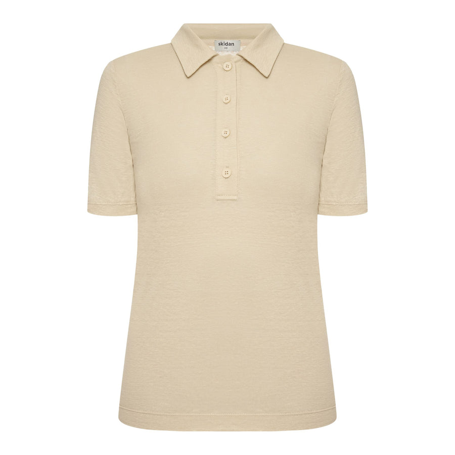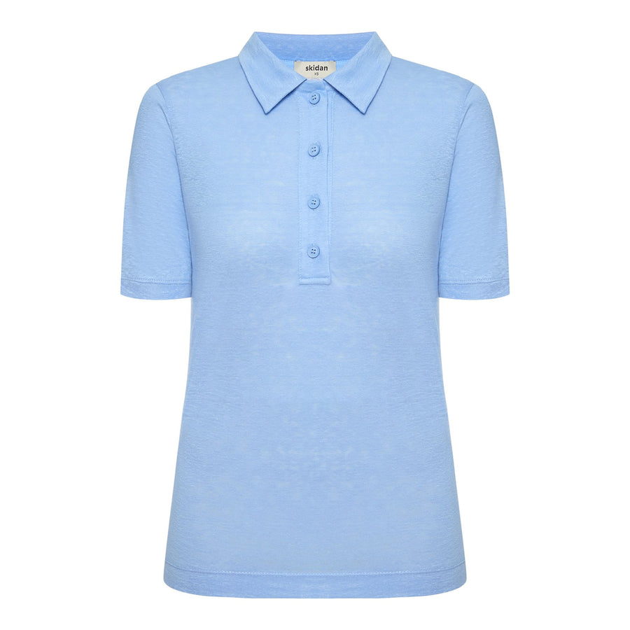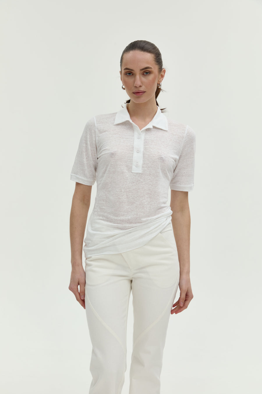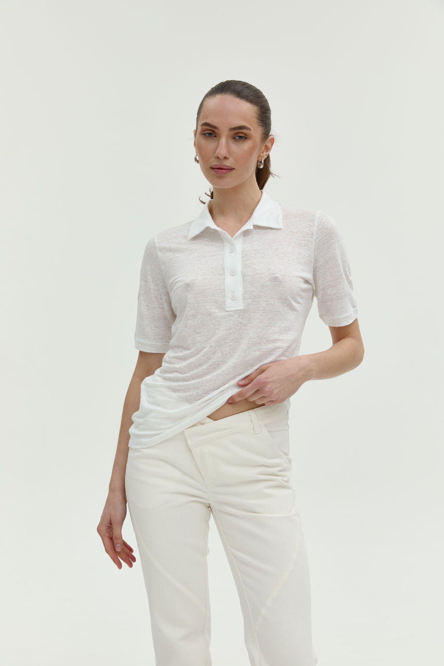 Лляне поло з коротким рукавом і напівпрозорим ефектом. Легка натуральна тканина забезпечує комфорт та свіжість у спекотні дні.