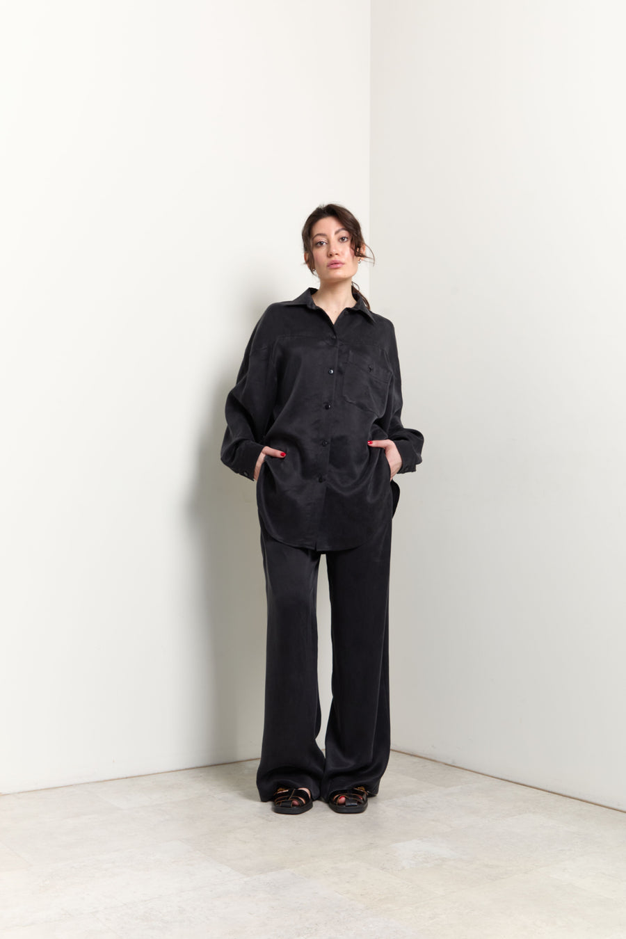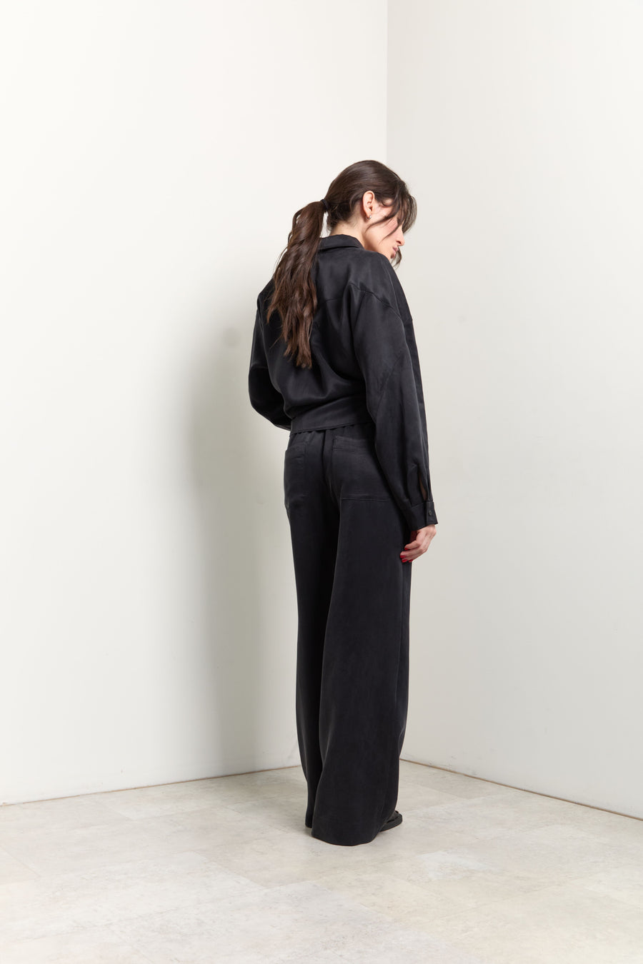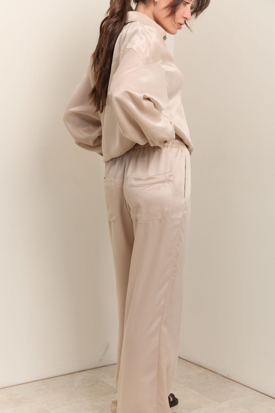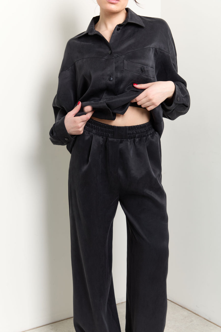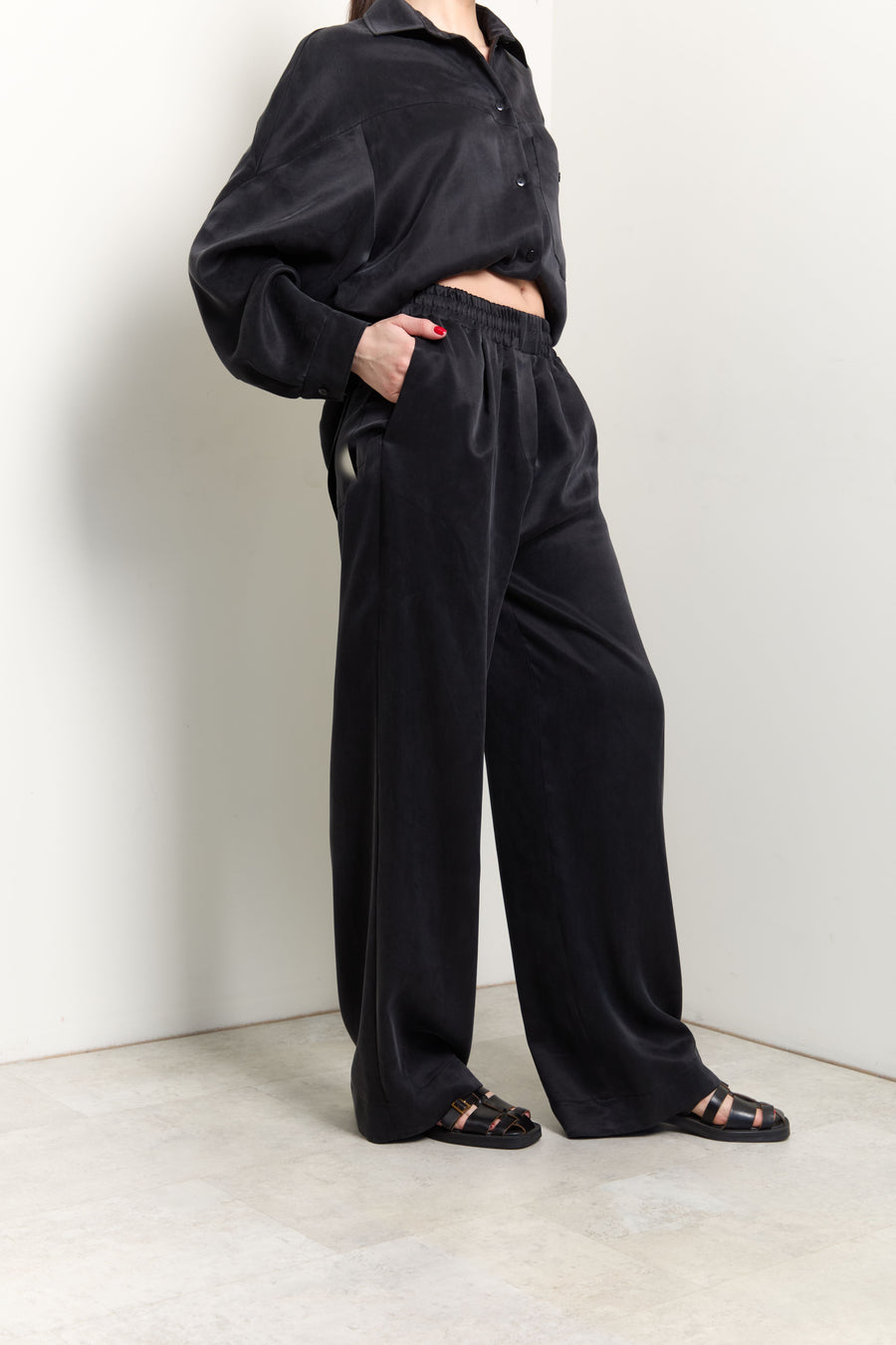 Широкі штани з м’якої віскози створені для вільного і комфортного силуету. Накладні кишені ззаду додають графічності та структури, а еластичний пояс з вишивкою фірмового лого підкреслює увагу до деталей