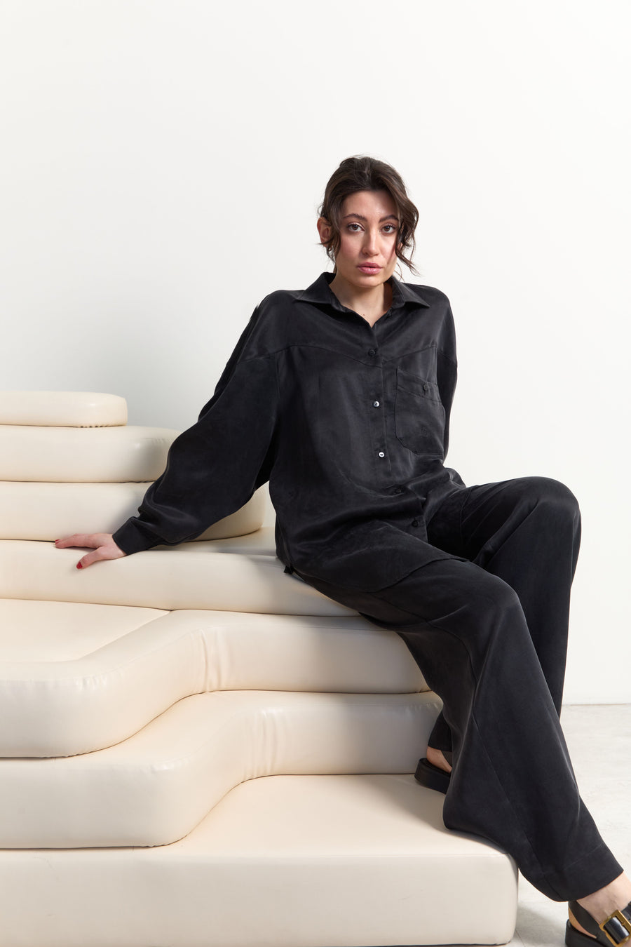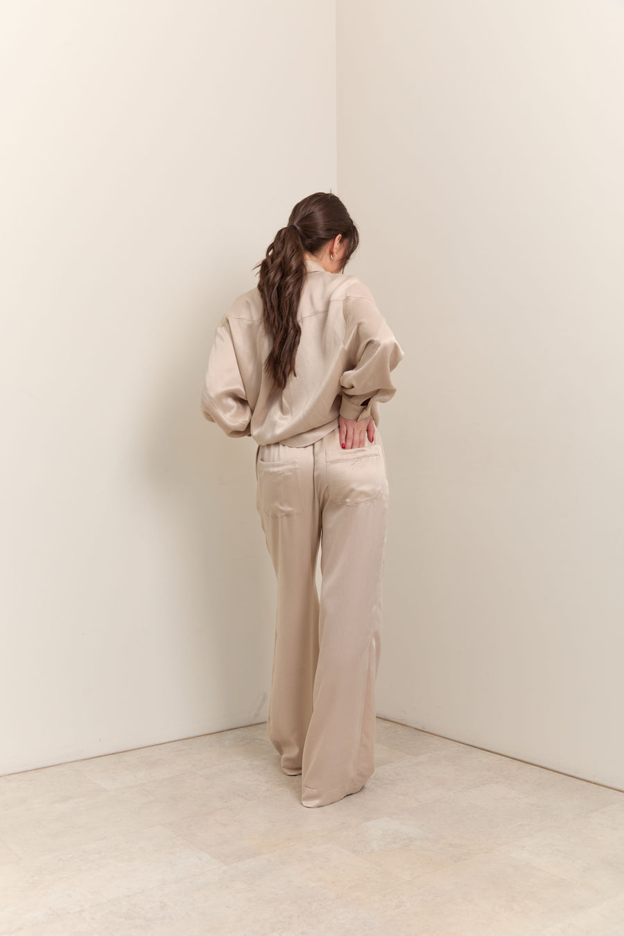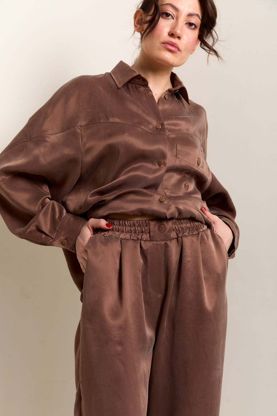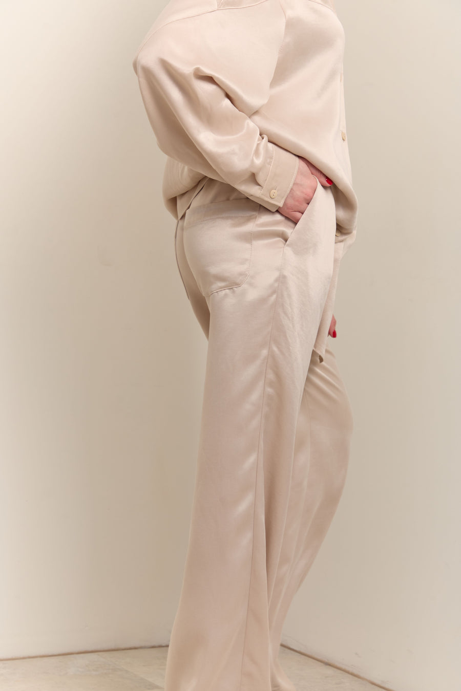 Широкі штани з м’якої віскози створені для вільного і комфортного силуету. Накладні кишені ззаду додають графічності та структури, а еластичний пояс з вишивкою фірмового лого підкреслює увагу до деталей