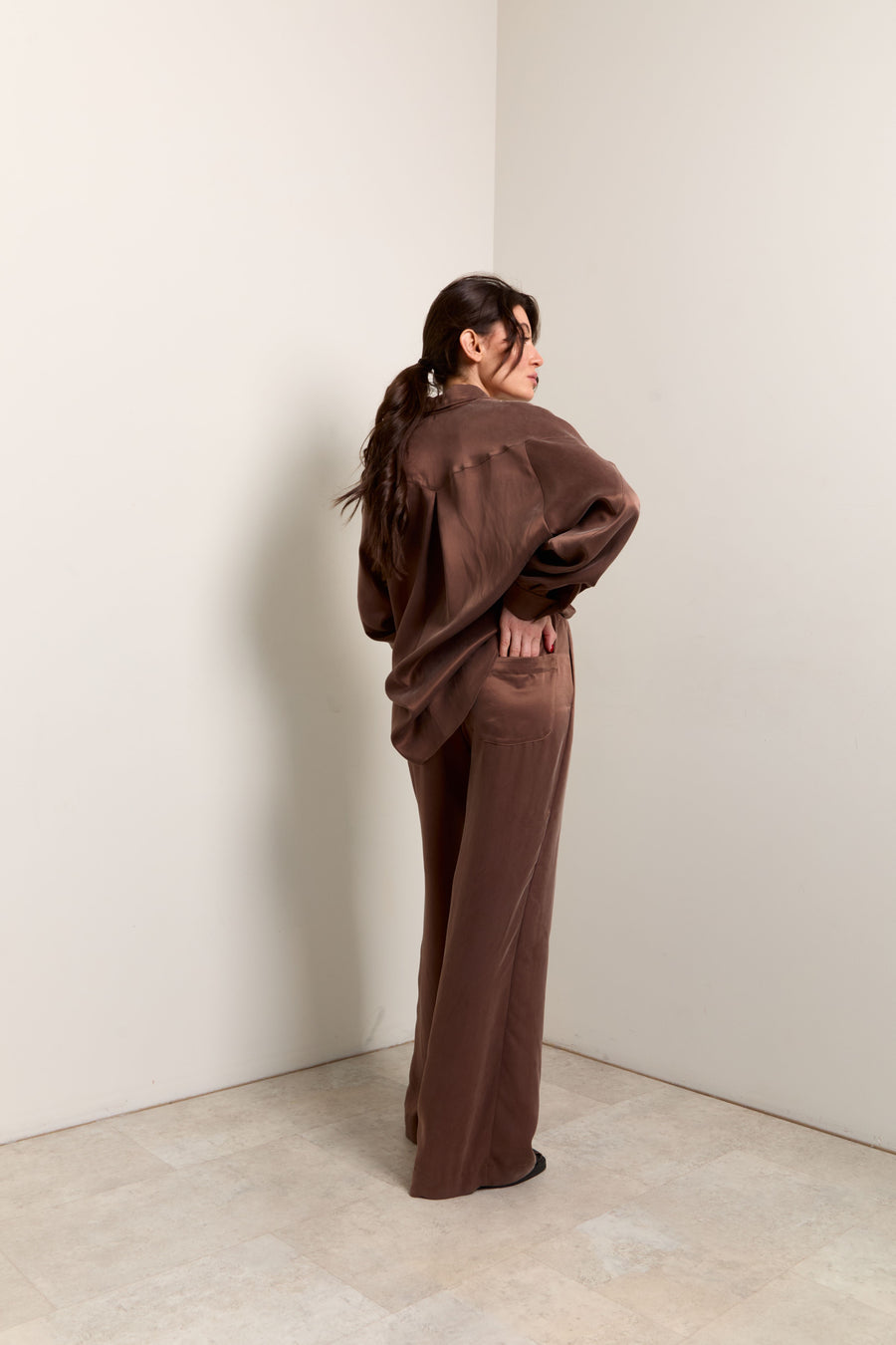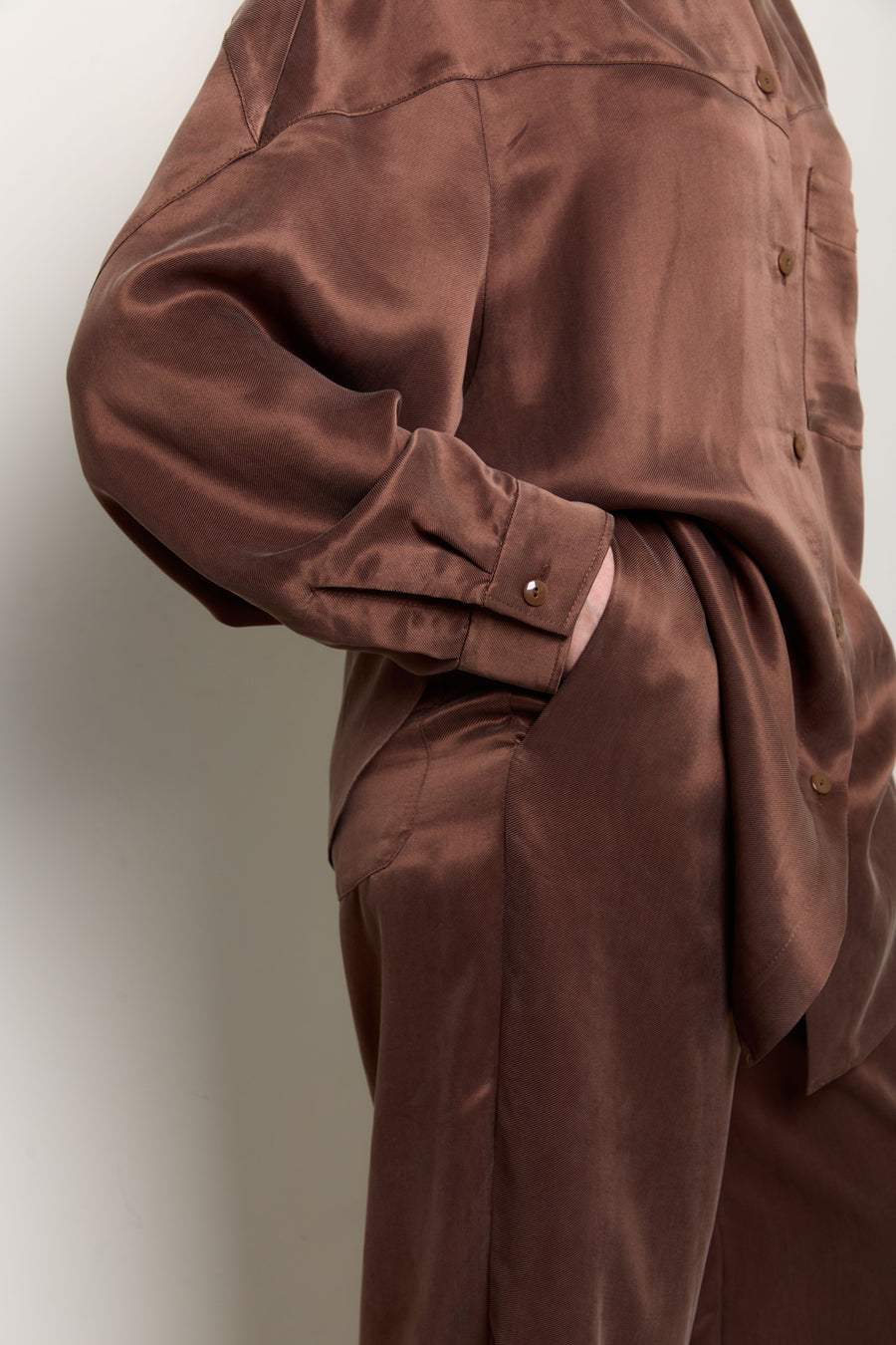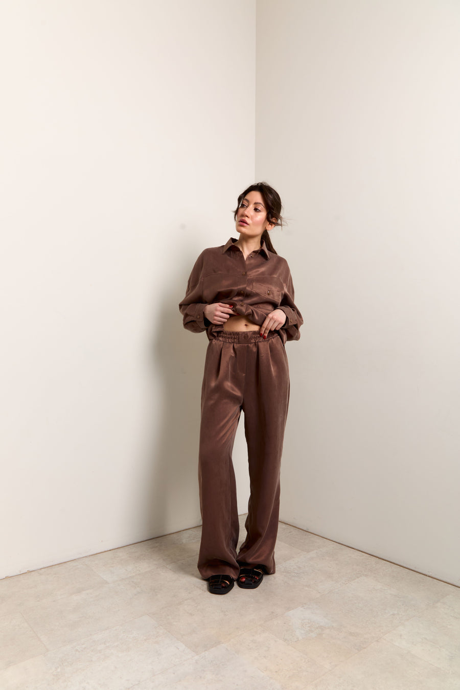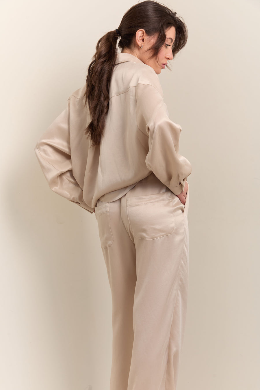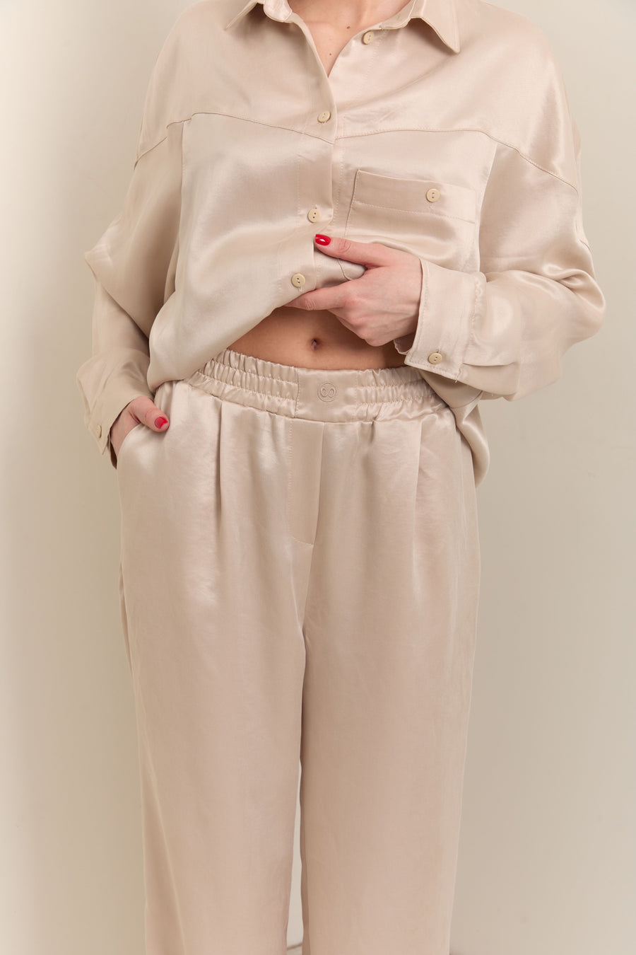 Широкі штани з м’якої віскози створені для вільного і комфортного силуету. Накладні кишені ззаду додають графічності та структури, а еластичний пояс з вишивкою фірмового лого підкреслює увагу до деталей