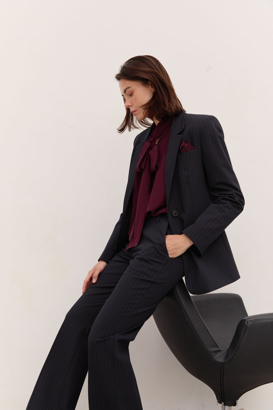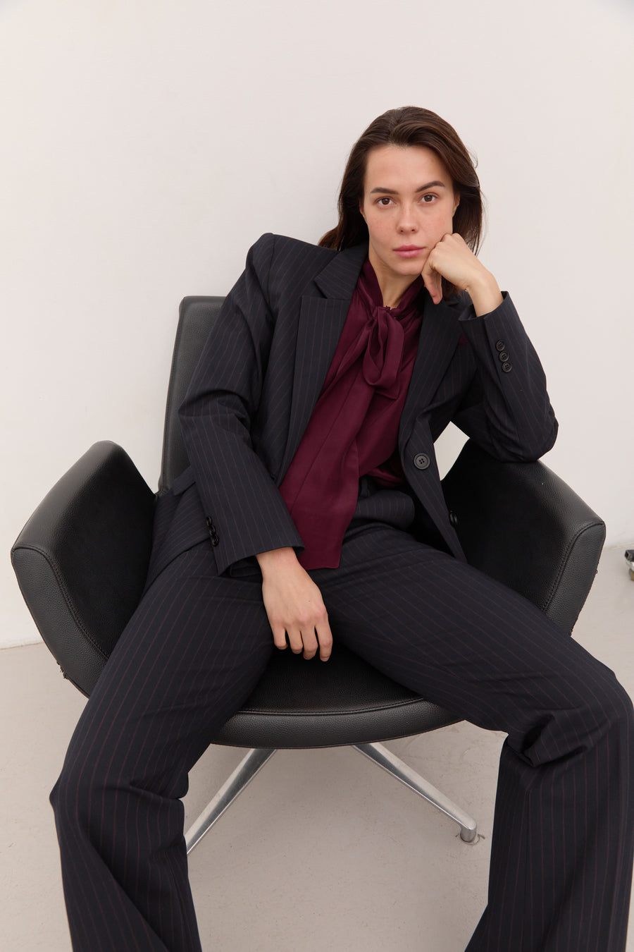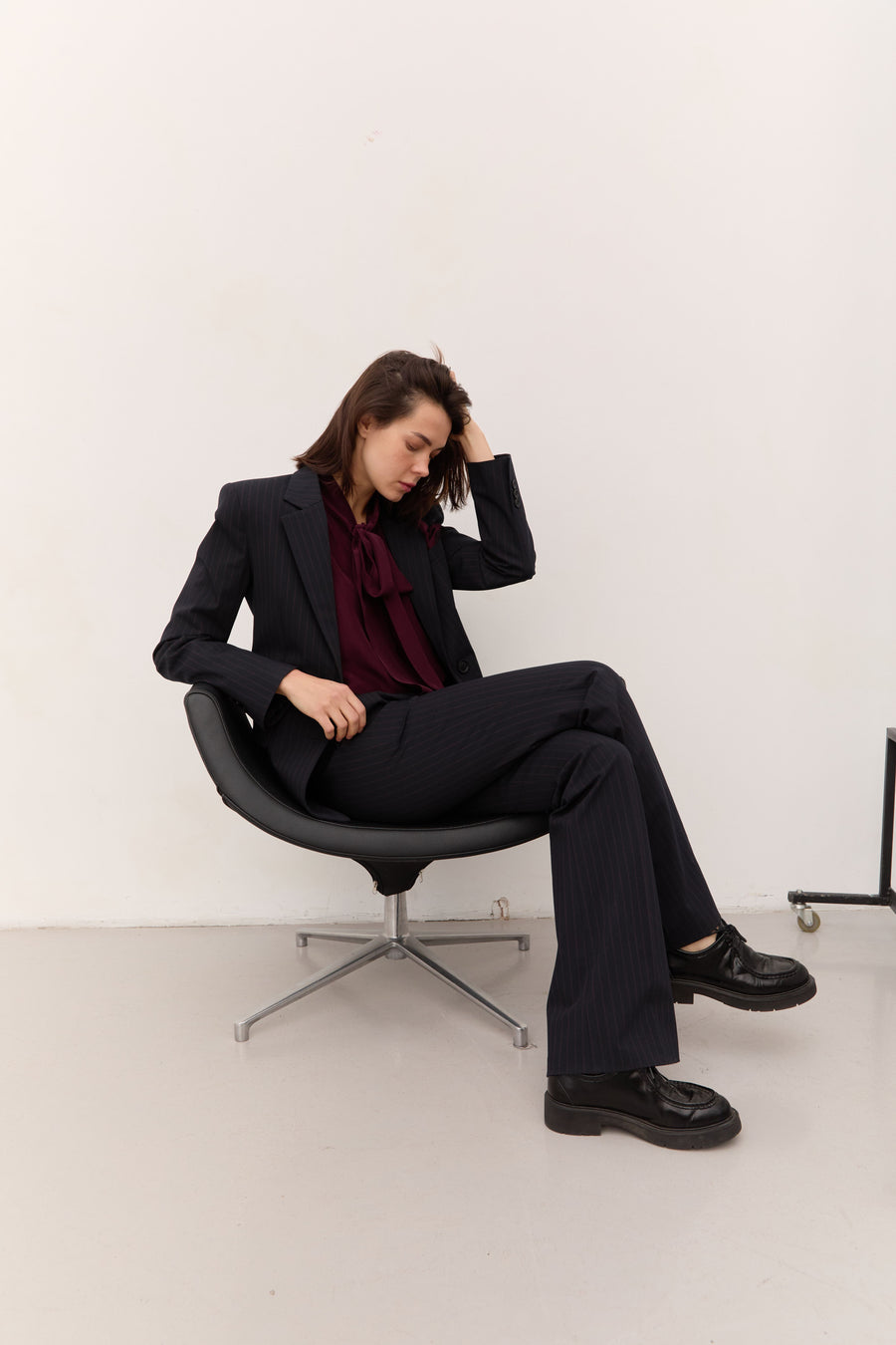Брюки з цільнокрійним поясом, кишенями, вертикальною стрілкою — створюють чіткий і стрункий силует.