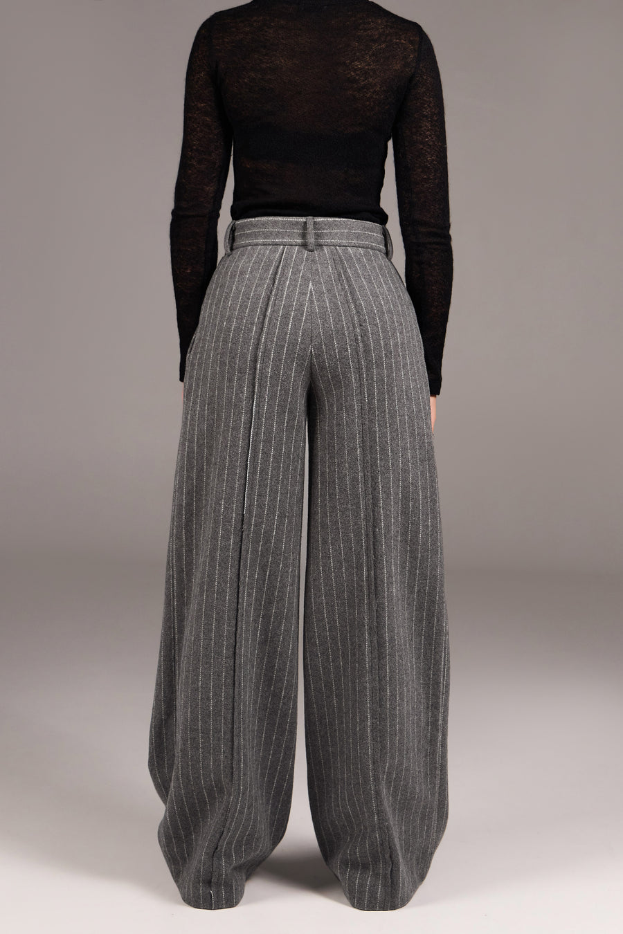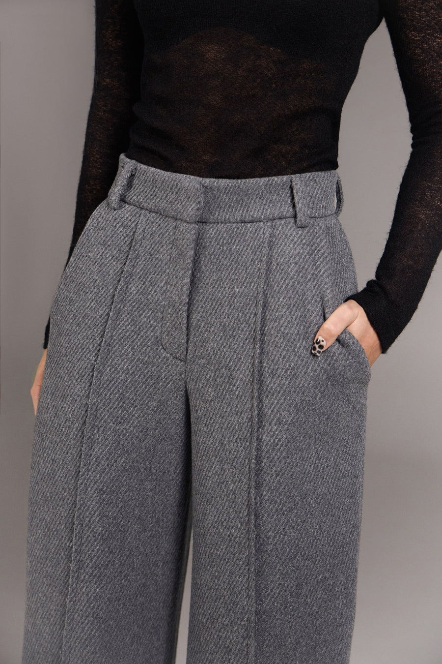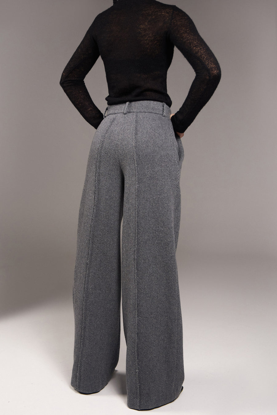 Штани палаццо з вовняної тканини з повною довжиною та вільним, плинним силуетом. Застрочені стрілки формують чітку вертикаль, тоді як необроблений край стрілок додає образу грайливої недосконалості й сучасного характеру. Виконані на підкладі, штани забезпечують комфортну посадку та природну пластику руху.