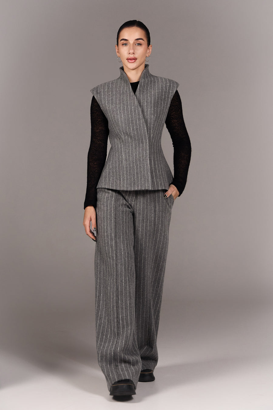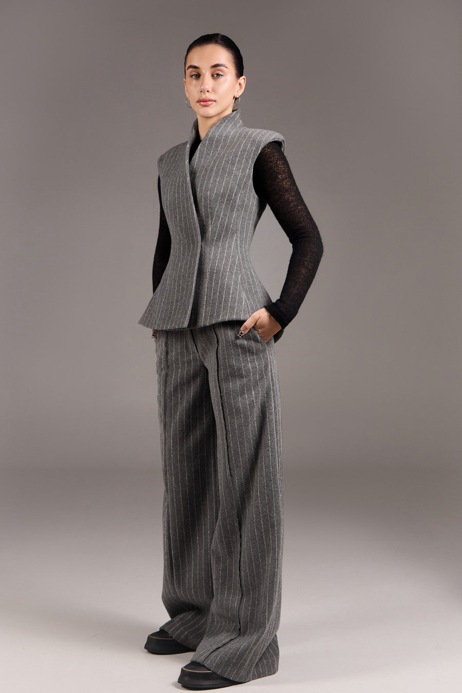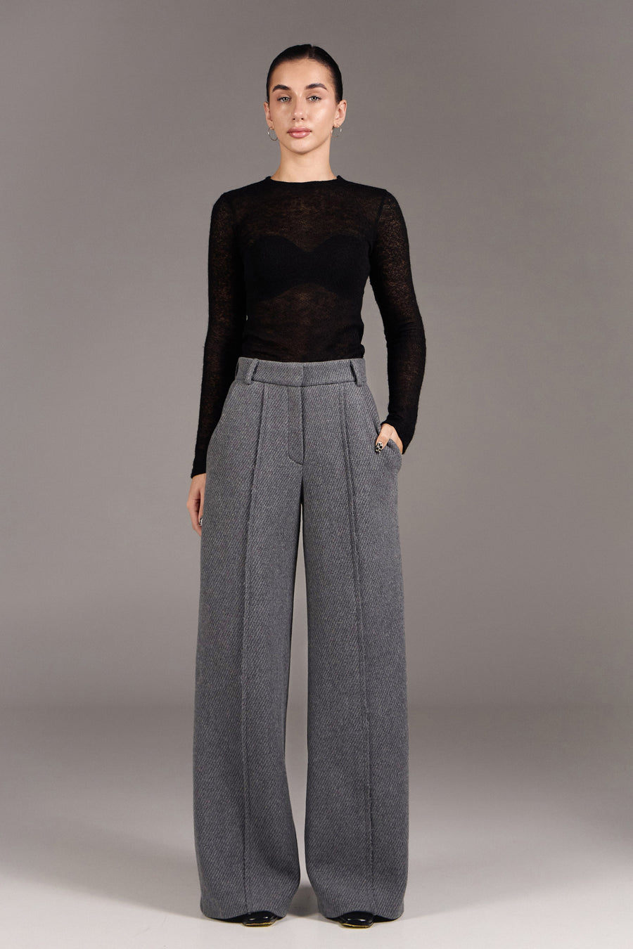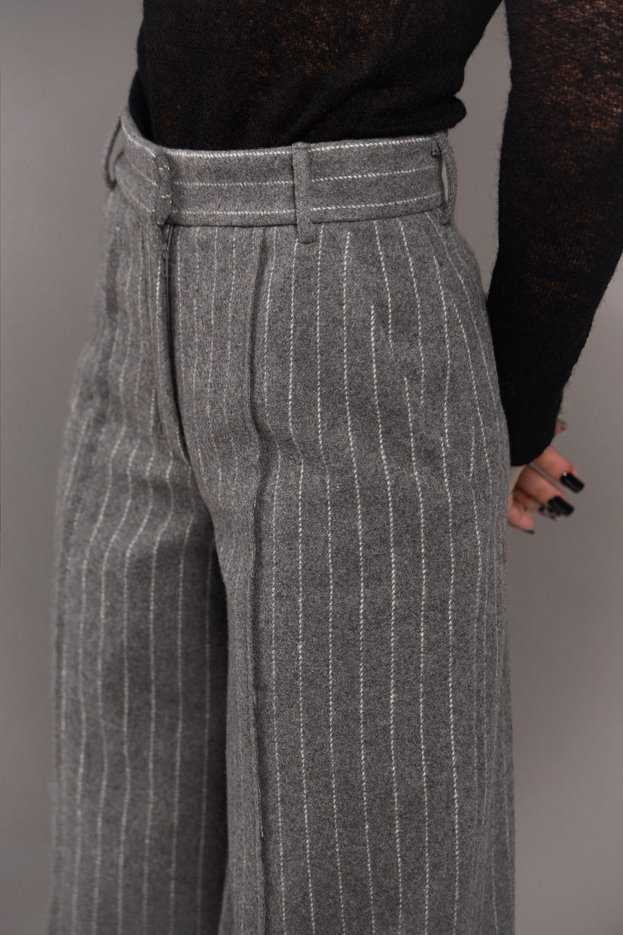 Штани палаццо з вовняної тканини з повною довжиною та вільним, плинним силуетом. Застрочені стрілки формують чітку вертикаль, тоді як необроблений край стрілок додає образу грайливої недосконалості й сучасного характеру. Виконані на підкладі, штани забезпечують комфортну посадку та природну пластику руху.