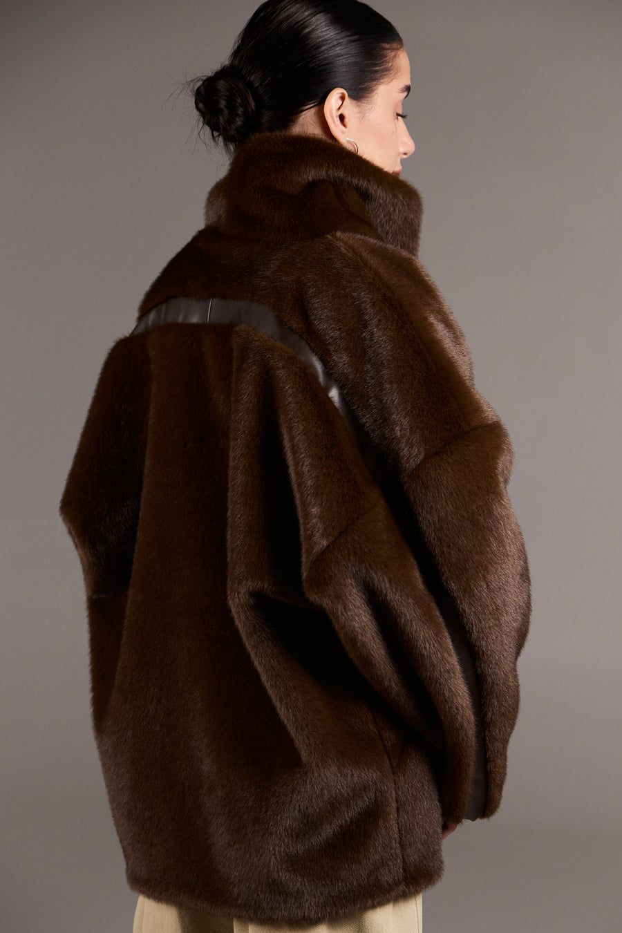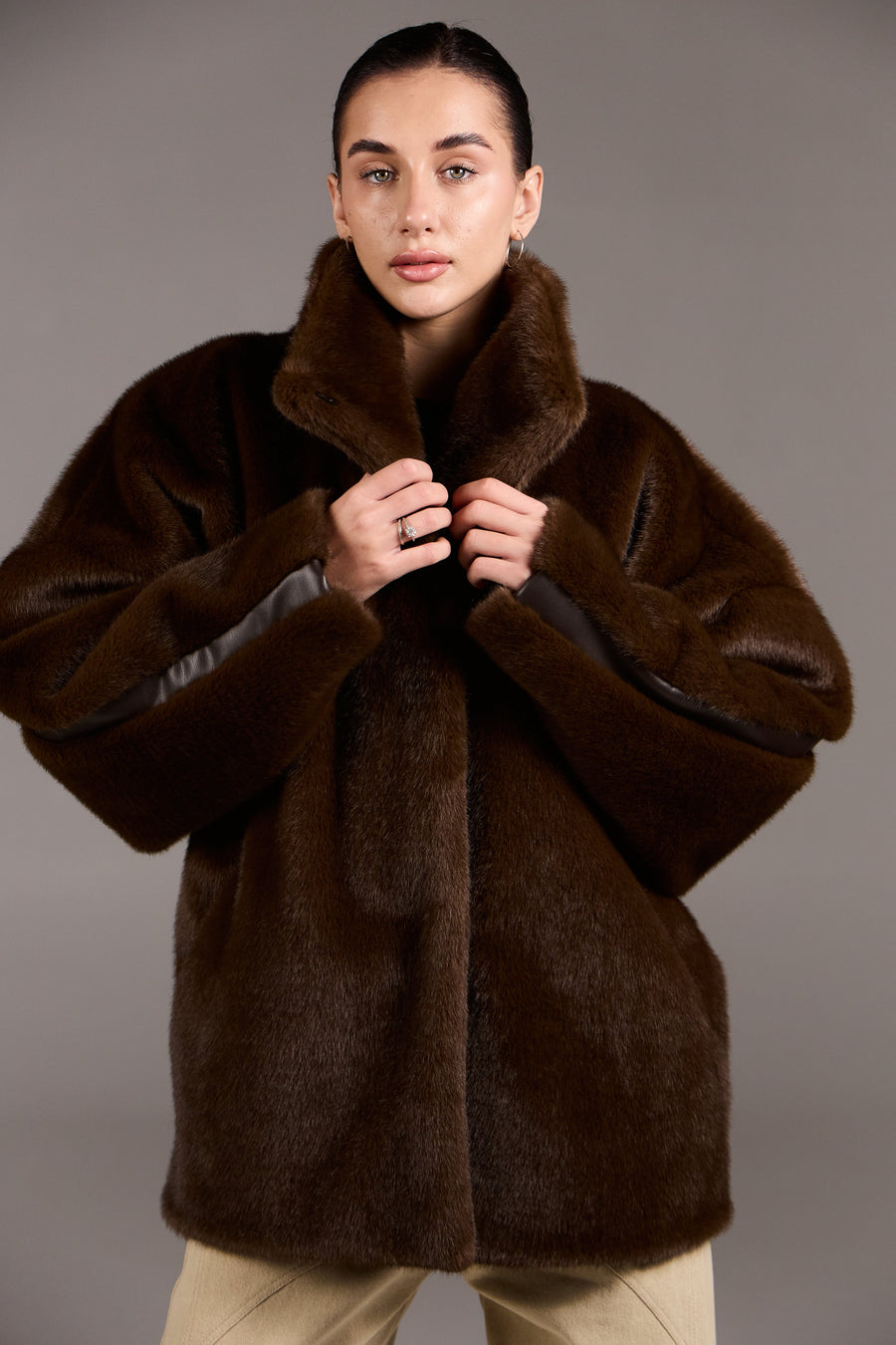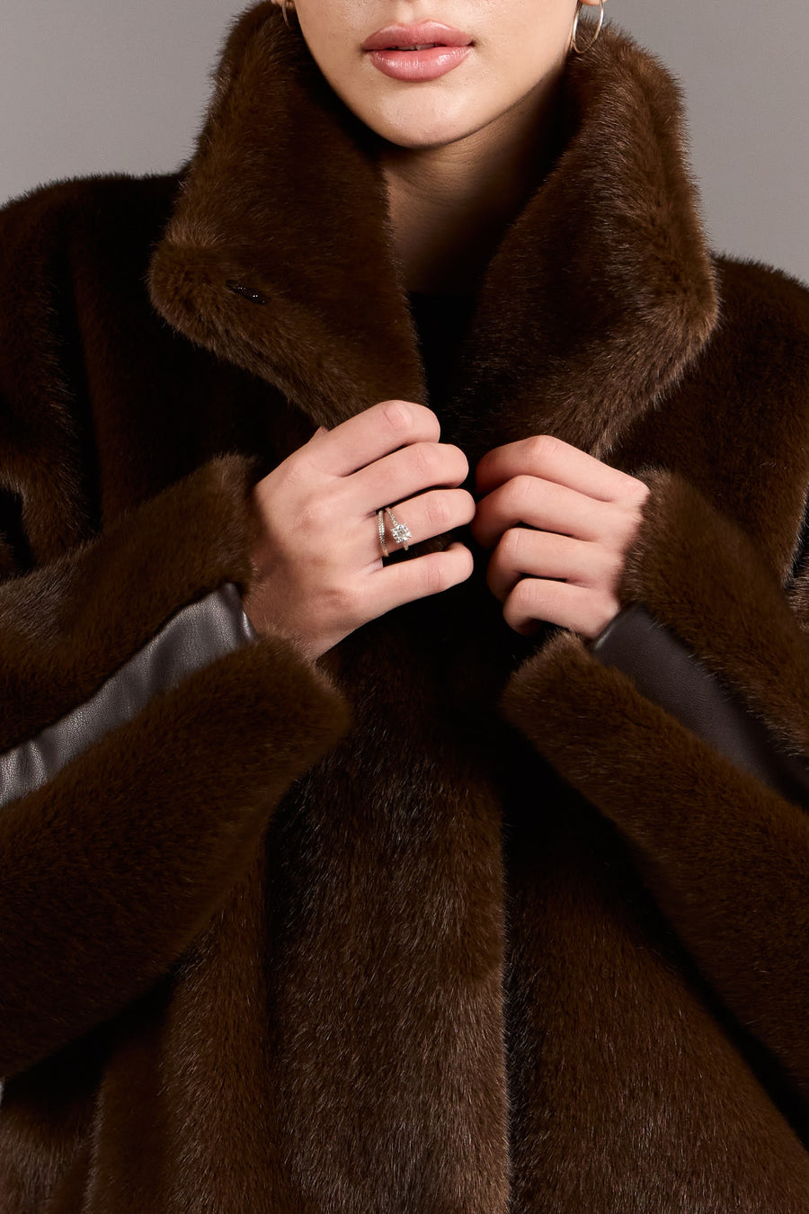 Шуба з екохутра з імітацією норкового ворсу поєднує шовковисту текстуру з продуманою конструкцією. Об’ємний силует вільного крою із заниженою лінією талії до середини стегна формує актуальні пропорції та сучасний характер образу. Комір-стійка додає лаконічної графіки, а екошкіряні вставки працюють як стриманий акцент фактур. Виріб виконаний на делікатному внутрішньому дубляжі, що забезпечує стабільність форми та чіткість ліній у носінні.