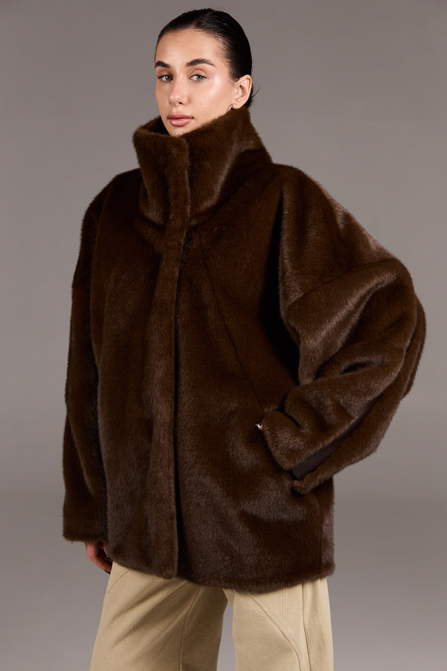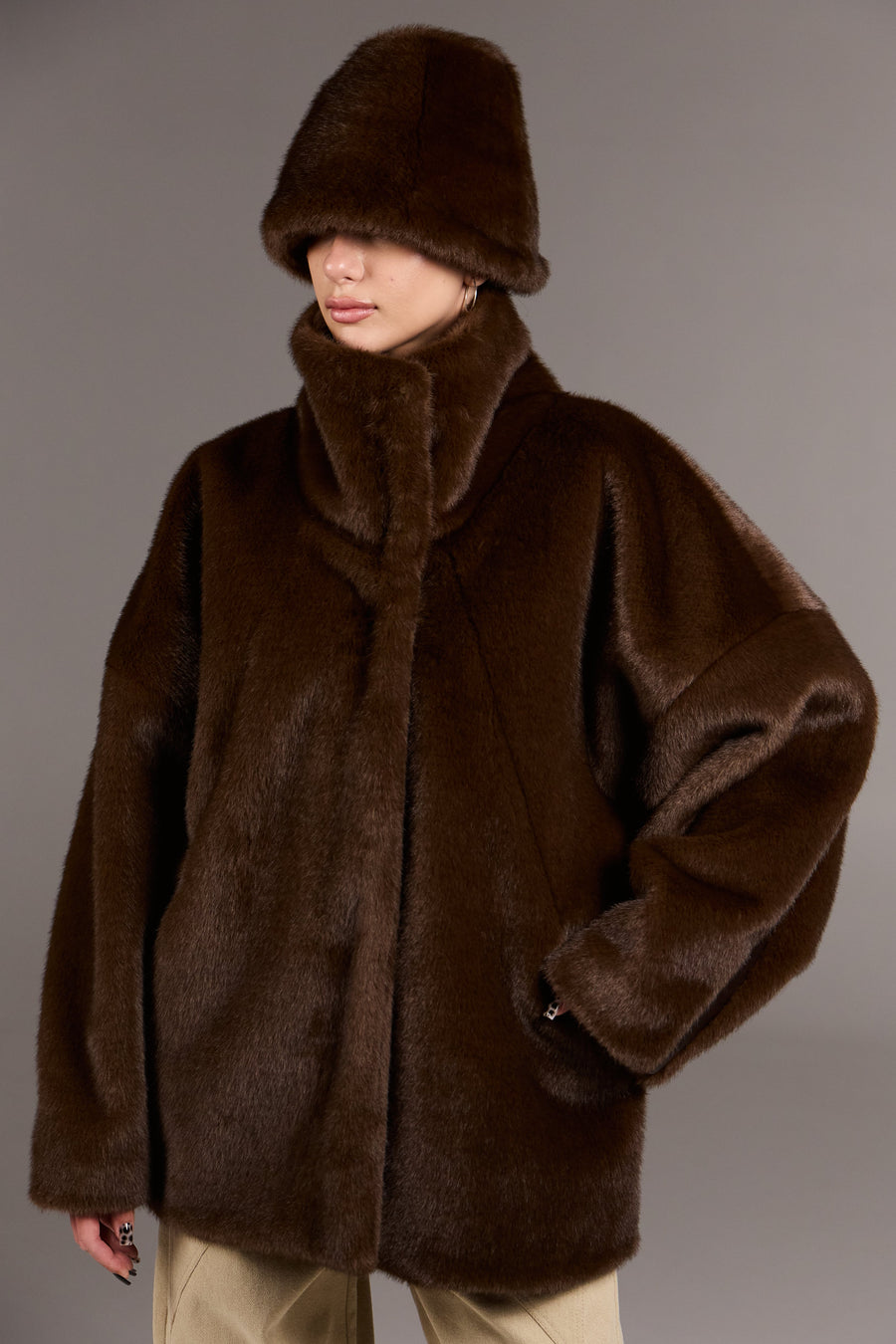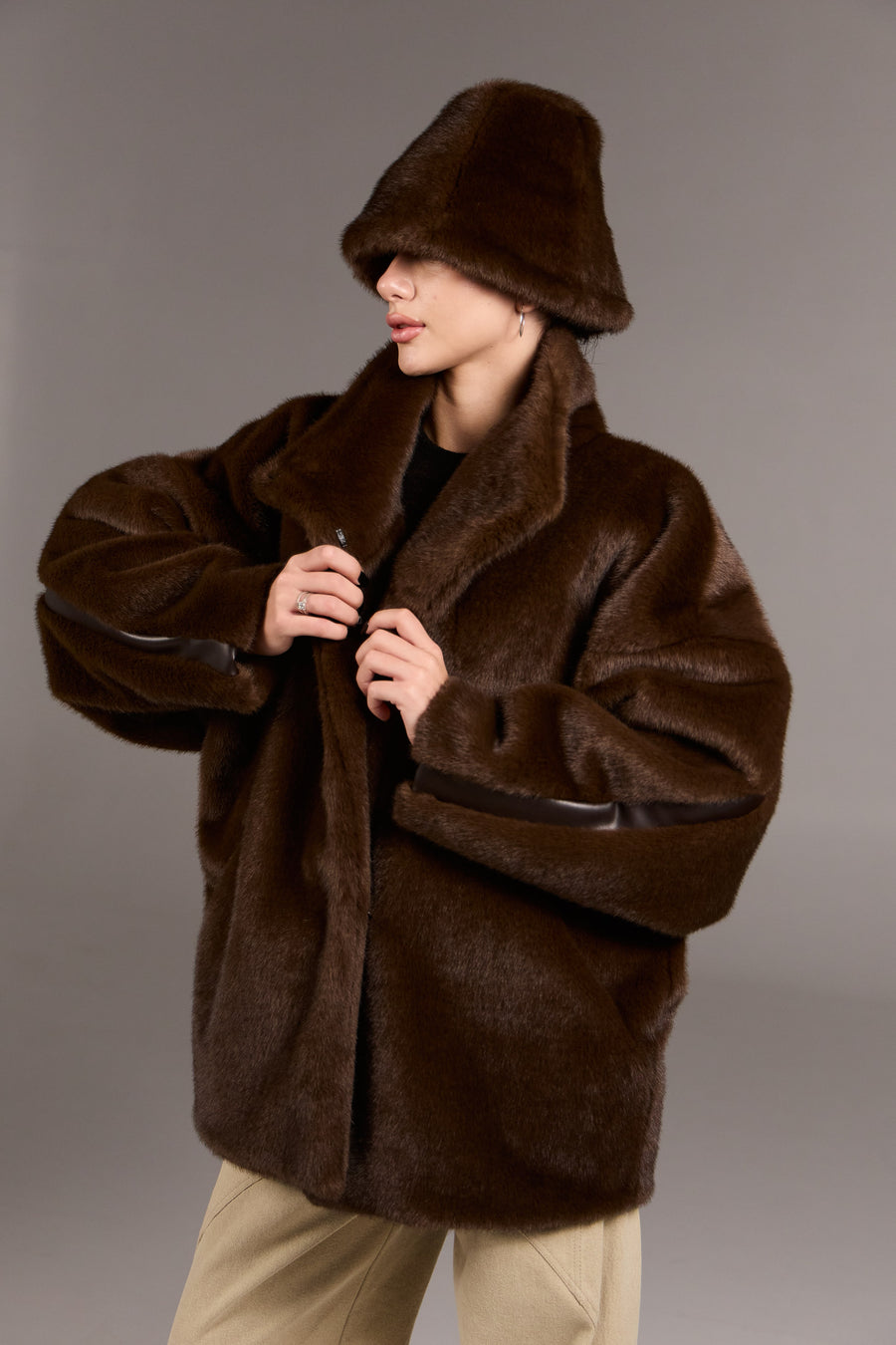 Шуба з екохутра з імітацією норкового ворсу поєднує шовковисту текстуру з продуманою конструкцією. Об’ємний силует вільного крою із заниженою лінією талії до середини стегна формує актуальні пропорції та сучасний характер образу. Комір-стійка додає лаконічної графіки, а екошкіряні вставки працюють як стриманий акцент фактур. Виріб виконаний на делікатному внутрішньому дубляжі, що забезпечує стабільність форми та чіткість ліній у носінні.