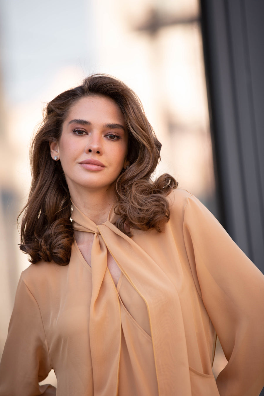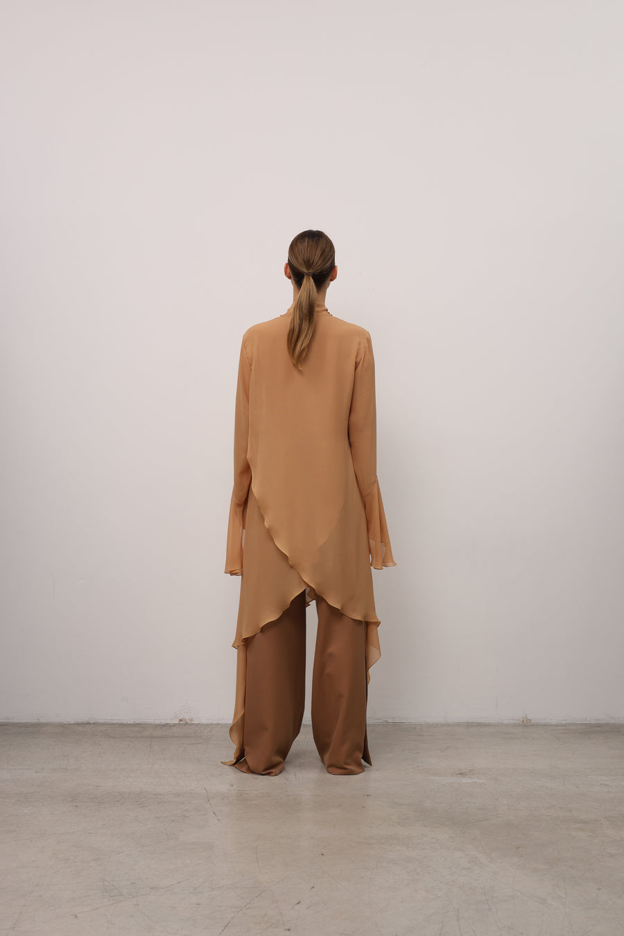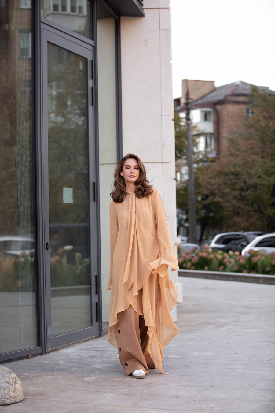 Подовжена сорочка з шифону вирізняється асиметричним кроєм, що надає силуету сучасної динаміки. Шарф-бант підкреслює жіночність, а рукави з делікатними розрізами додають легкості та витонченості в русі