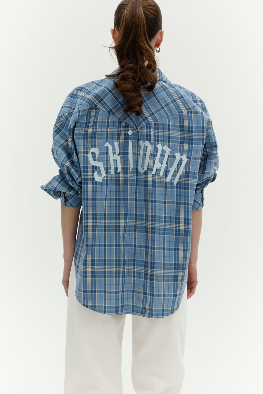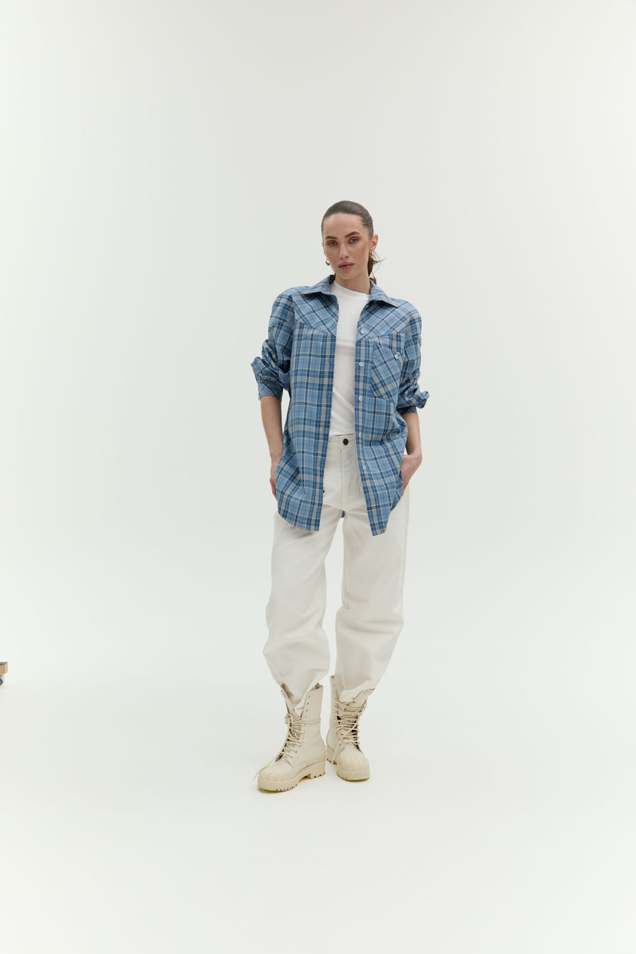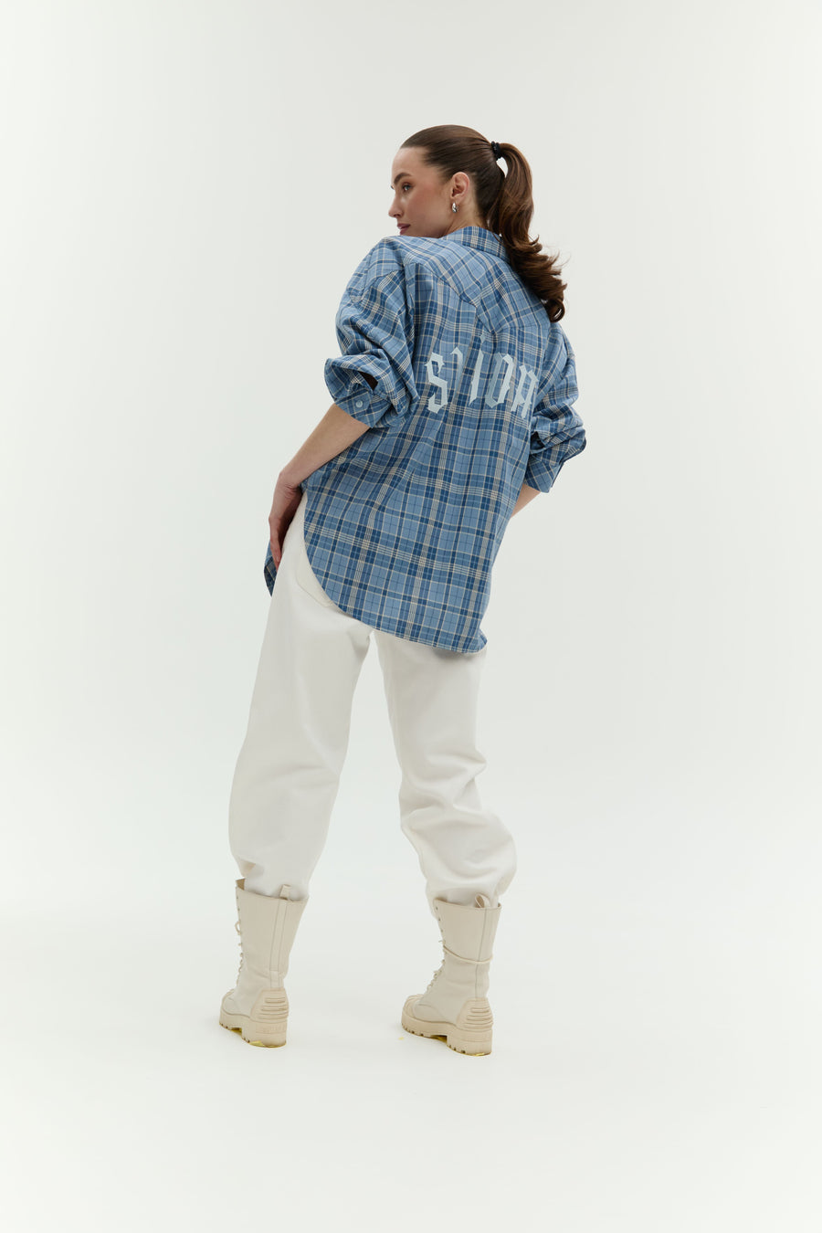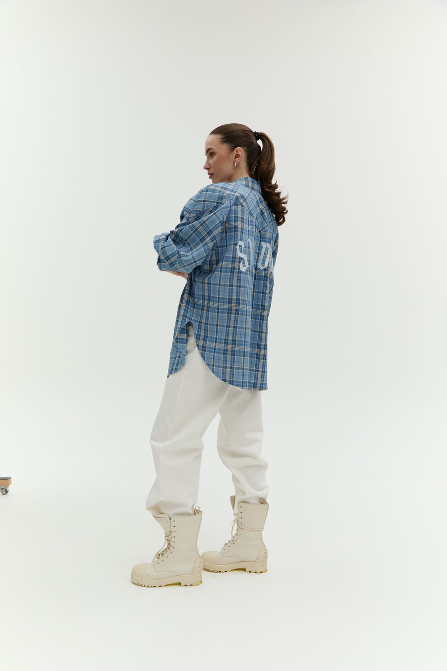 Легка сорочка Oversize з акцентною фігурною кокеткою. Велика фірмова вишивка по спинці.