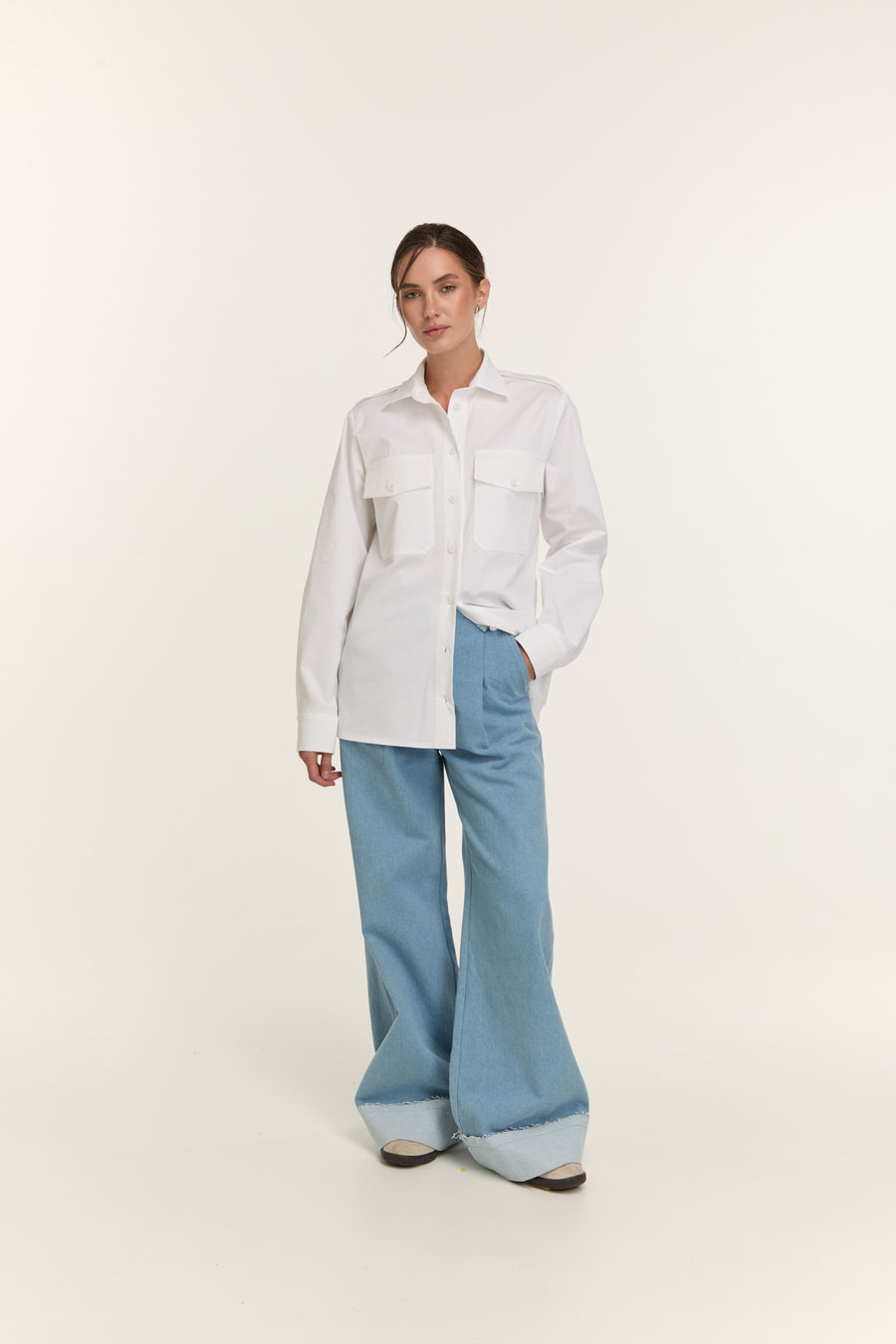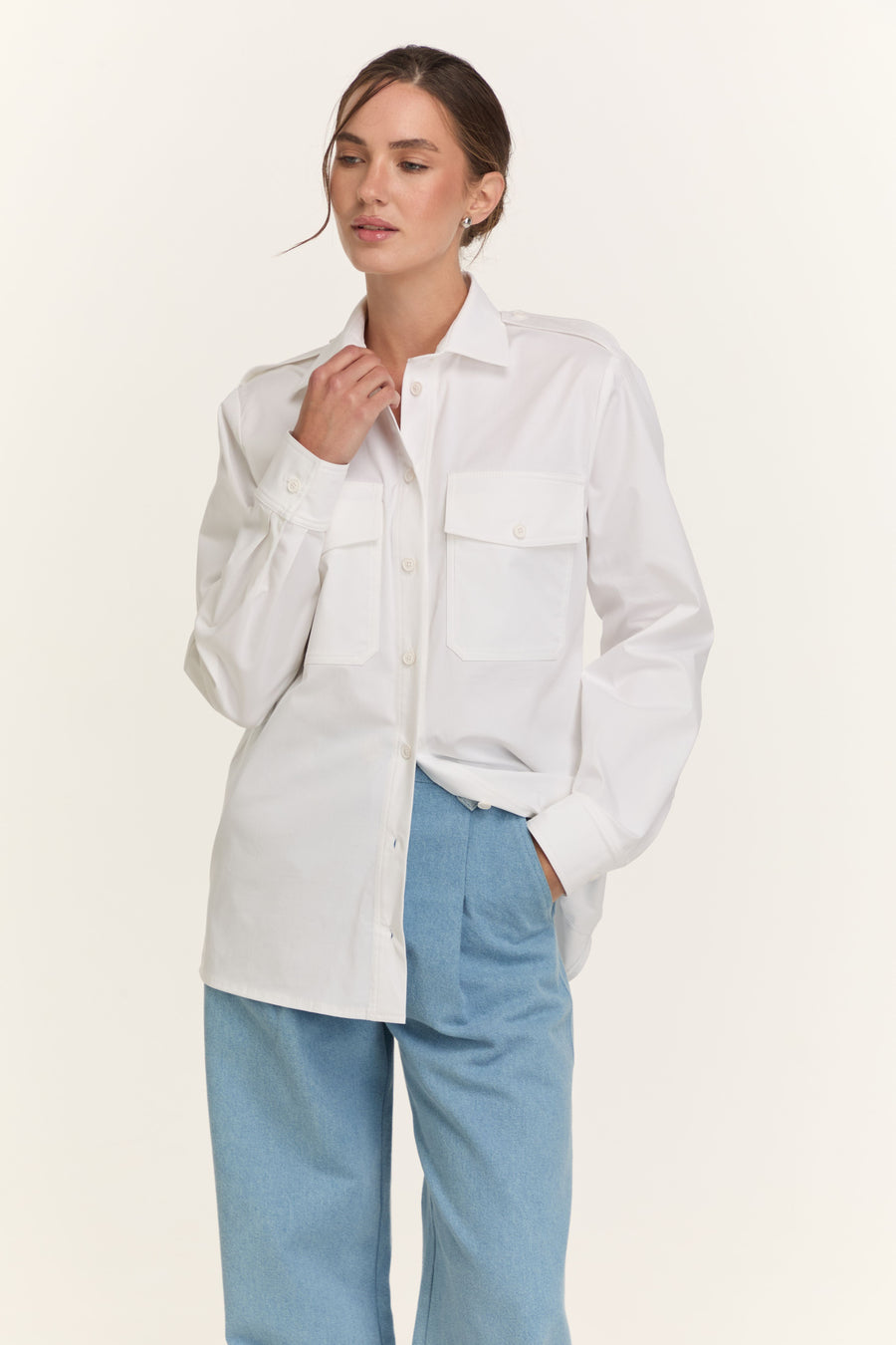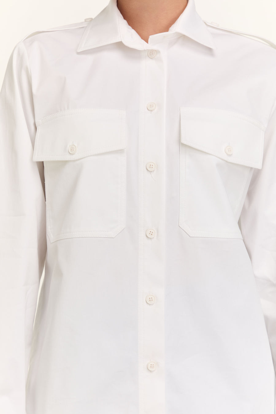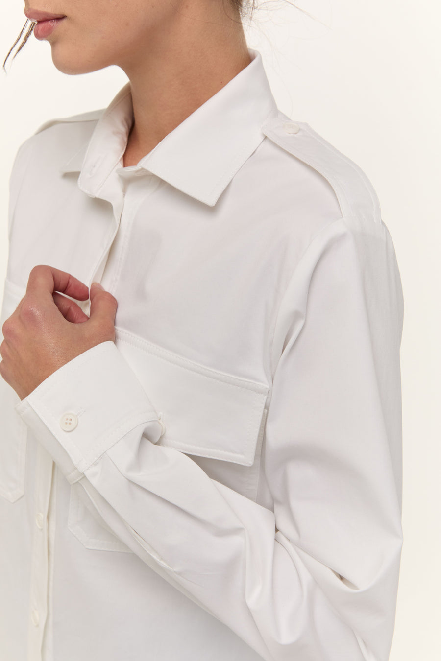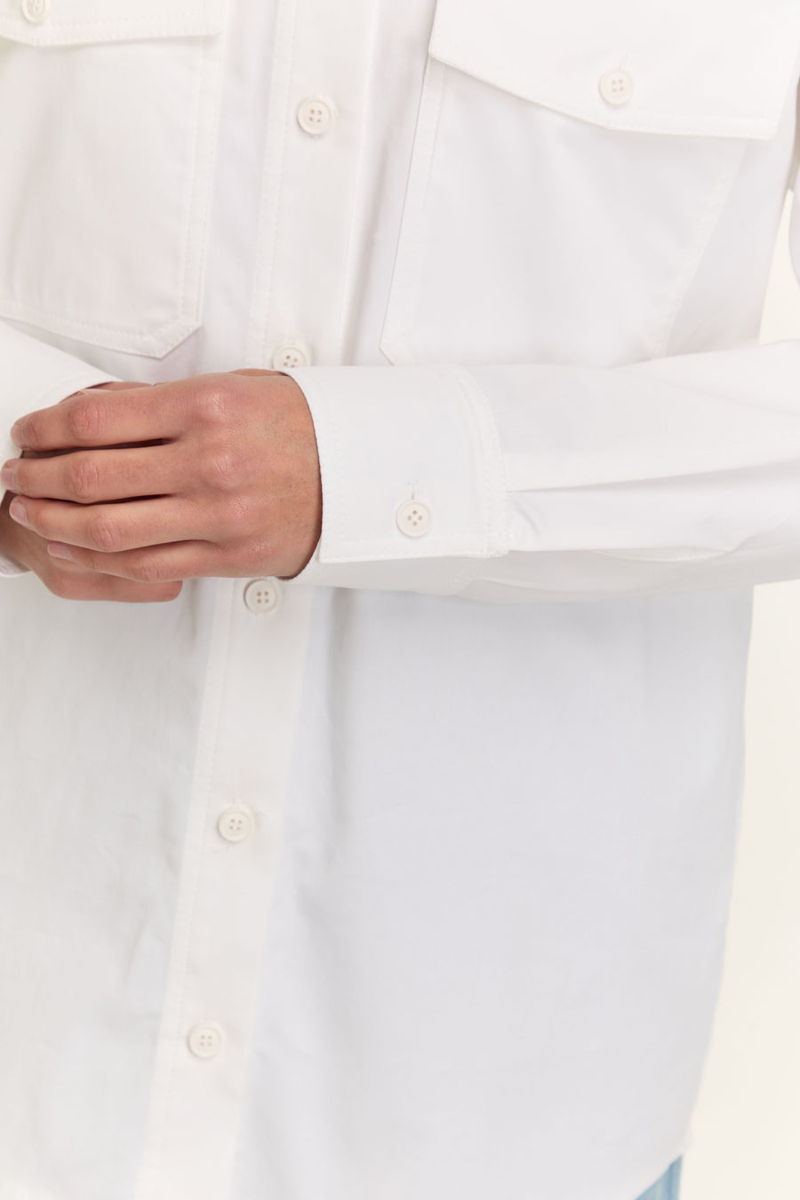 Біла сорочка прямого крою з котону — базова річ, яка поєднує комфорт і стиль. Накладні кишені з клапаном на ґудзиках та планка на спинці підкреслюють силует