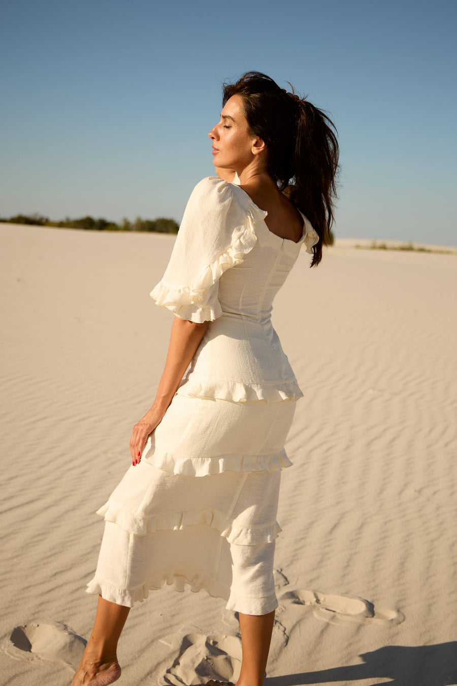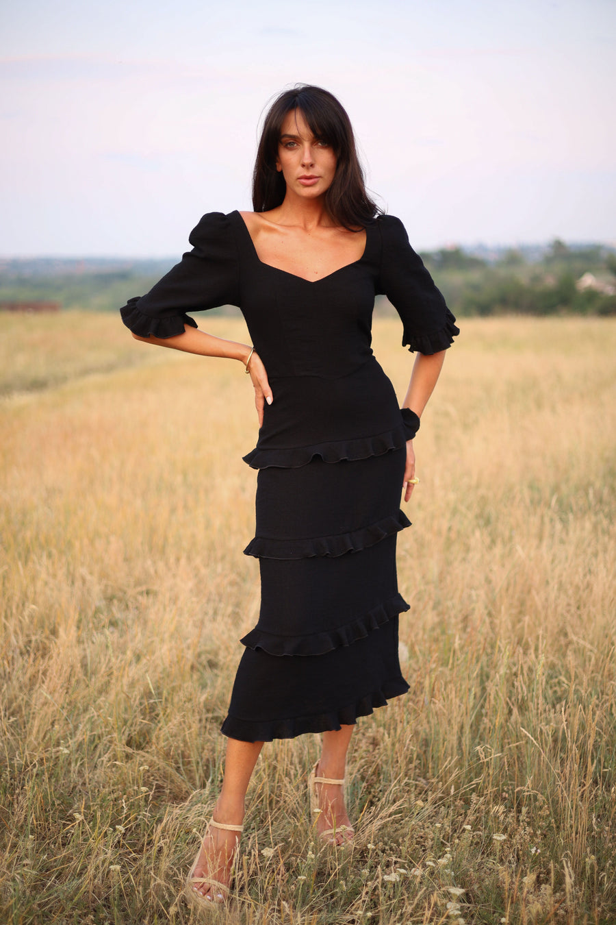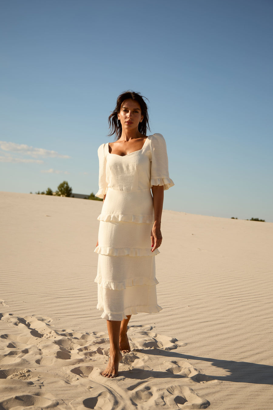 Неймовірно вишукана сукня-міді з креп-віскози, фігурним вирізом по ліфу та спинці. Рукава з акцентними плечима та воланами. Довга потаємна застібка–блискавка ззаду. Сукня фігурно відрізана по лінії талії, з воланом внизу та декількома воланами по сукні.
