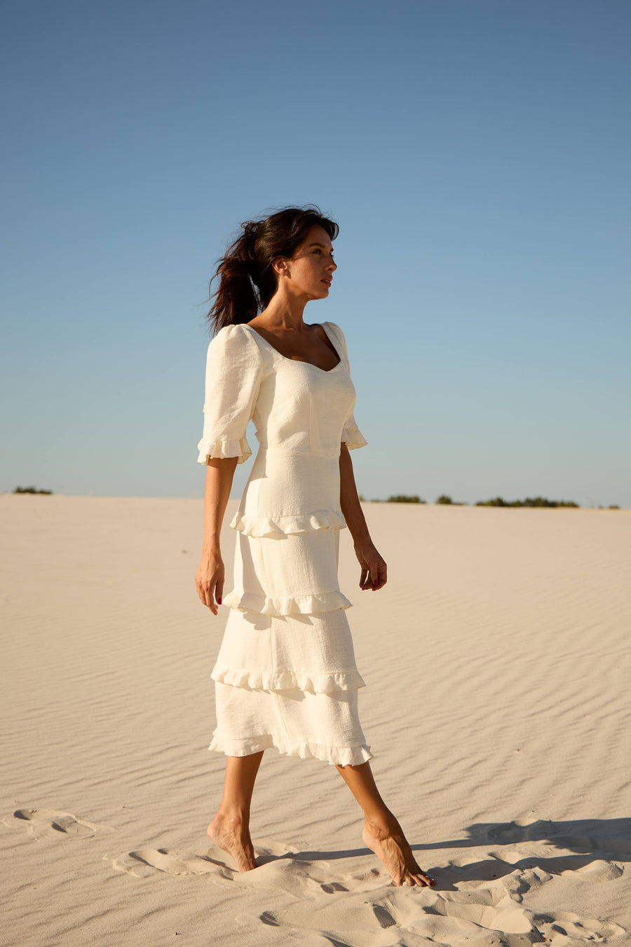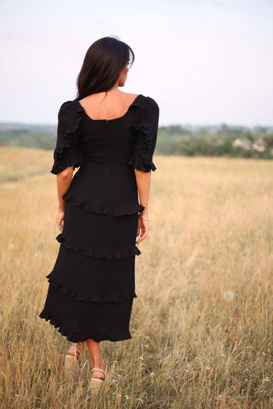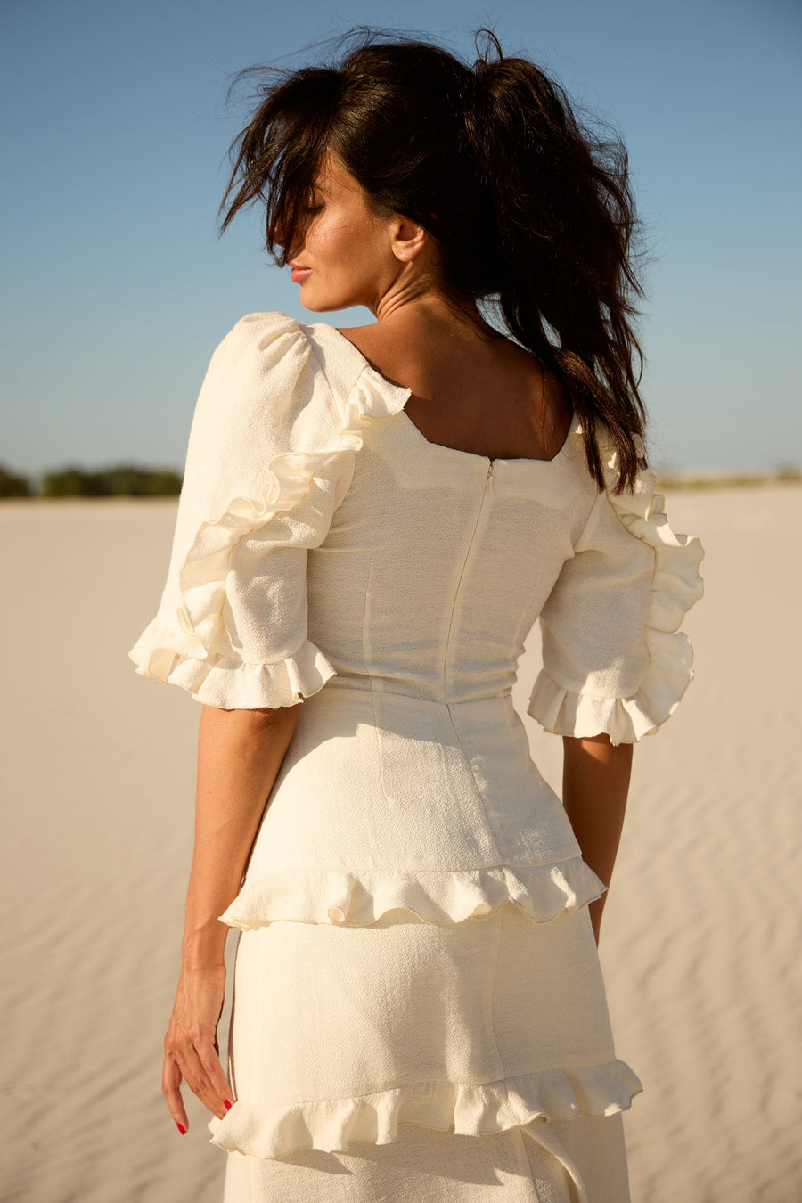 Неймовірно вишукана сукня-міді з креп-віскози, фігурним вирізом по ліфу та спинці. Рукава з акцентними плечима та воланами. Довга потаємна застібка–блискавка ззаду. Сукня фігурно відрізана по лінії талії, з воланом внизу та декількома воланами по сукні.