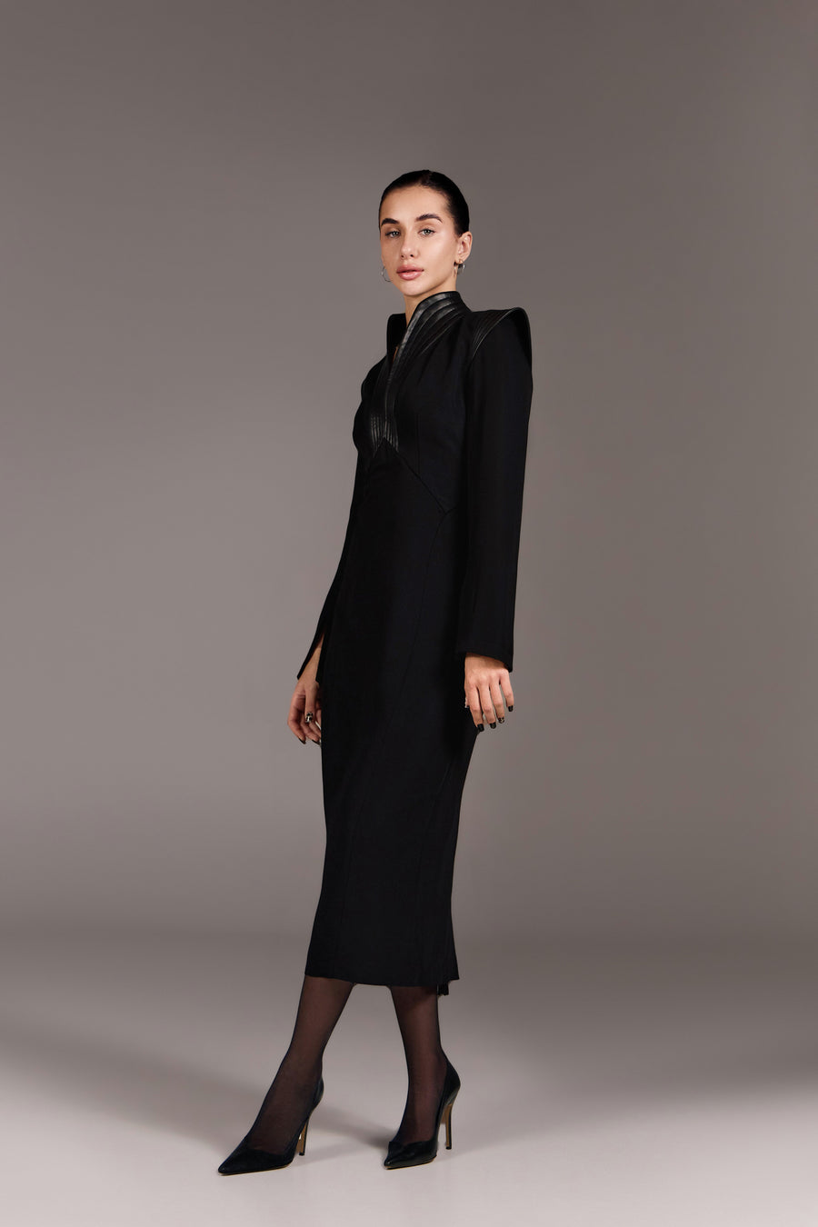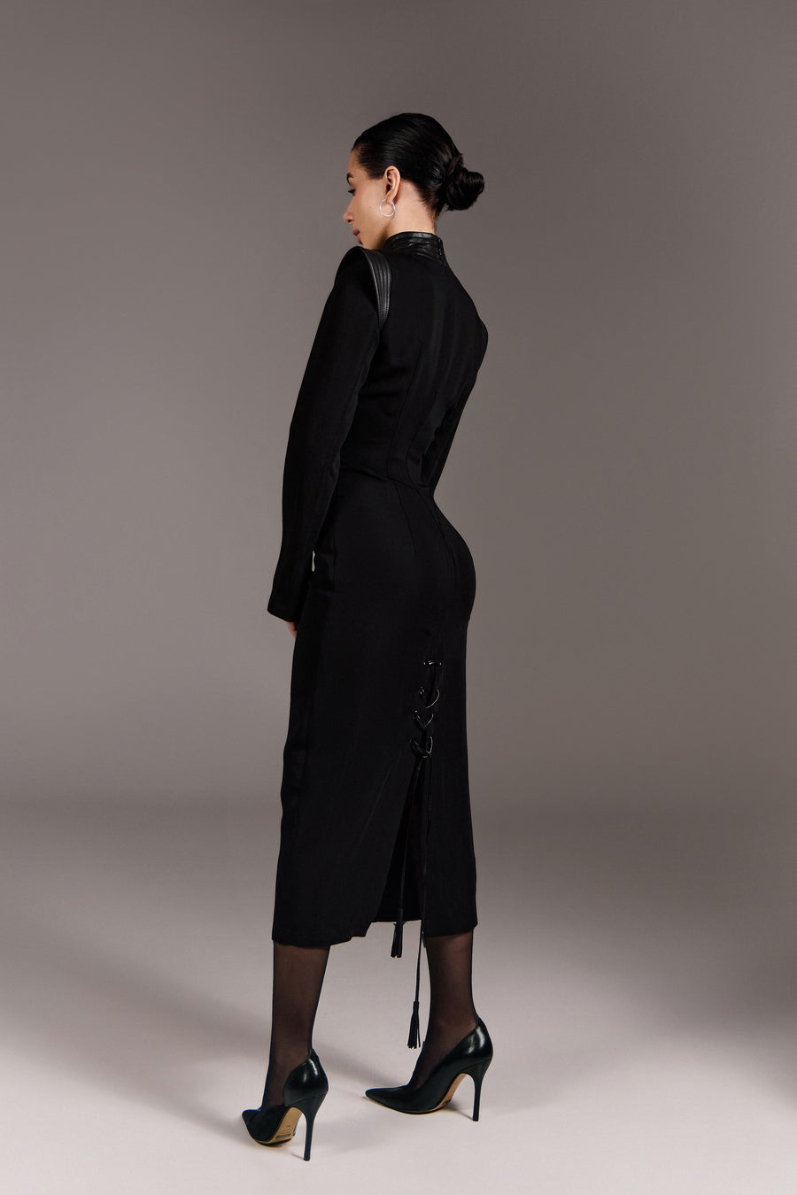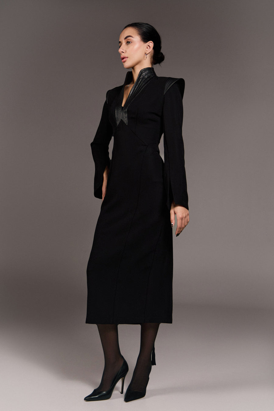 Сукня міді з приталеним силуетом, що м’яко окреслює талію та підкреслює витончену лінію фігури. Високий комір-стійка плавно переходить у V-подібний виріз, створюючи ніжний акцент на декольте. Контрастні вставки з екошкіри вздовж плечей і декольте додають сучасного характеру та текстурної гри. Розрізи на довгих рукавах підкреслюють легкість руху, а висока шліца зі шнурівкою ззаду додає динаміки та завершеності образу. Сукня поєднує грайливу жіночність із чистими формами, створюючи стильний і витончений силует.