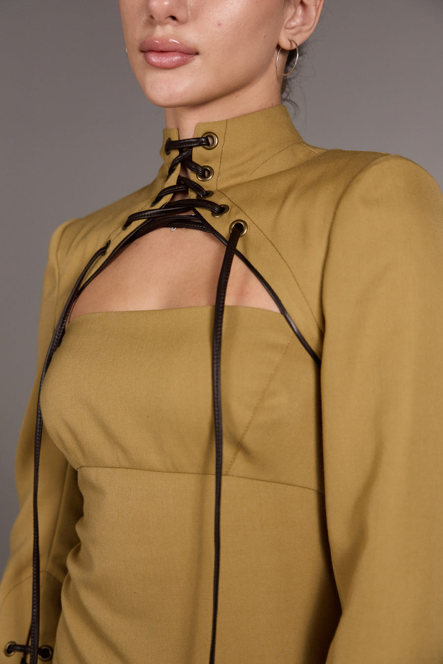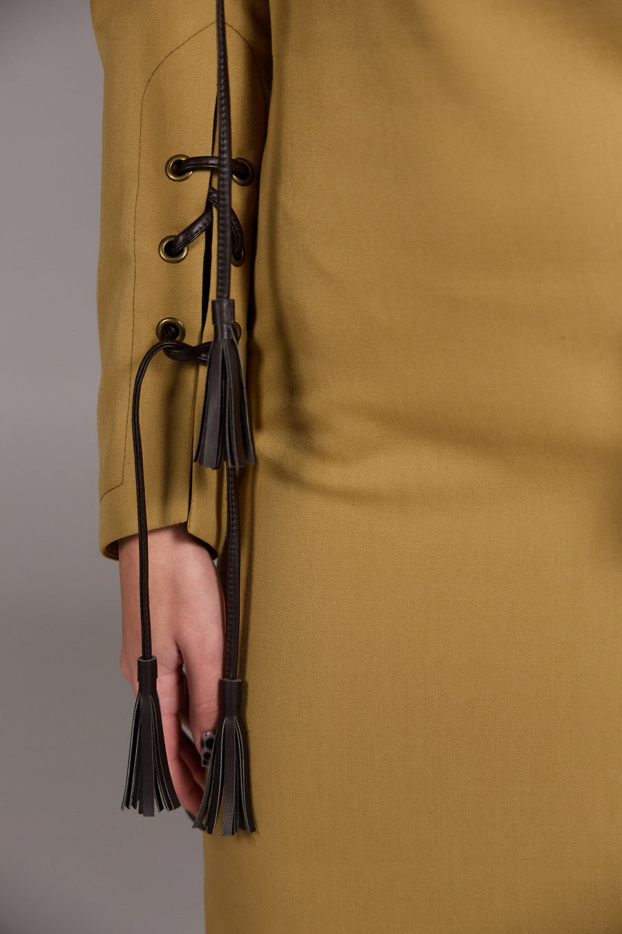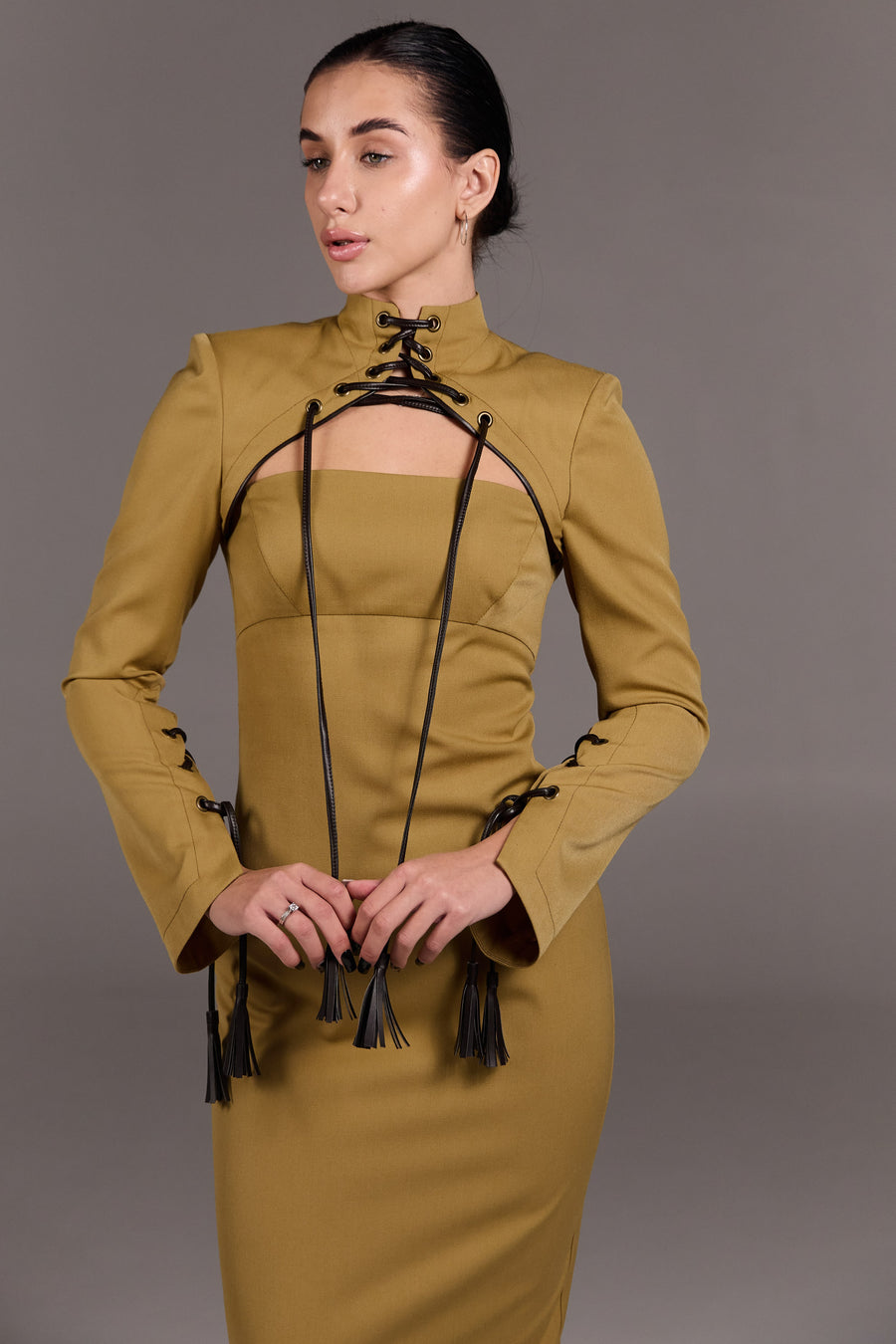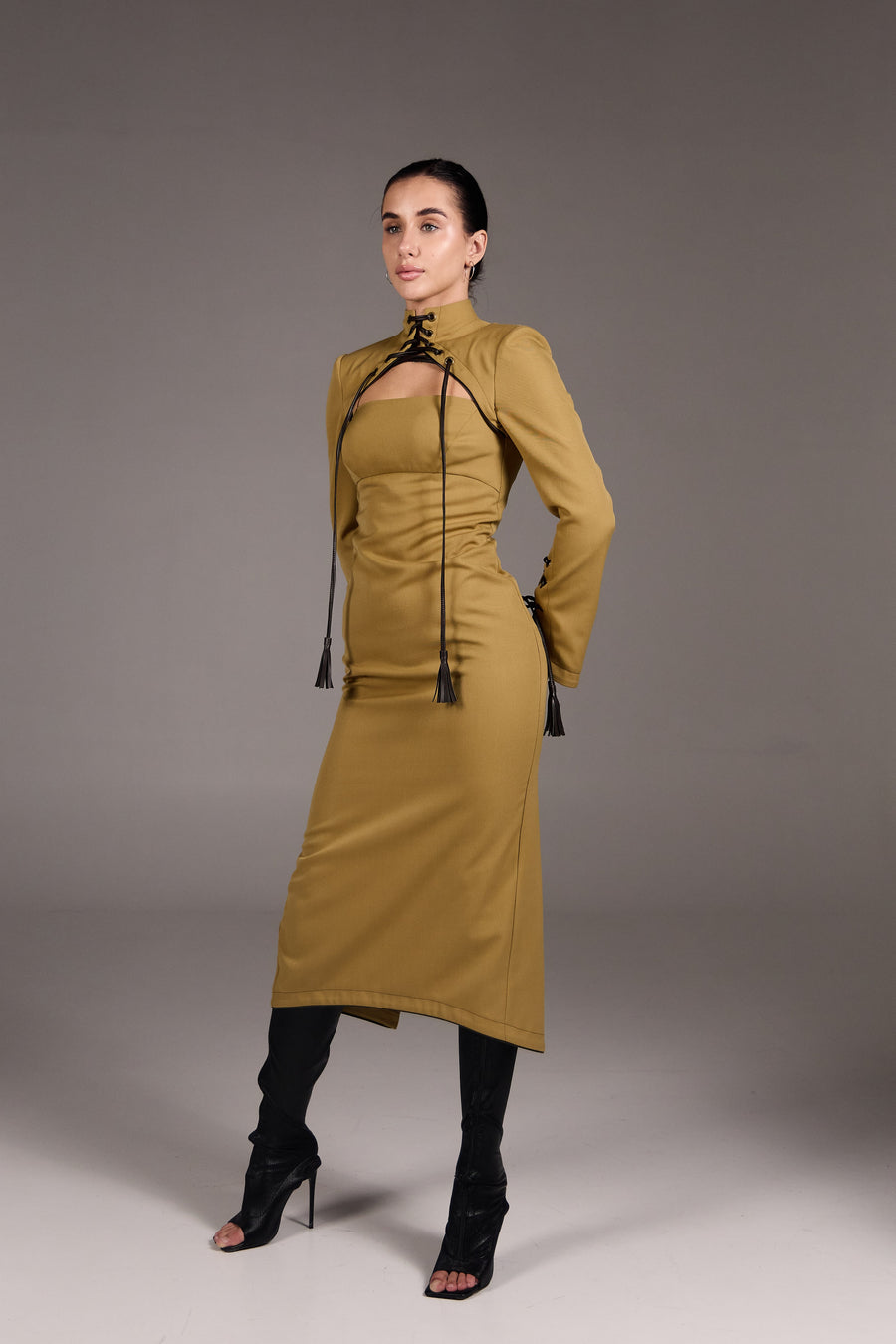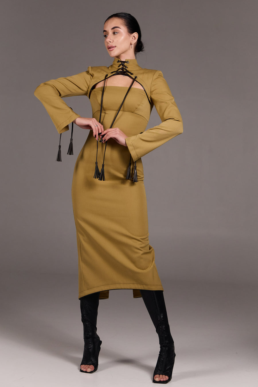 Сукня приталеного силуету довжини міді з корсетною лінією крою, що забезпечує чітку посадку. Архітектурний крій підкреслює фігуру. Висока горловина з декоративною шнурівкою та акцентна зона декольте з геометричним вирізом врівноважує силует і додає образу чуттєвості. Застібка-блискавка по спинці, висока шлиця. Декоративна шнурівка з китицями по горловині та рукавах — ручної роботи з екошкіри. Лаконічна, продумана до деталей — для сучасного гардероба з характером.