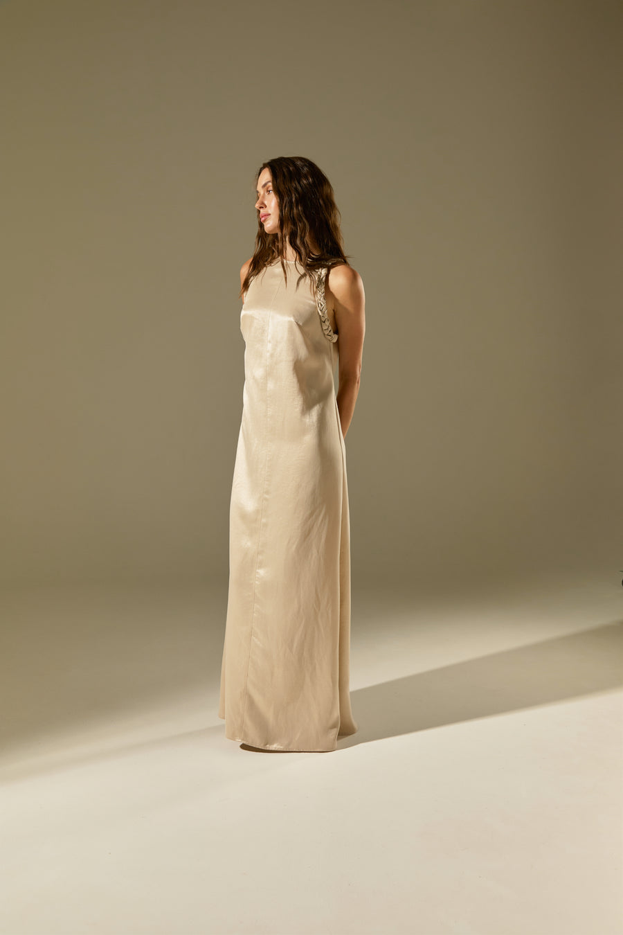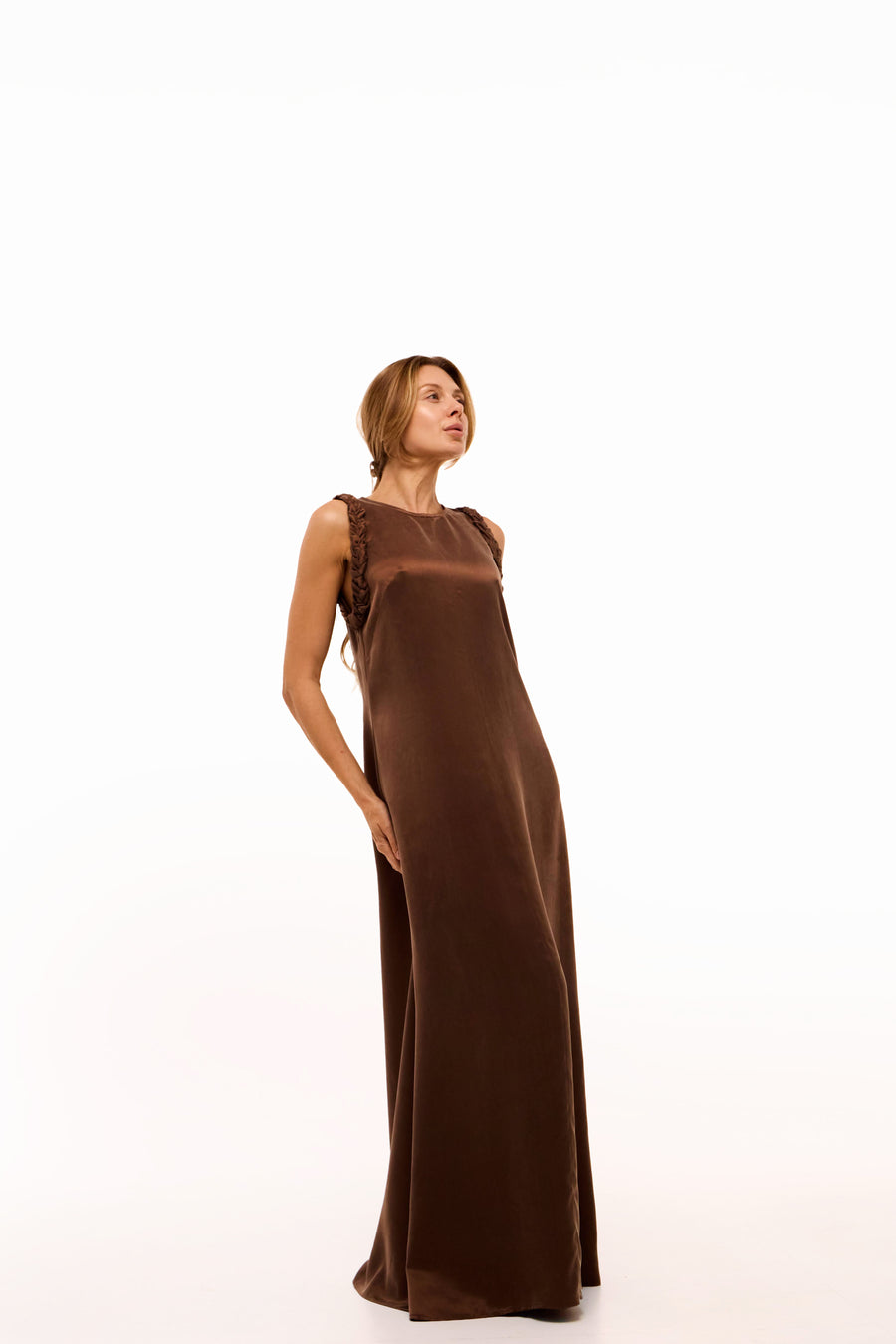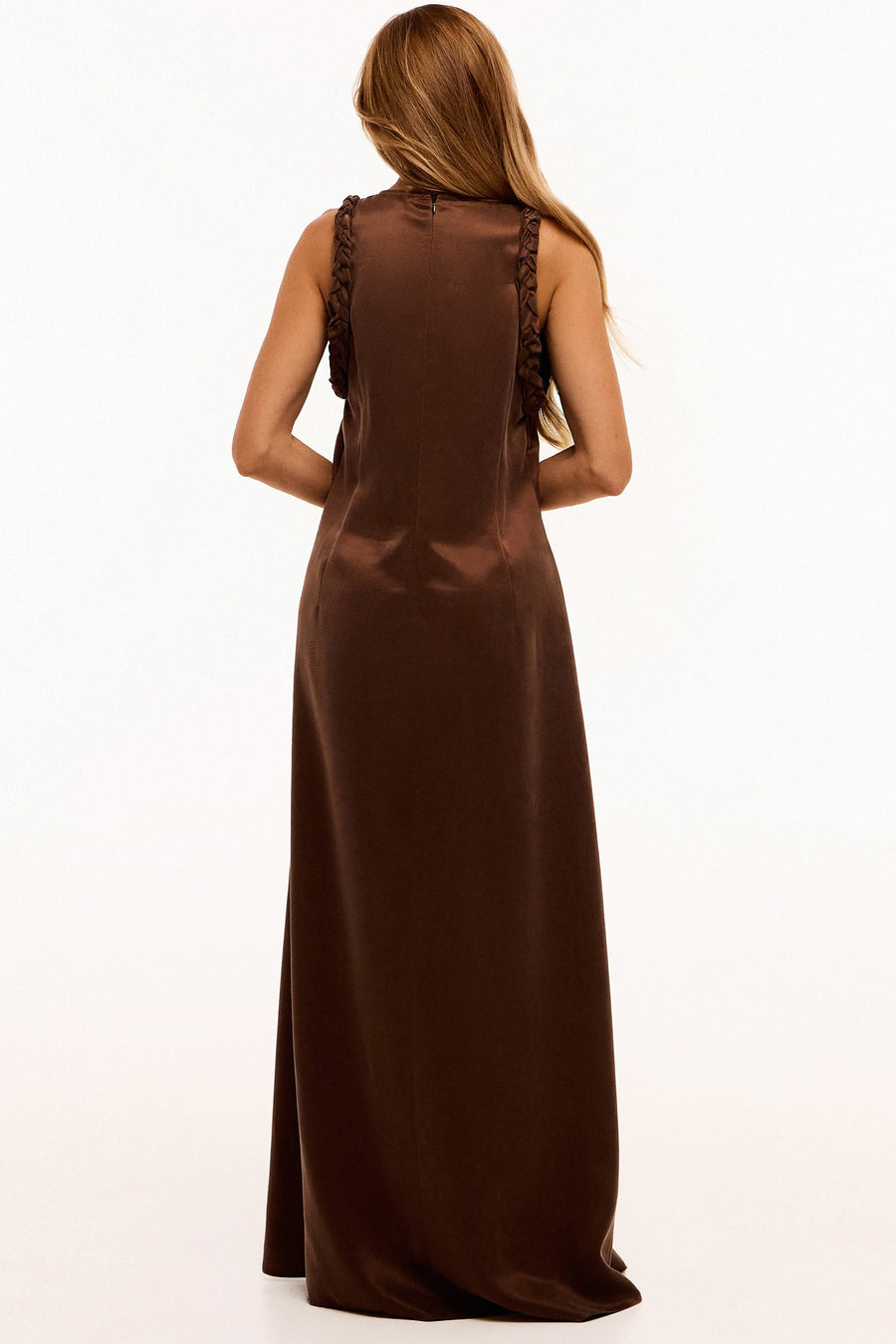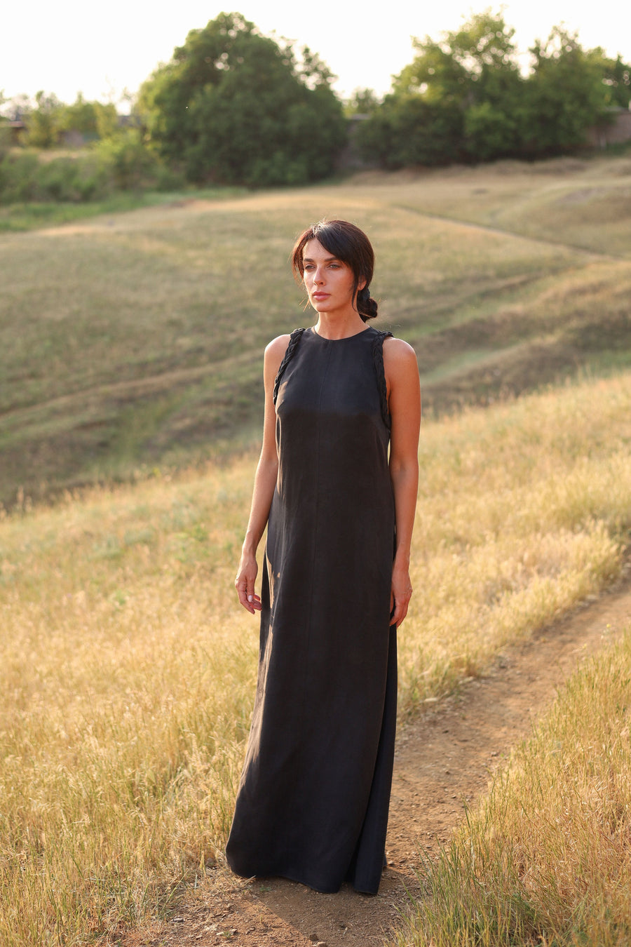 Довга легка віскозна напівприталена сукня з круглим вирізом горловини та швом посередині попереду. Сукня оздоблена декорованими косами по лінії пройми. Довга потаємна застібка-блискавка ззаду.