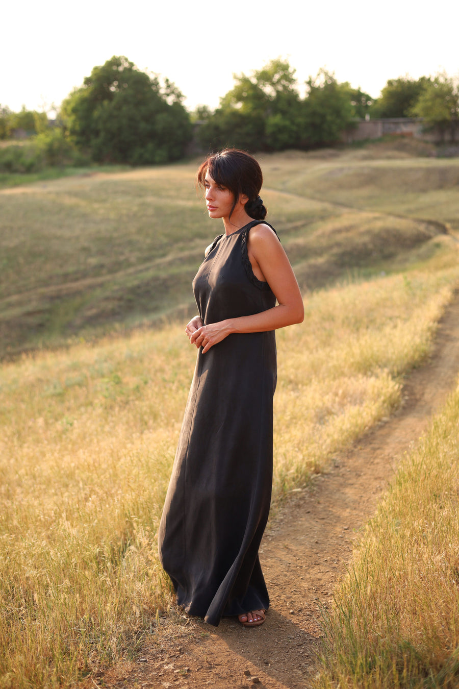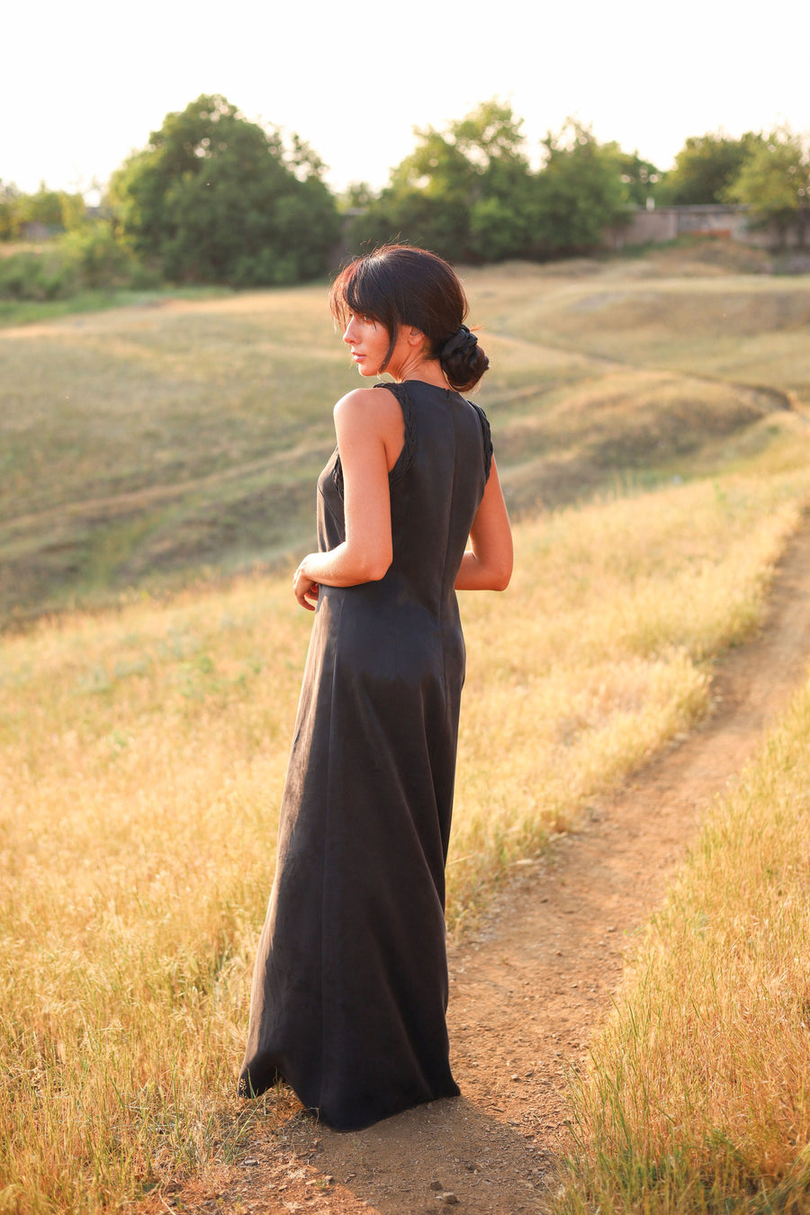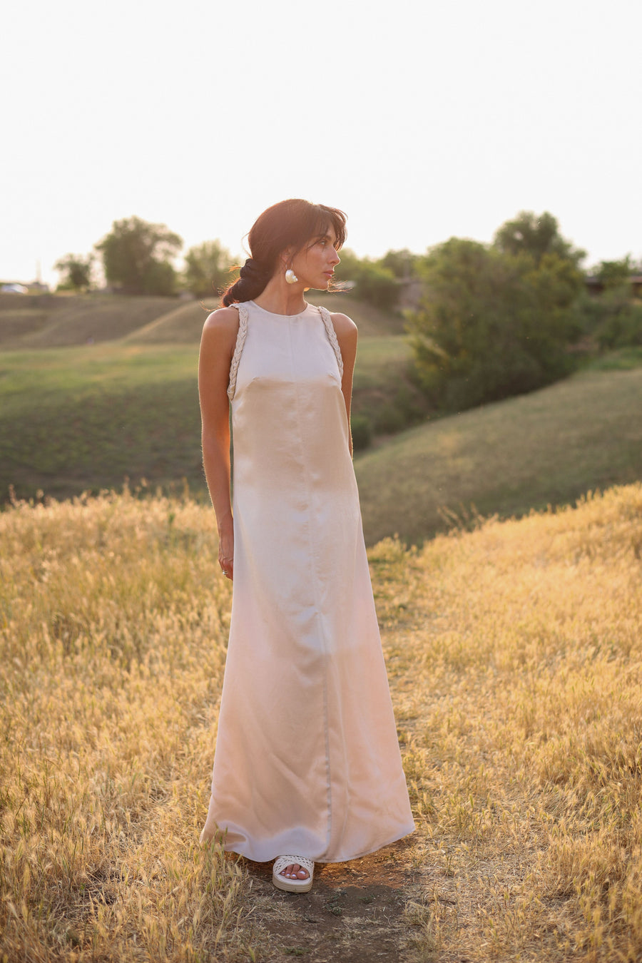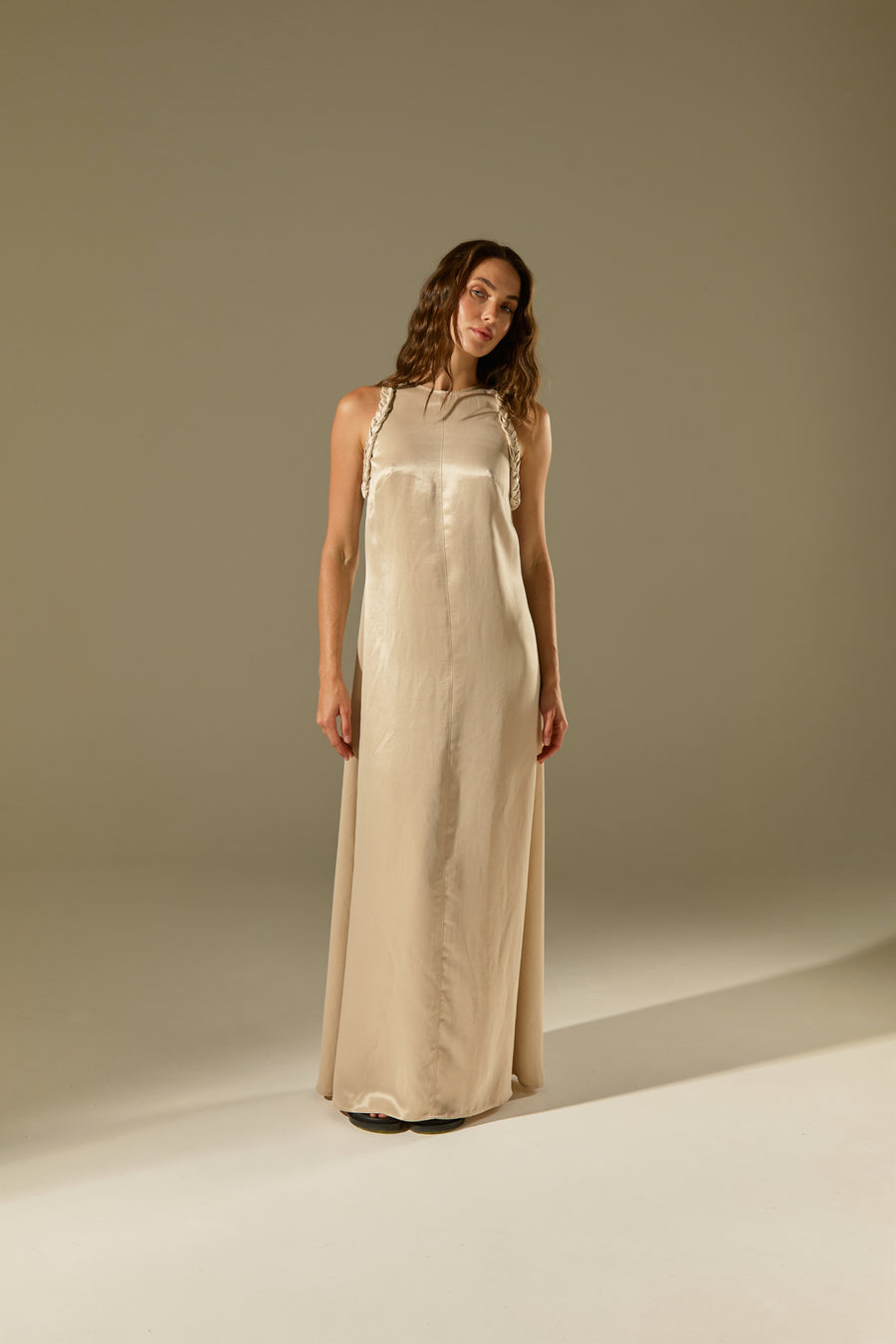 Довга легка віскозна напівприталена сукня з круглим вирізом горловини та швом посередині попереду. Сукня оздоблена декорованими косами по лінії пройми. Довга потаємна застібка-блискавка ззаду.