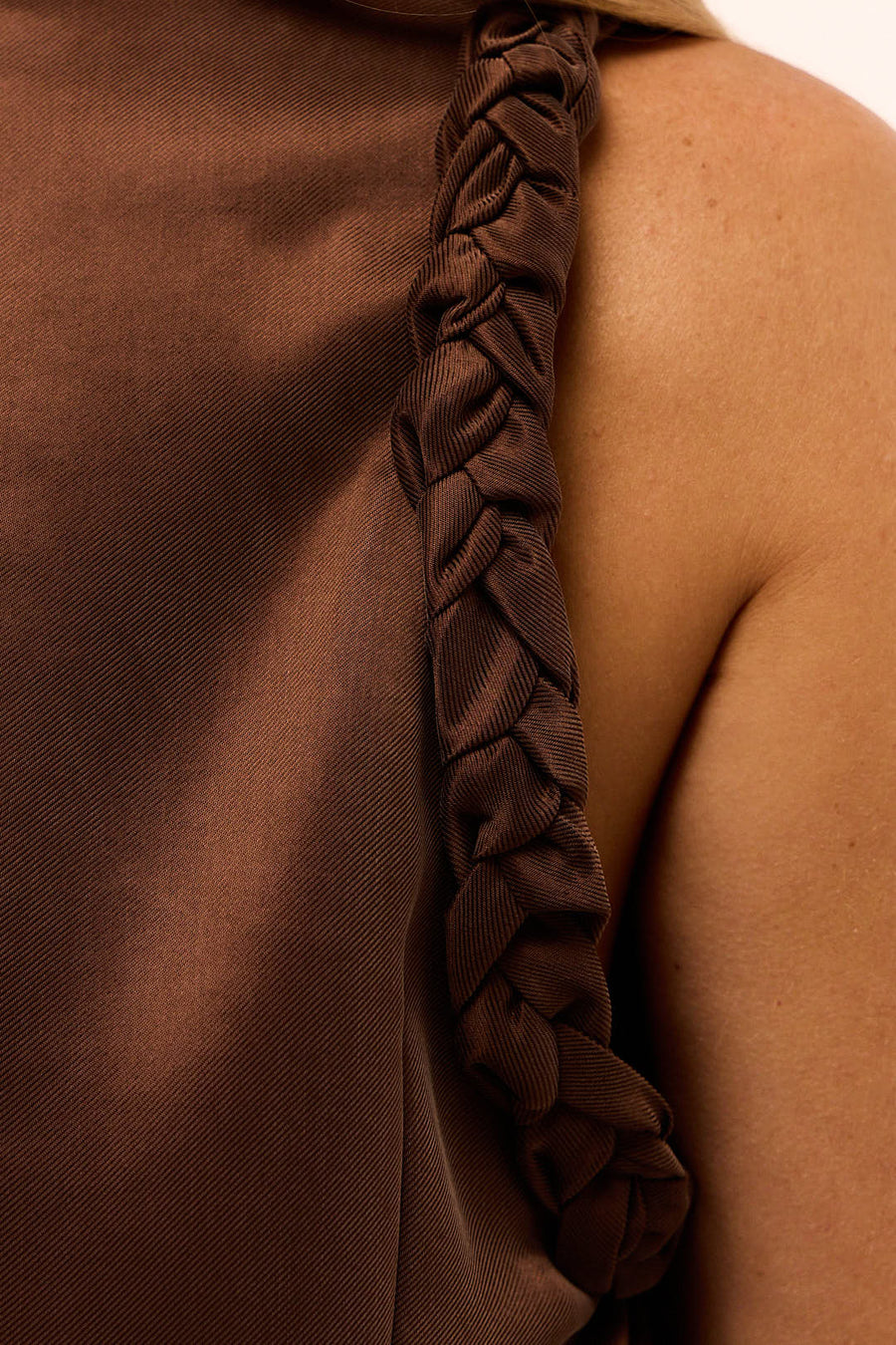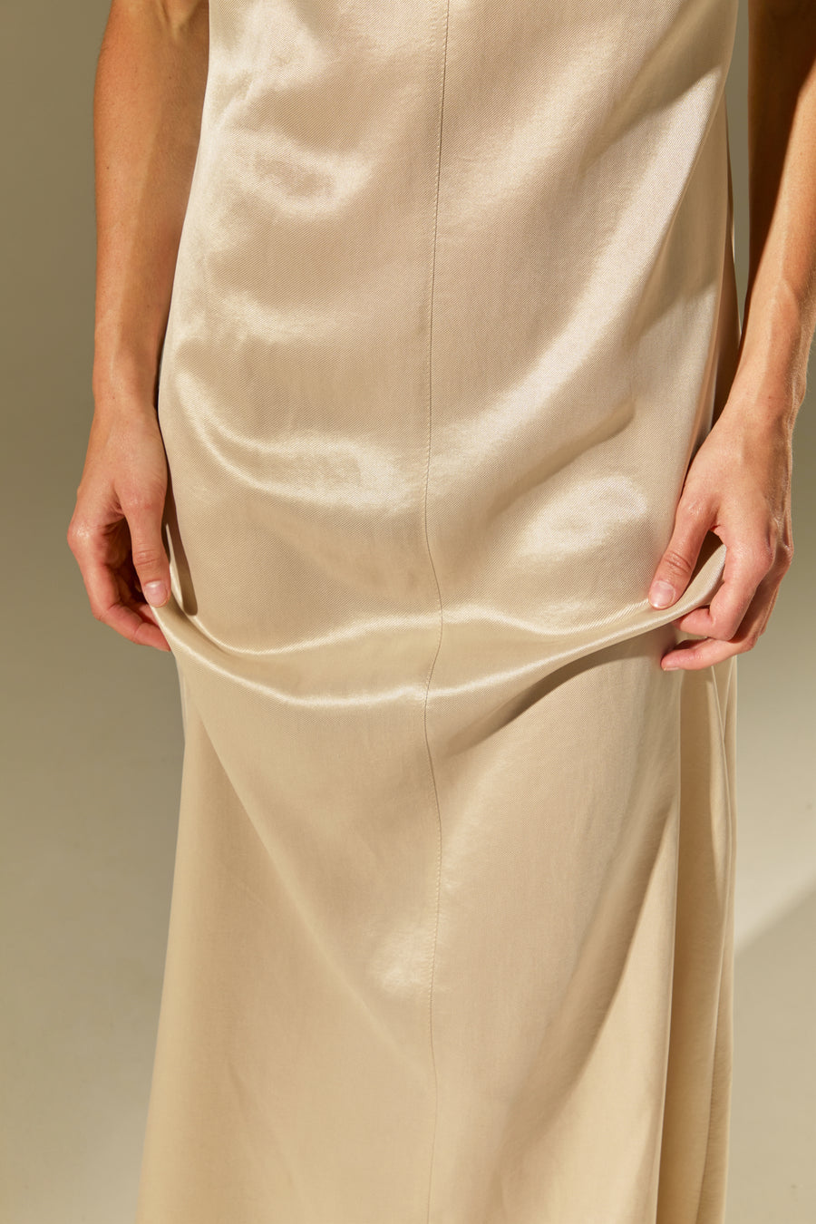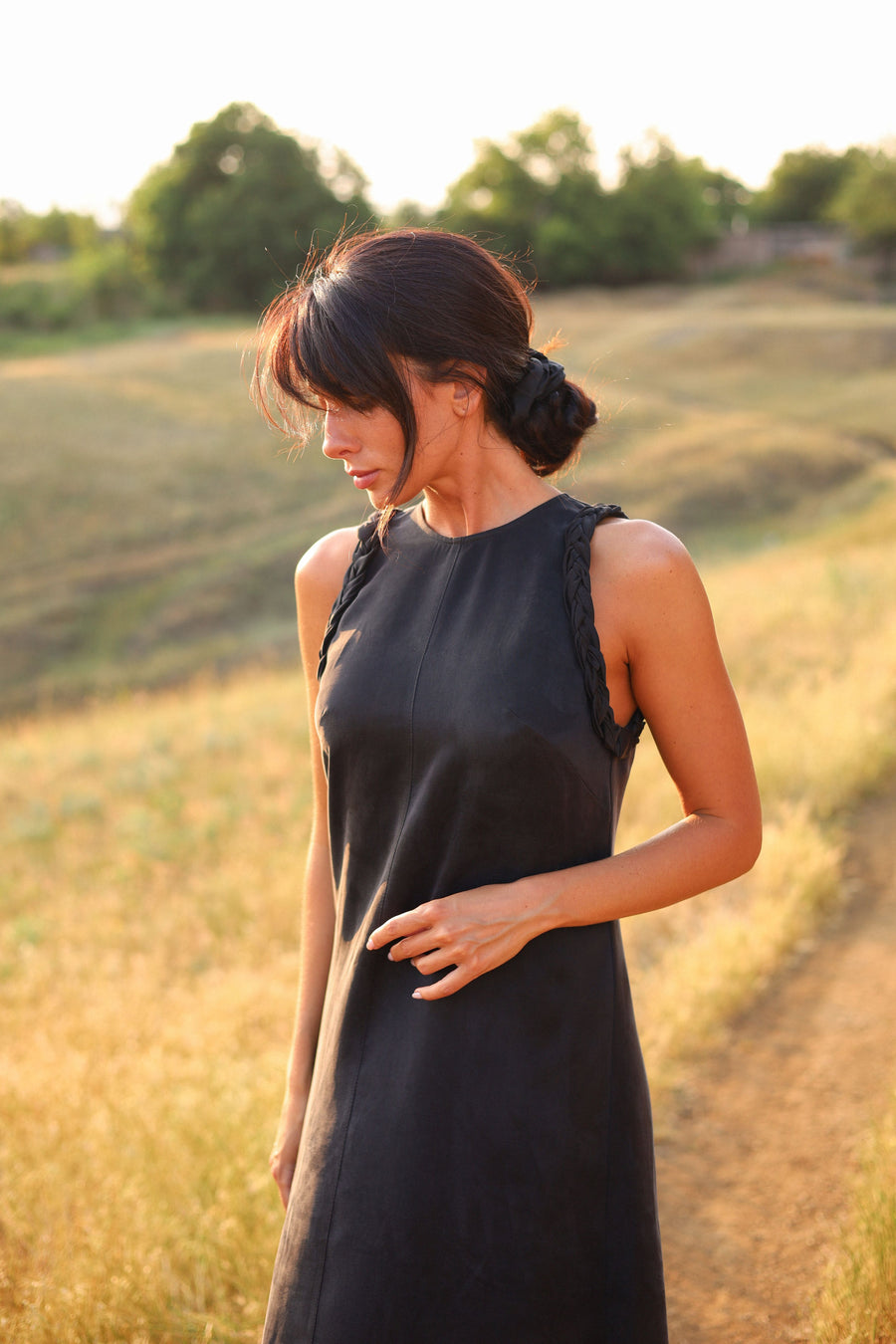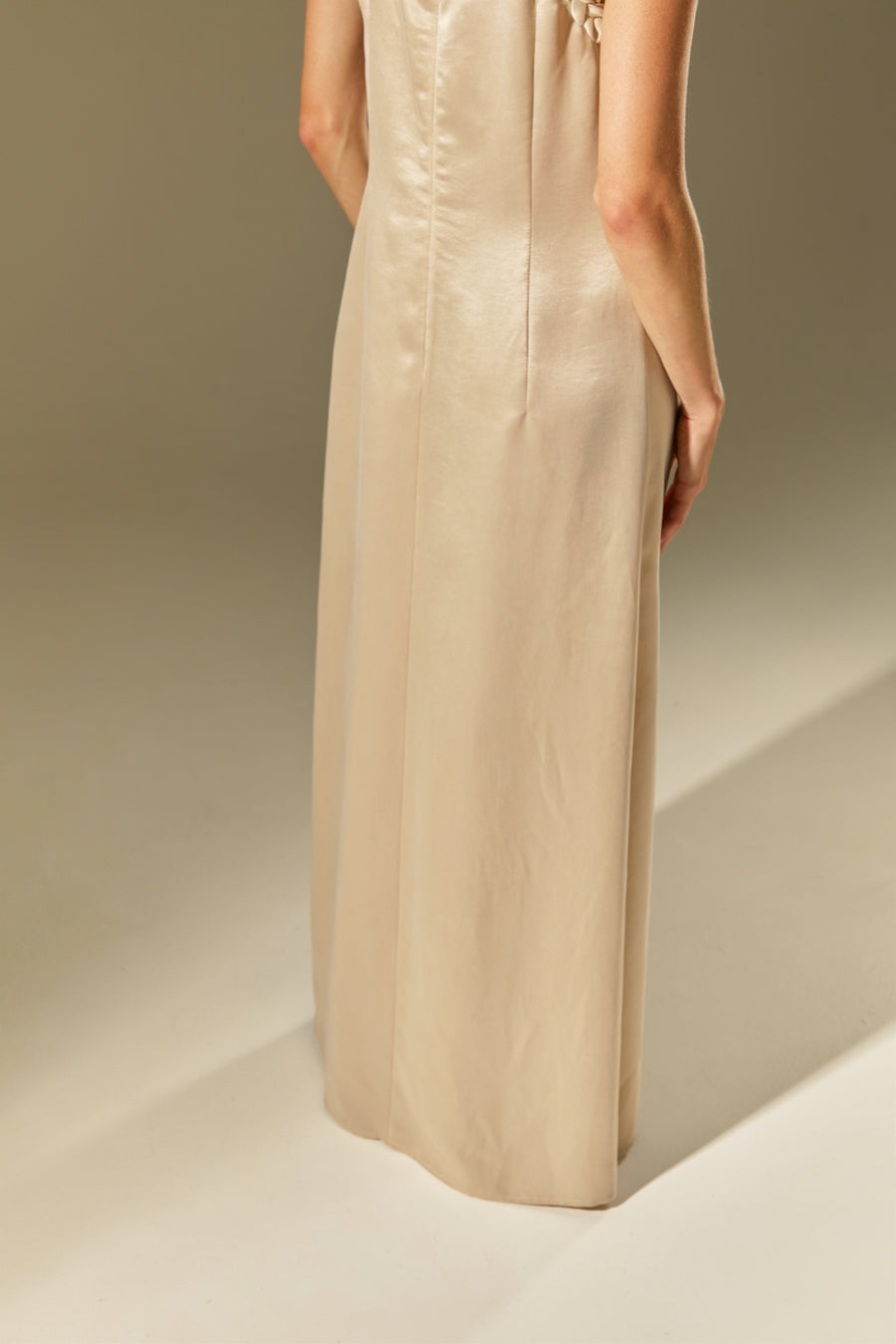 Довга легка віскозна напівприталена сукня з круглим вирізом горловини та швом посередині попереду. Сукня оздоблена декорованими косами по лінії пройми. Довга потаємна застібка-блискавка ззаду.