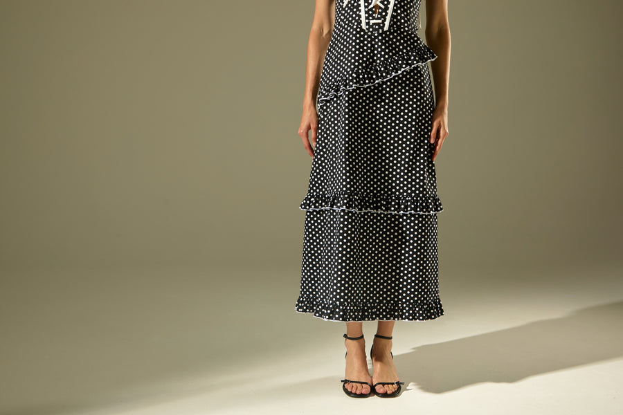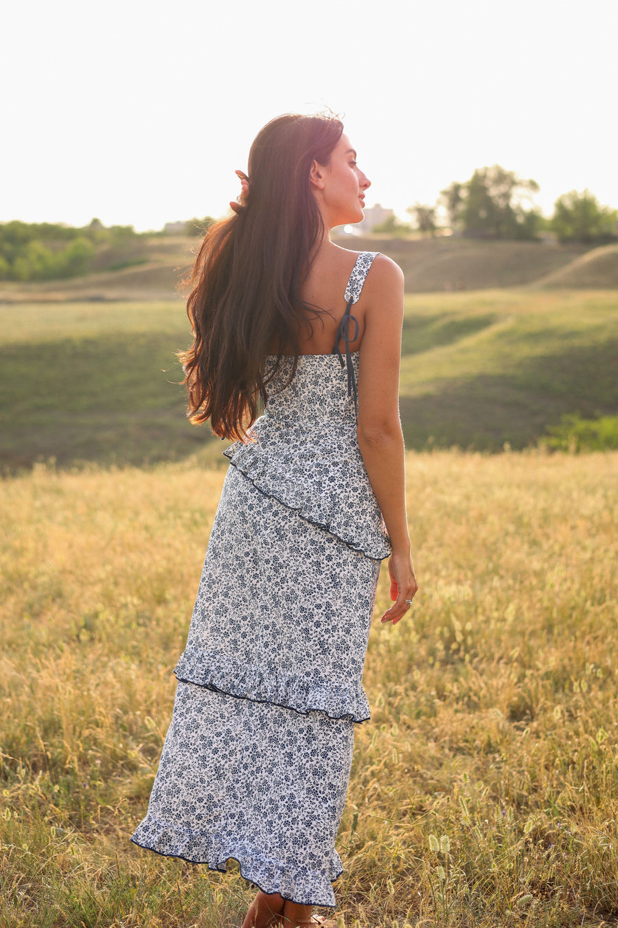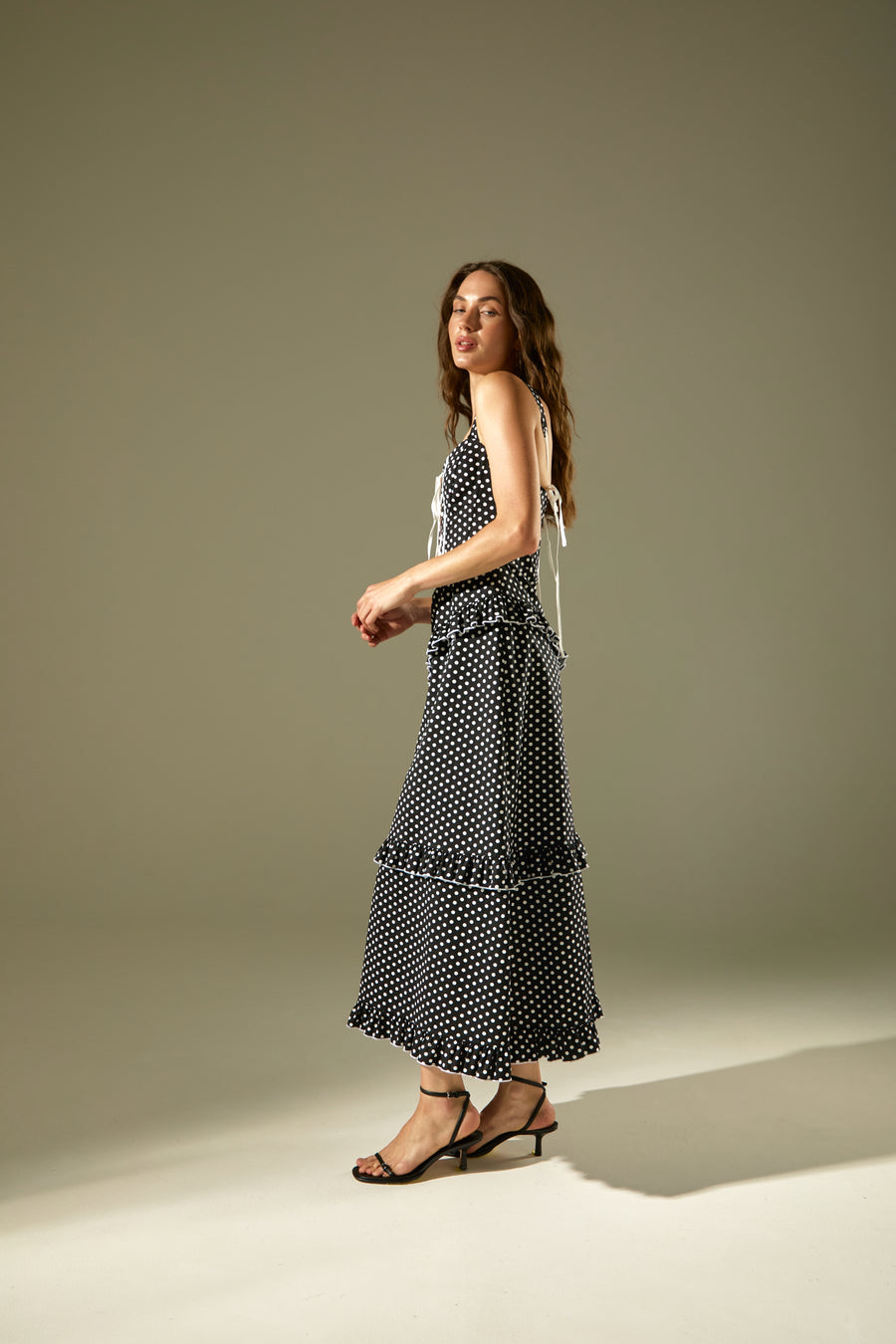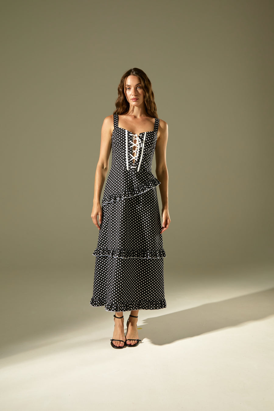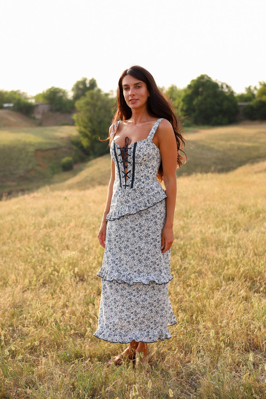 Бавовняна принтована сукня-сарафан з корсетним верхом на лляній контрастній шнурівці попереду, фігурно відрізана по лінії талії. Сукня декорована декількома воланами. Бретелі ззаду регулюються. Для зручності довга потаємна застібка–блискавка.
