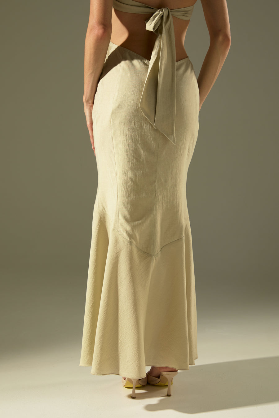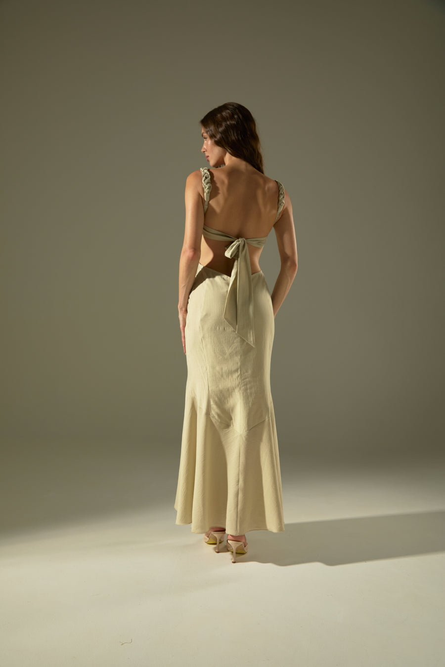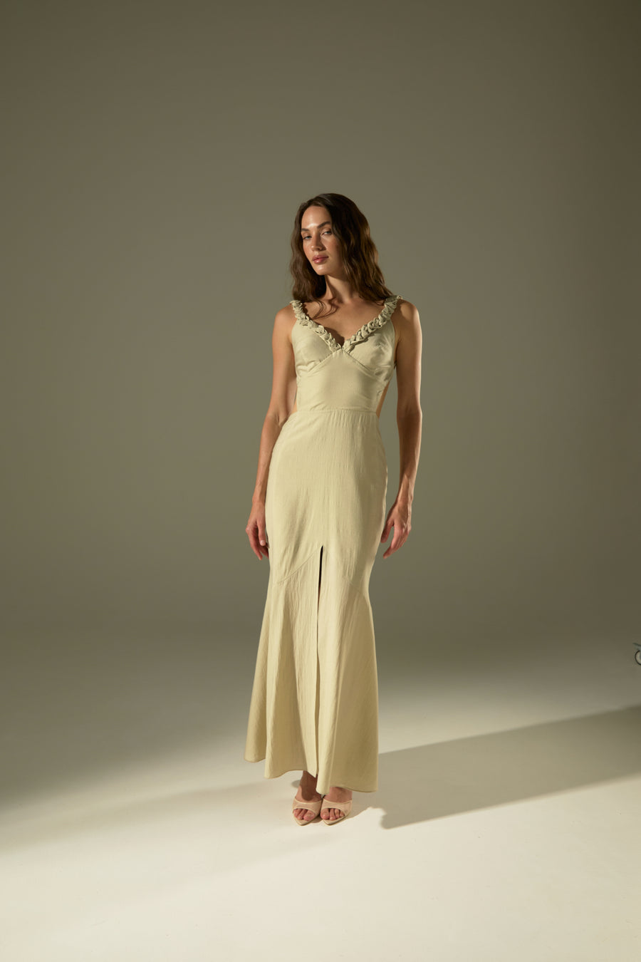 Відкрита довга сукня з фактурної легкої бавовняної тканини на тонких регульованих бретелях, з декорованими косами по лінії декольте. Сукня з витонченими акцентними бічними прозорими рельєфами. Відрізний волан з розрізом попереду.