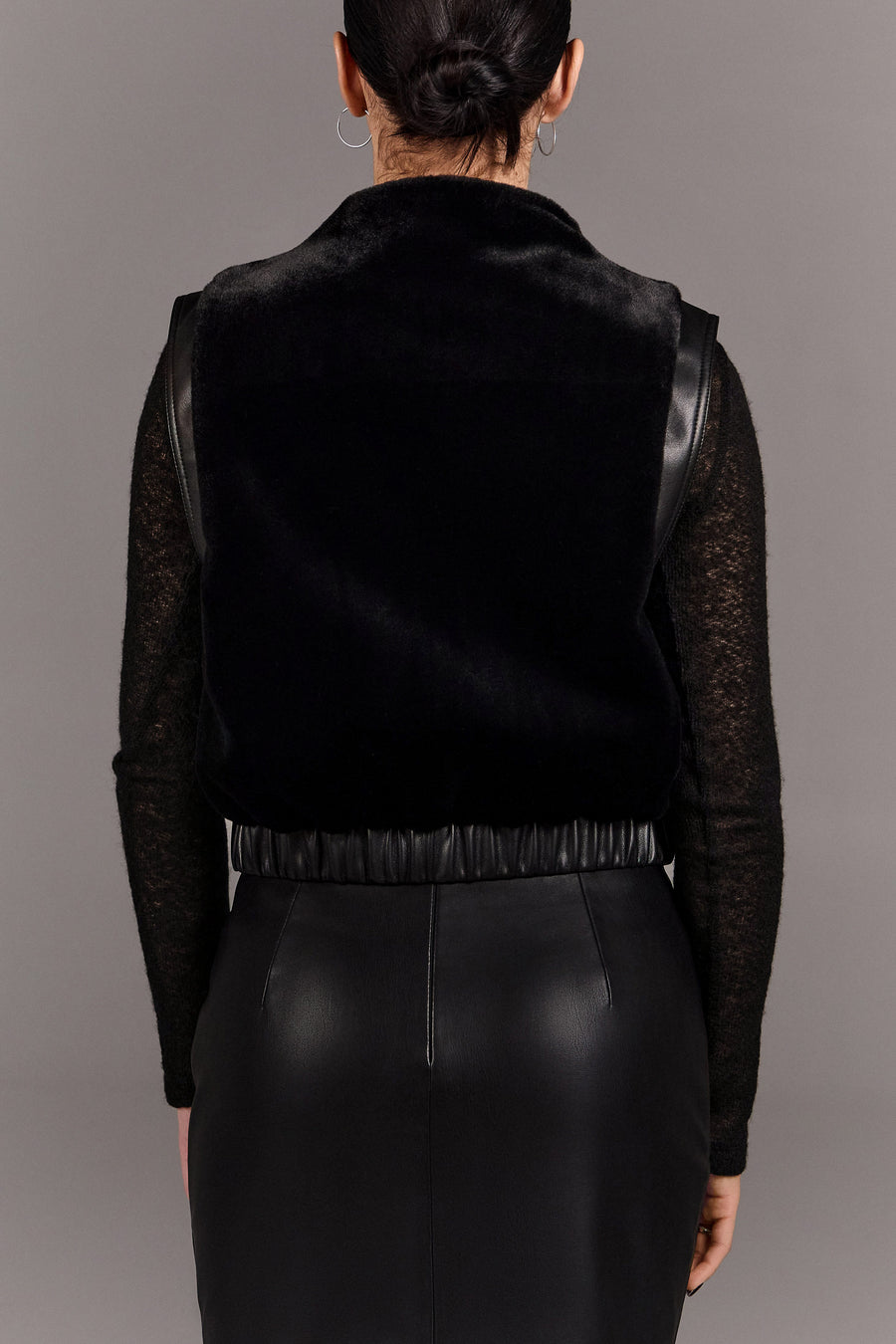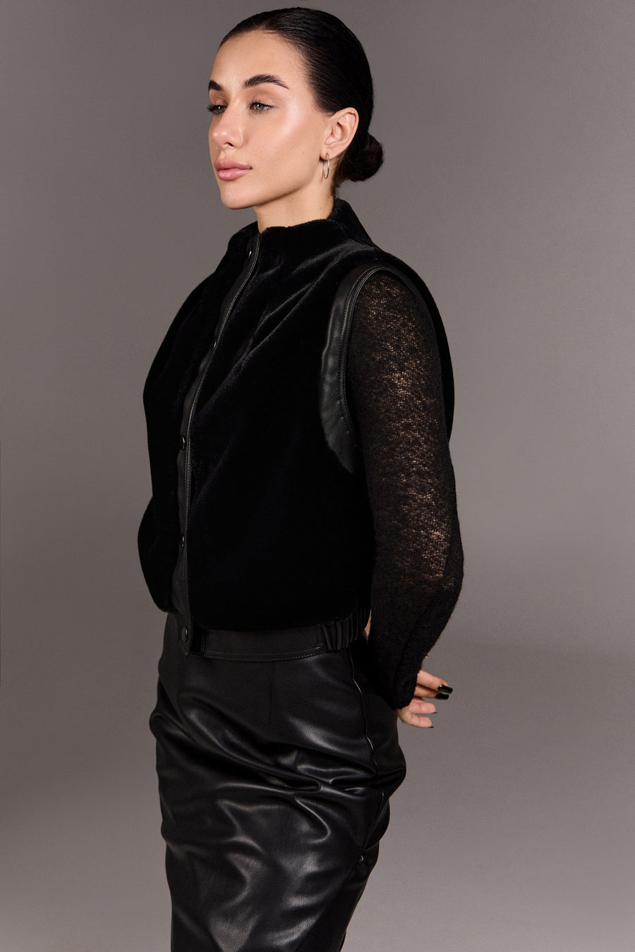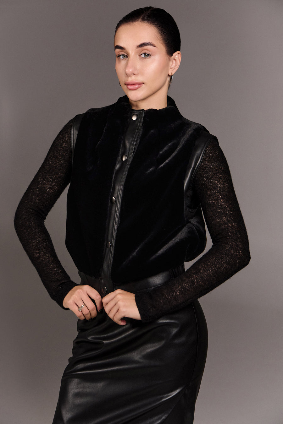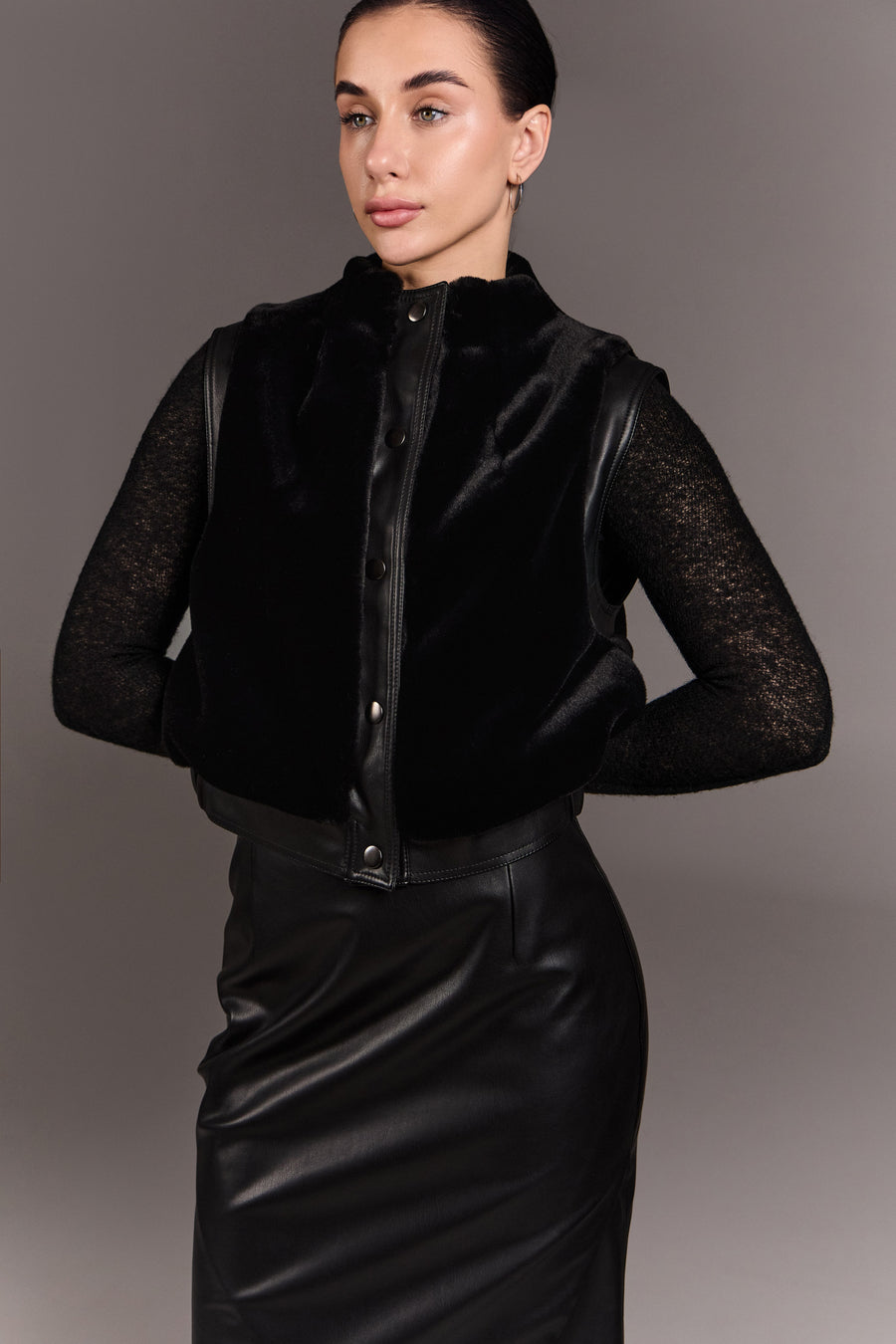 Архітектурний жилет зі штучного хутра з м’яким об’ємом і чіткими лініями. Екошкіряні акценти та металеві кнопки додають графічності, а комір-стійка — впевненого настрою. Виконаний на підкладі, він легко стає стильним акцентом образу з характером.