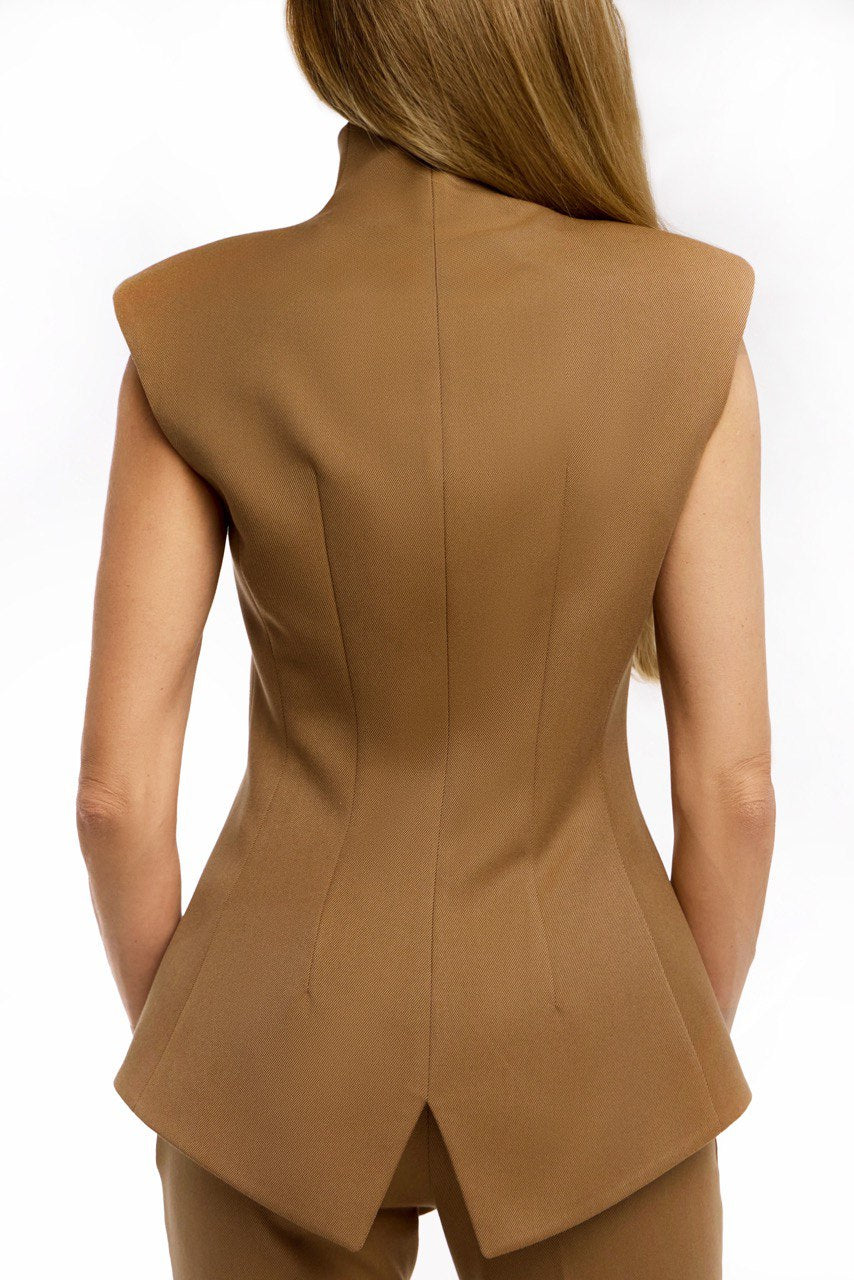 Жилет витонченого крою з акцентними плечима, плавно окреслює лінію бедра формуючи сучасний, скульптурний силует. Фігурний розріз на спинці додає образу легкості та динаміки, підкреслюючи природну пластику руху